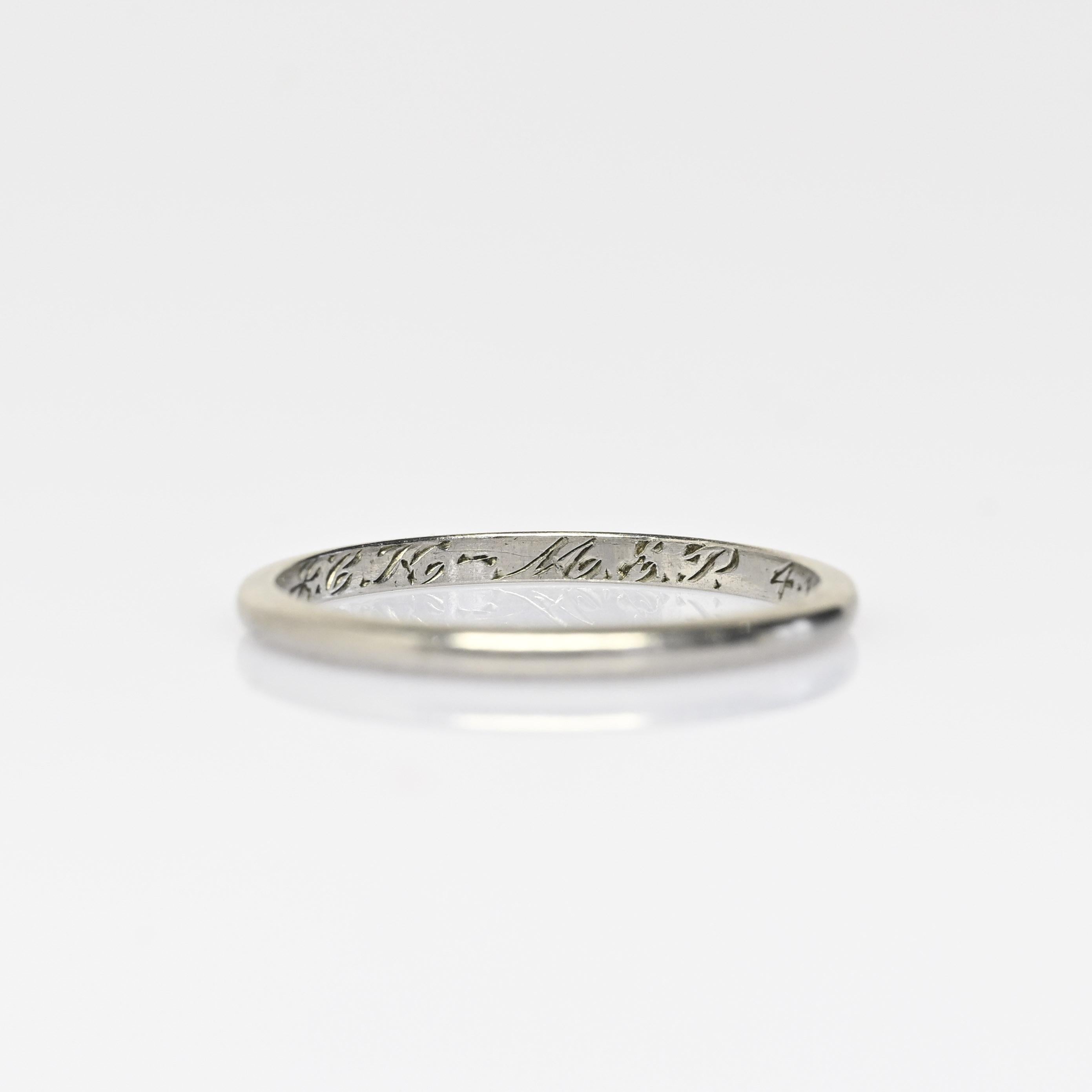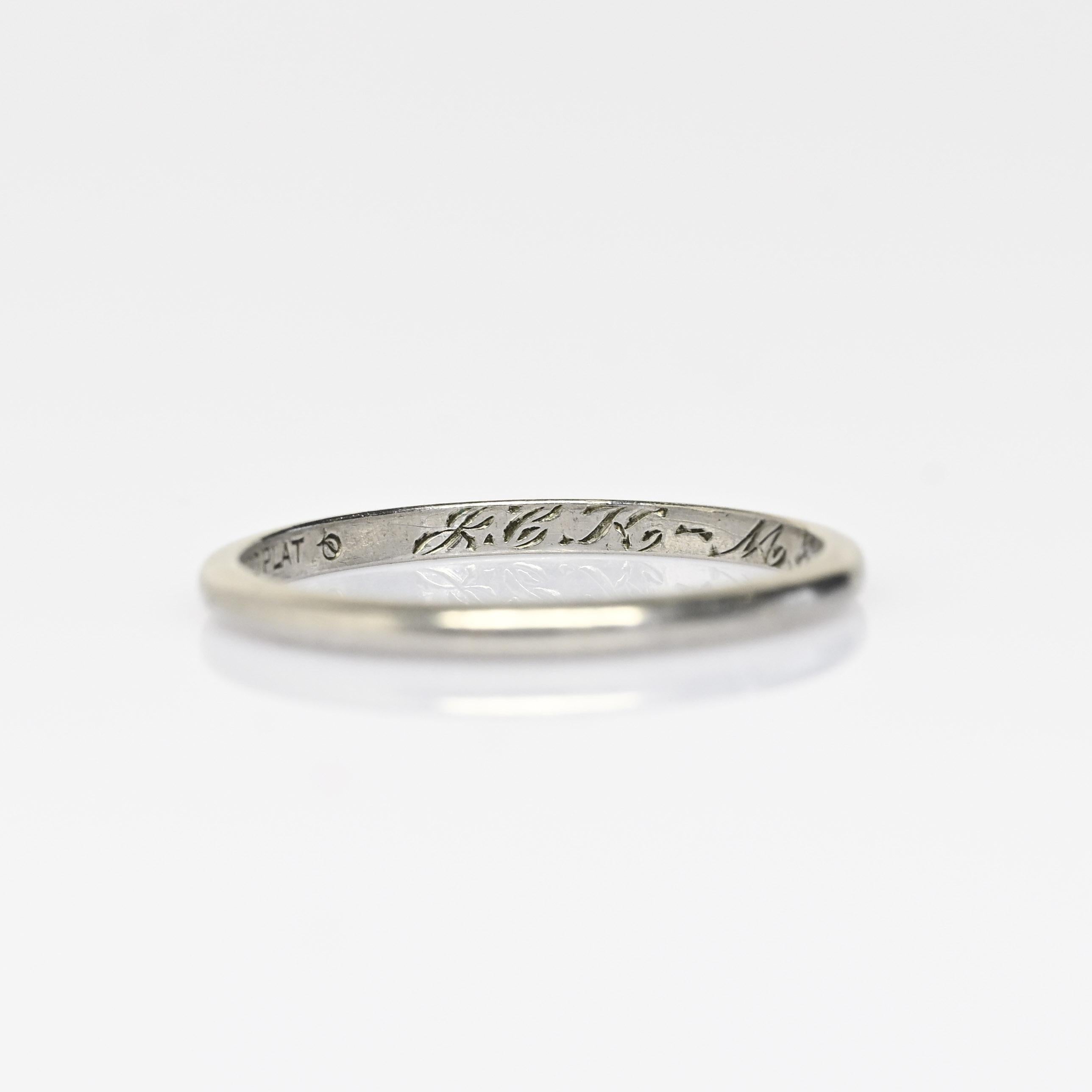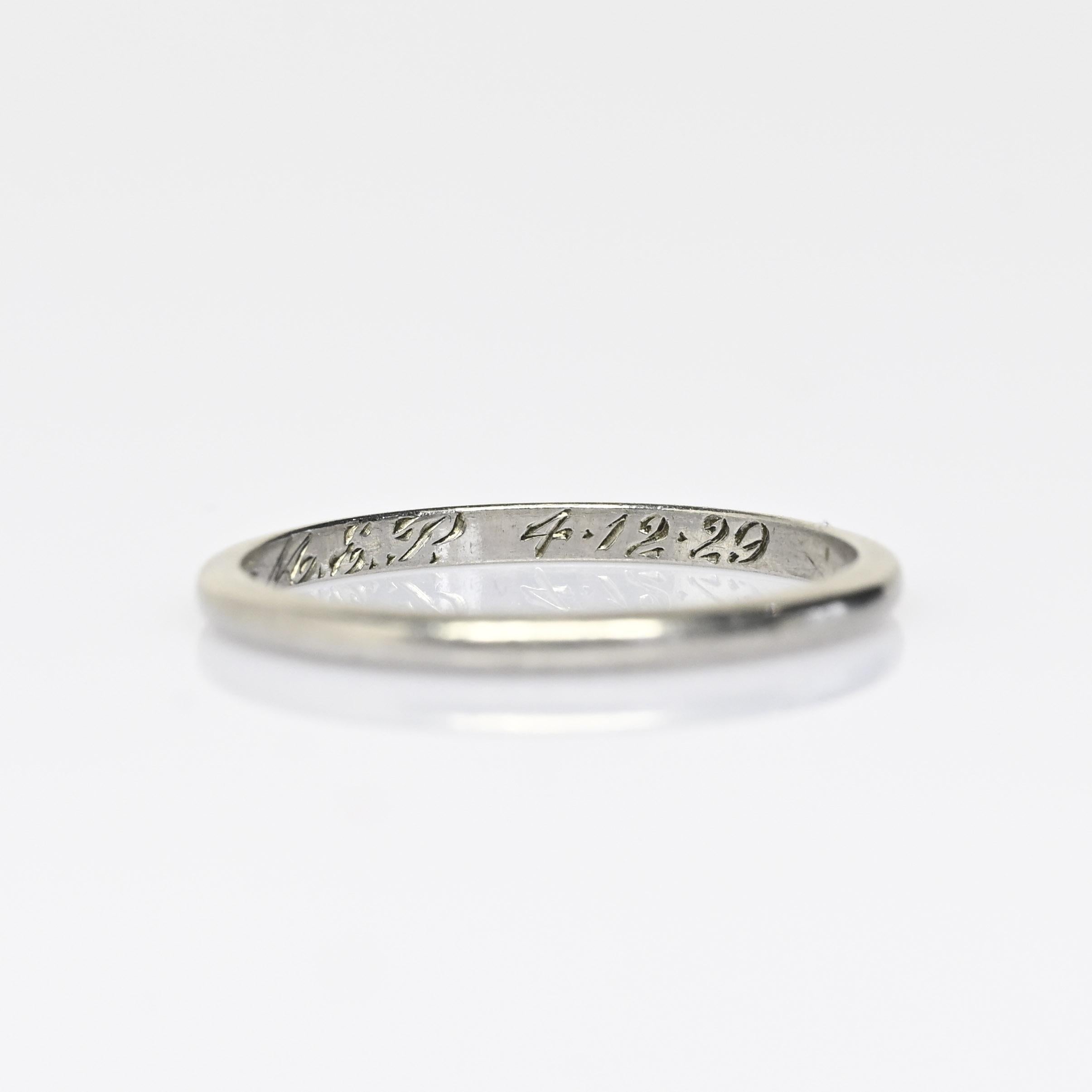 This authentic antique Art Deco wedding band is crafted in solid platinum and dated 1929, capturing the elegance and precision of the era. The clean lines and subtle detailing reflect the refined geometric style that defined late-1920s Deco design. Platinum’s enduring strength and cool luster make this band ideal for everyday wear nearly a century later. A meaningful heirloom piece, this vintage dated band is perfect as a wedding ring, anniversary band, or collectible slice of Art Deco history.
