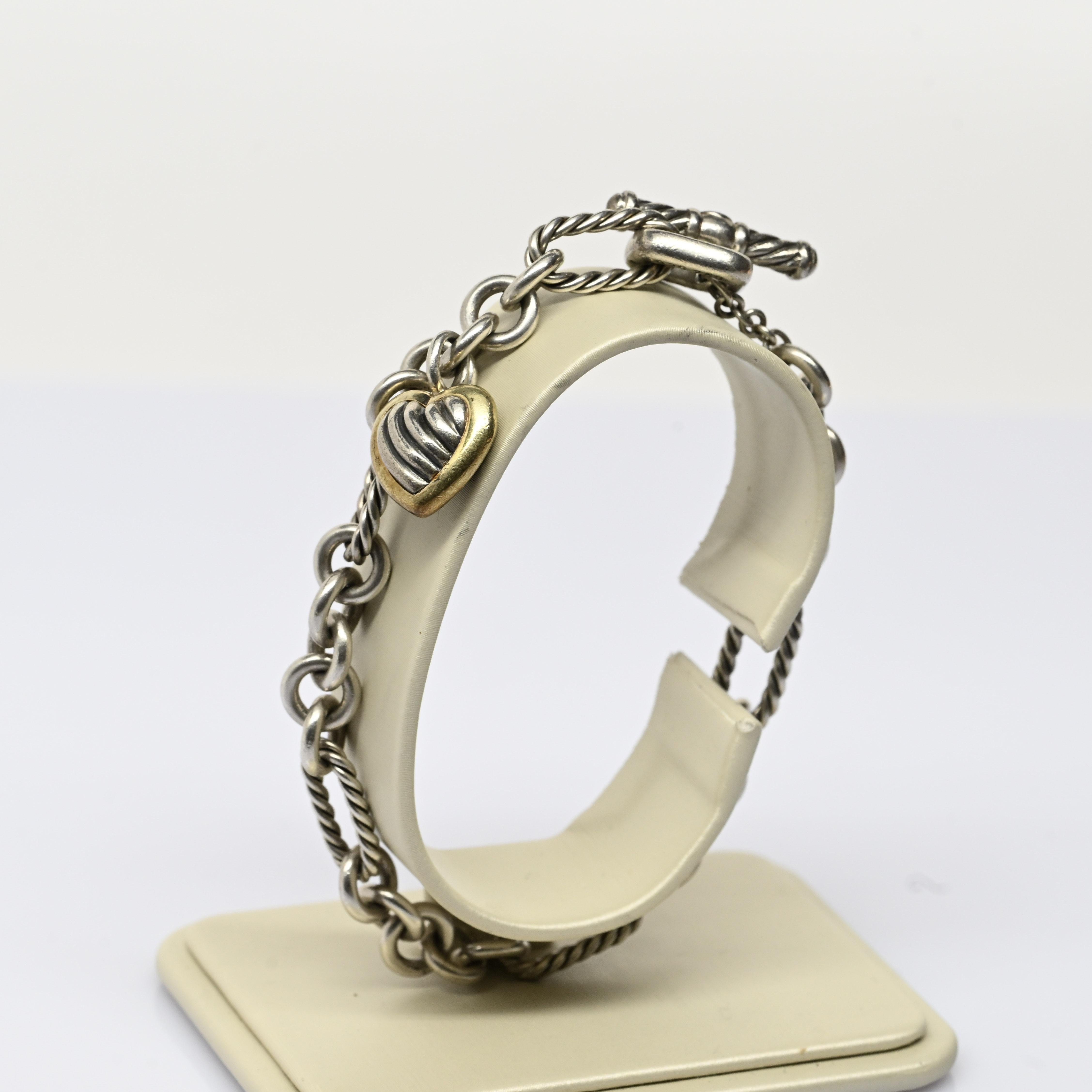 This David Yurman heart charm bracelet beautifully blends iconic design with timeless elegance. Crafted in sterling silver, the signature cable links add dimension and texture, perfectly complemented by an 18K yellow gold heart charm featuring Yurman’s classic sculpted detailing. The mixed-metal look makes it effortless to pair with both silver and gold jewelry. Finished with a secure toggle clasp, it’s a chic and meaningful piece that transitions seamlessly from everyday wear to special occasions.