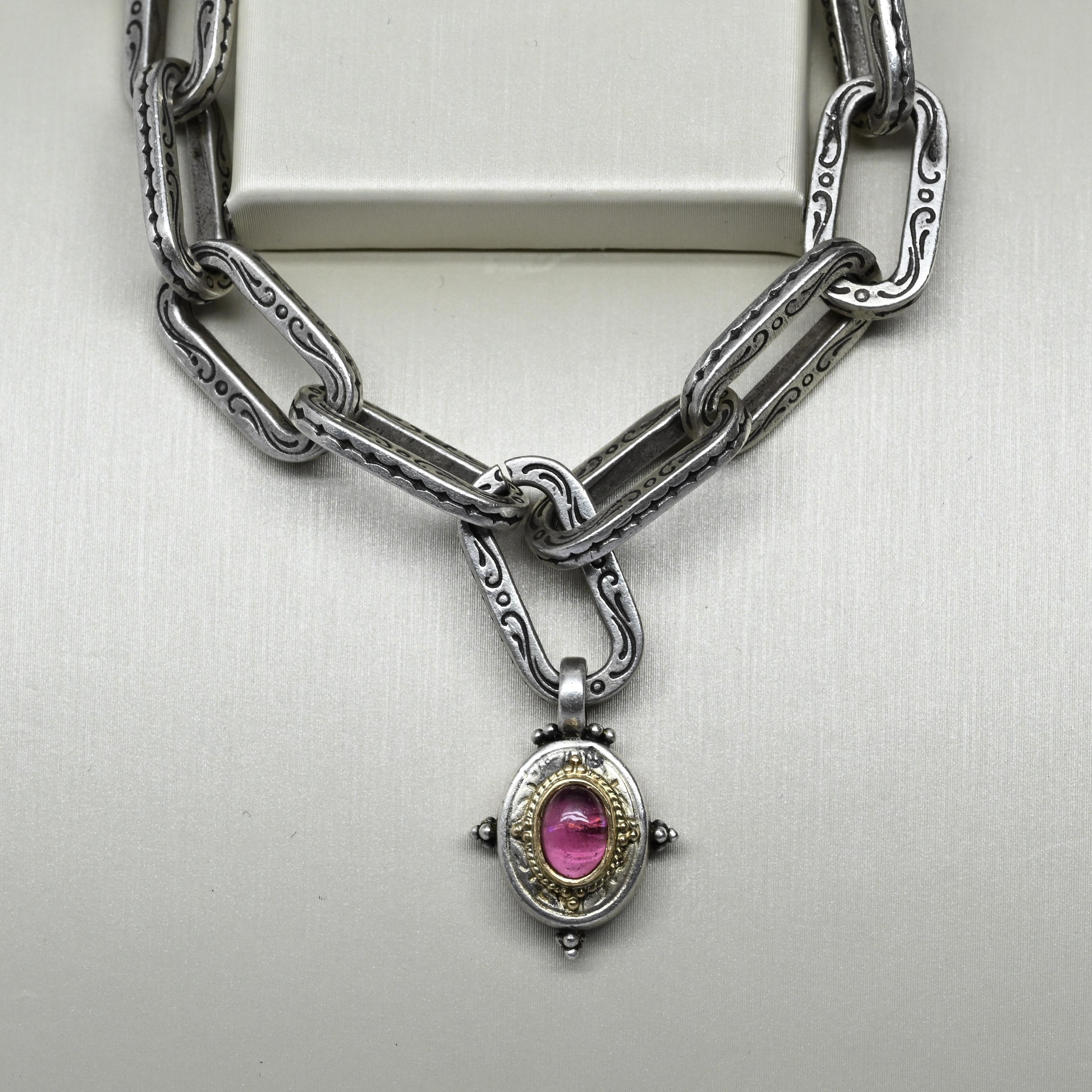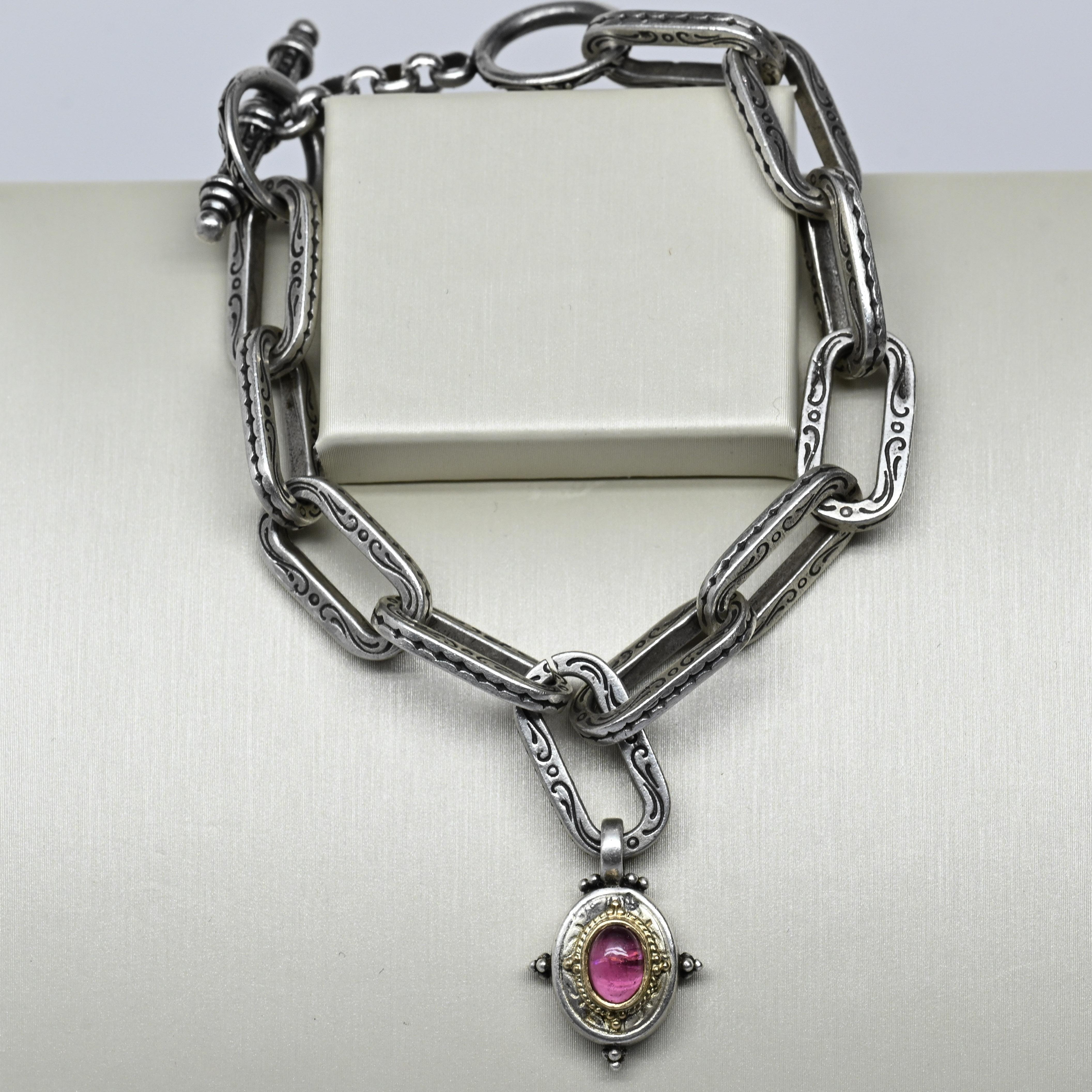 This striking Konstantino toggle bracelet showcases the brand’s signature craftsmanship with bold sterling silver links adorned in intricate, hand-etched detailing. At its center hangs a stunning pink tourmaline cabochon, framed in warm 18k gold that adds a beautiful contrast and regal touch. The ornate toggle clasp enhances the bracelet’s old-world elegance while ensuring secure wear. Artistic, luxurious, and unmistakably Konstantino, this piece brings elevated character to any jewelry collection.