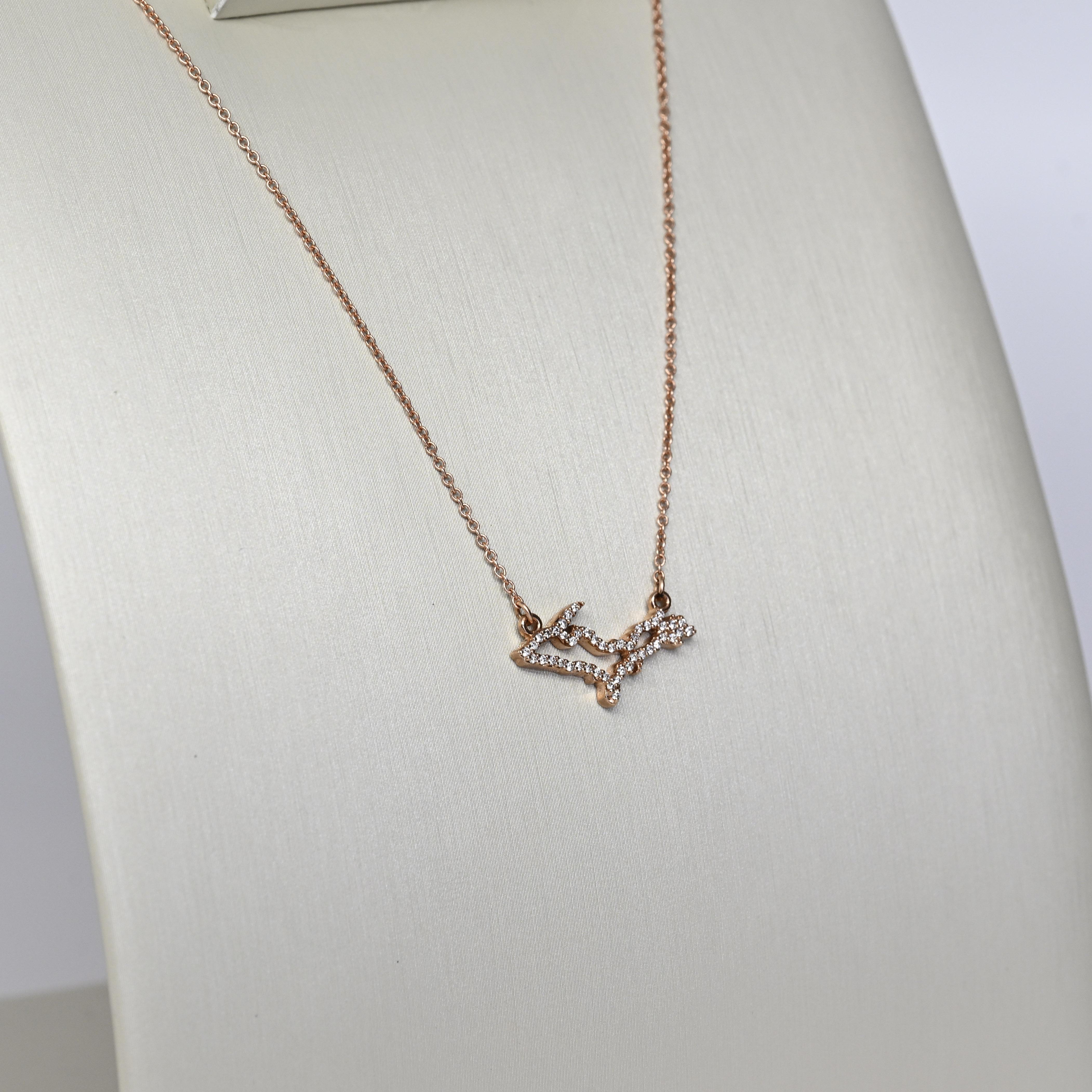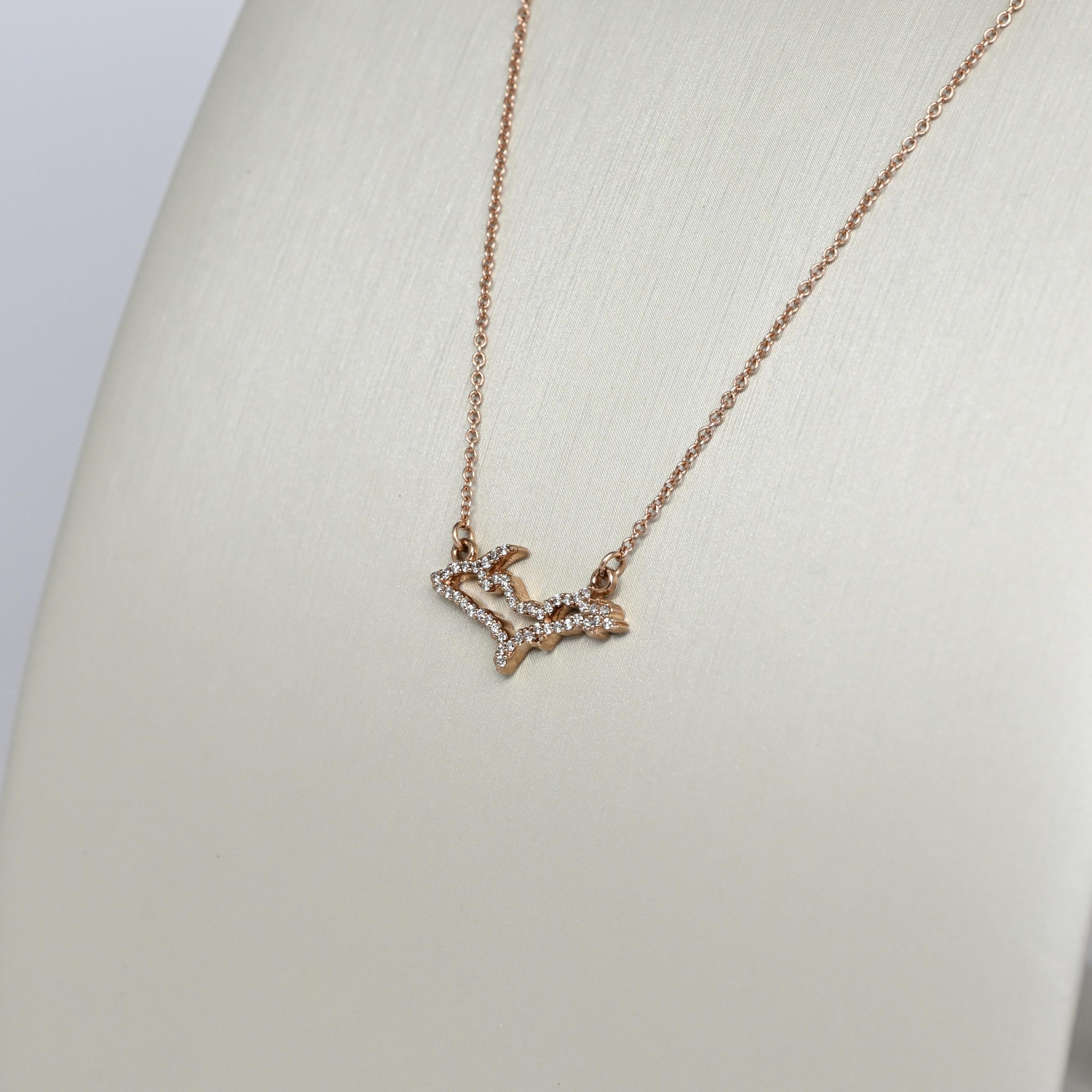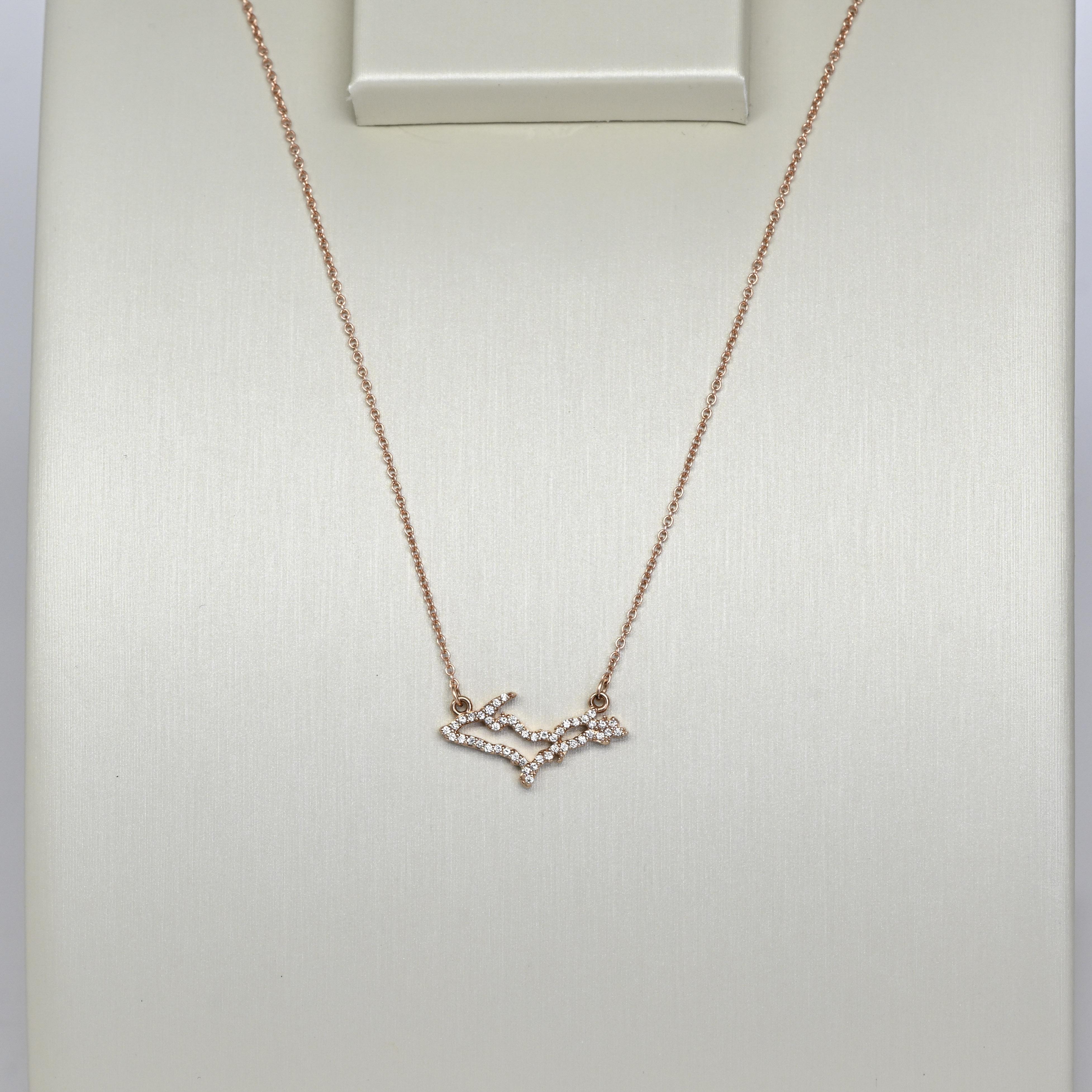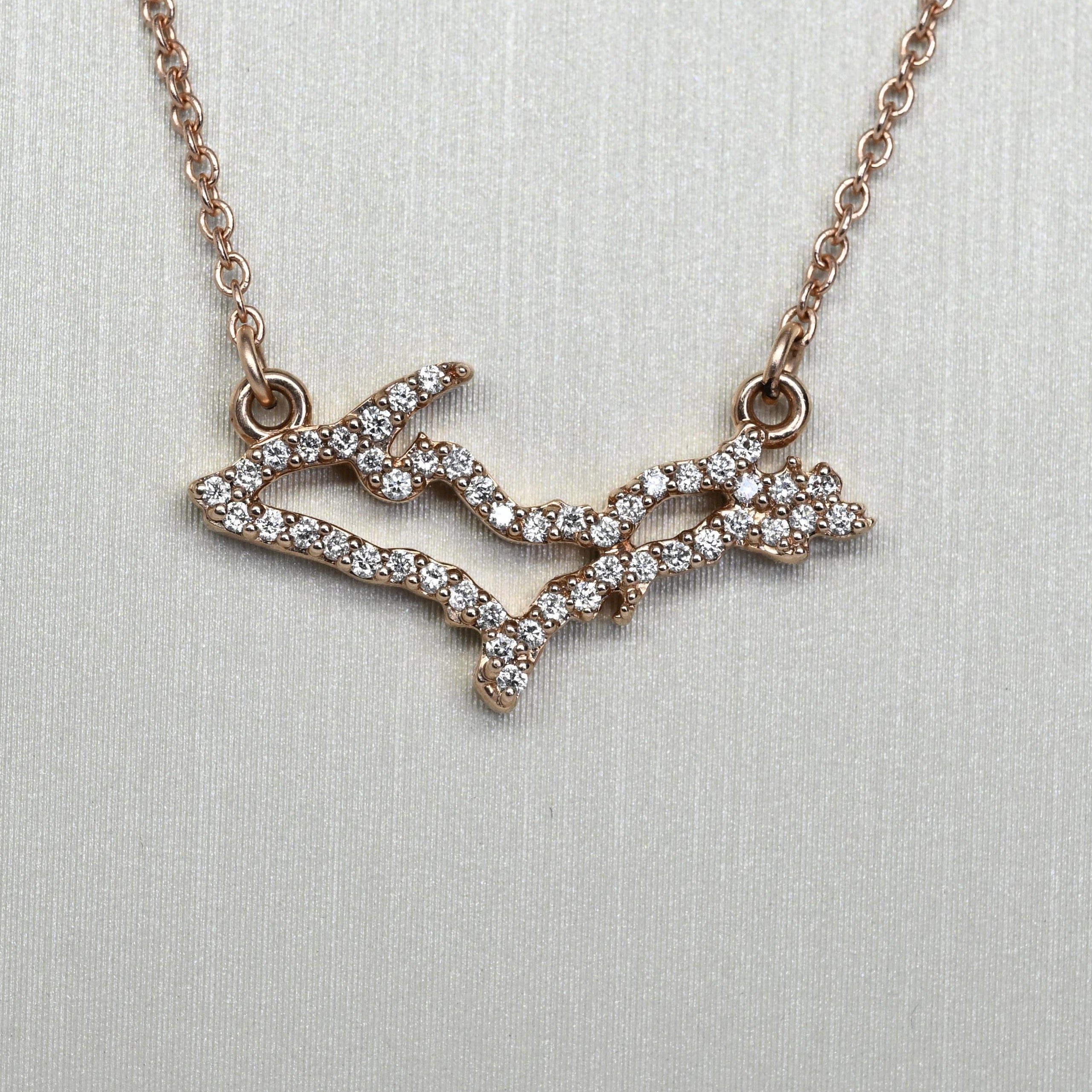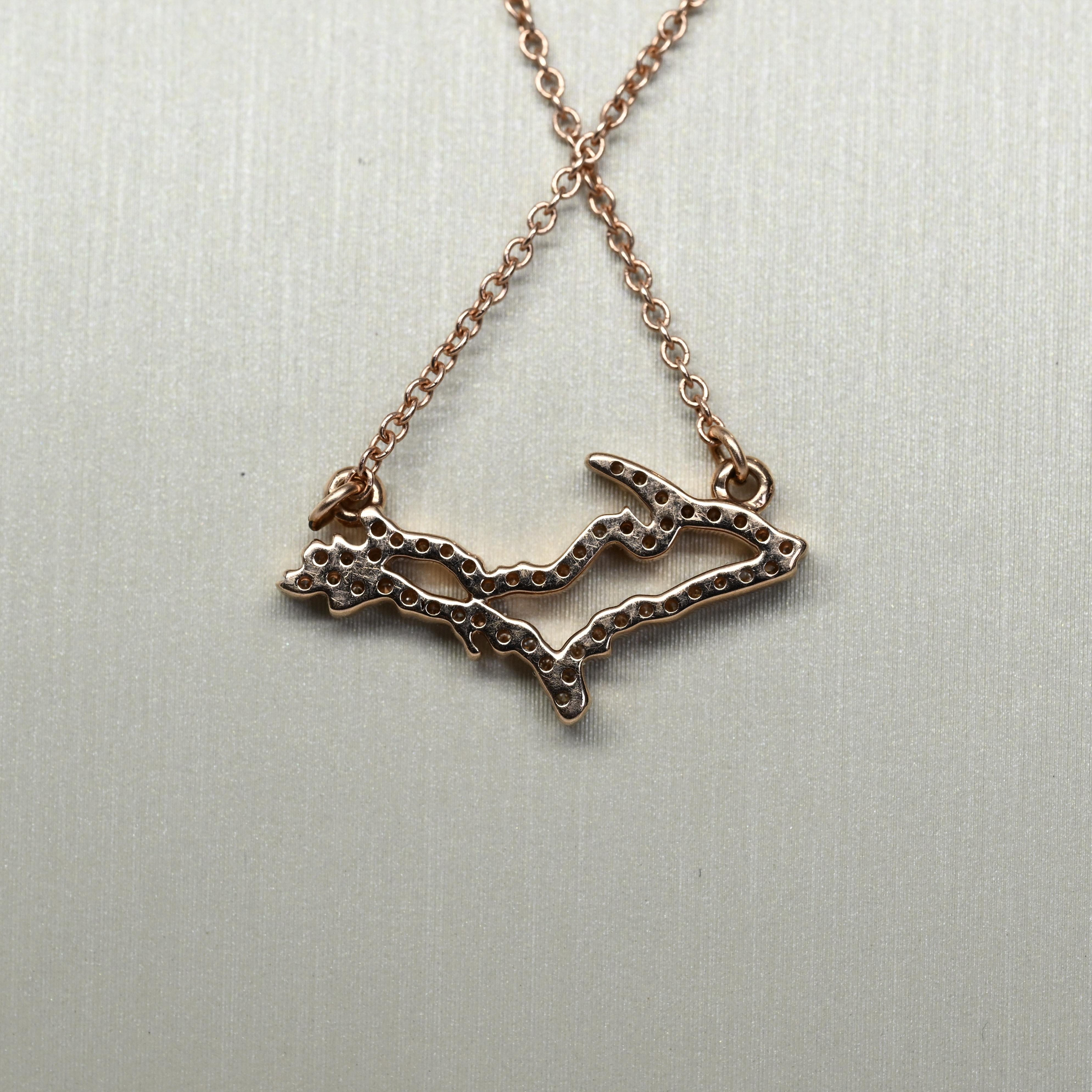 Celebrate your love for Michigan with this stunning 14K rose gold Upper Peninsula diamond necklace, beautifully crafted in the iconic UP silhouette. Sparkling natural diamonds accent the pendant, adding brilliance and elegance to this meaningful state-inspired design. Suspended on an 18" chain, this necklace is perfect for everyday wear or as a sentimental gift for Michigan lovers, travelers, or locals. Its delicate yet eye-catching design makes it ideal for layering or wearing solo. A unique and thoughtful gift for her, combining fine jewelry with hometown pride.