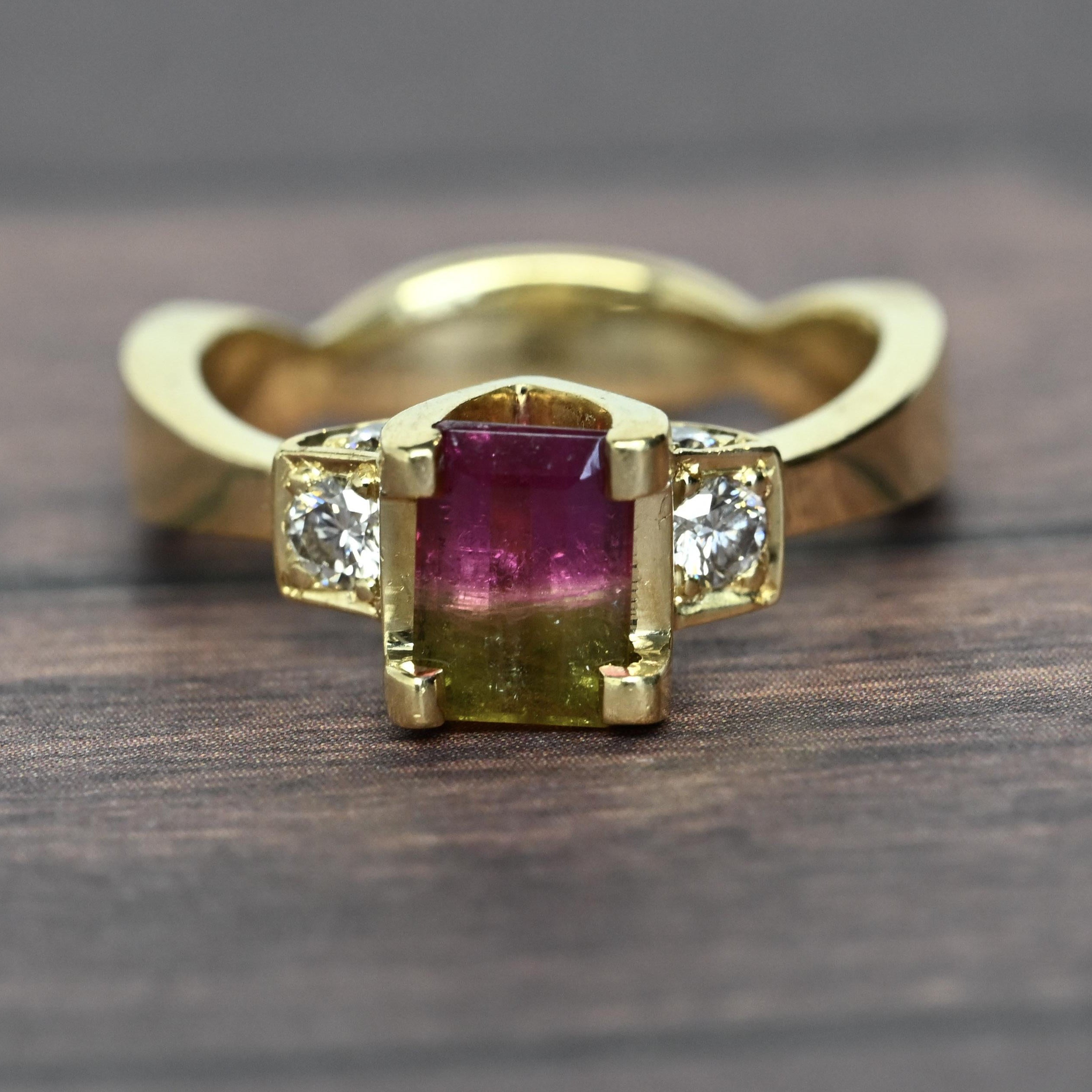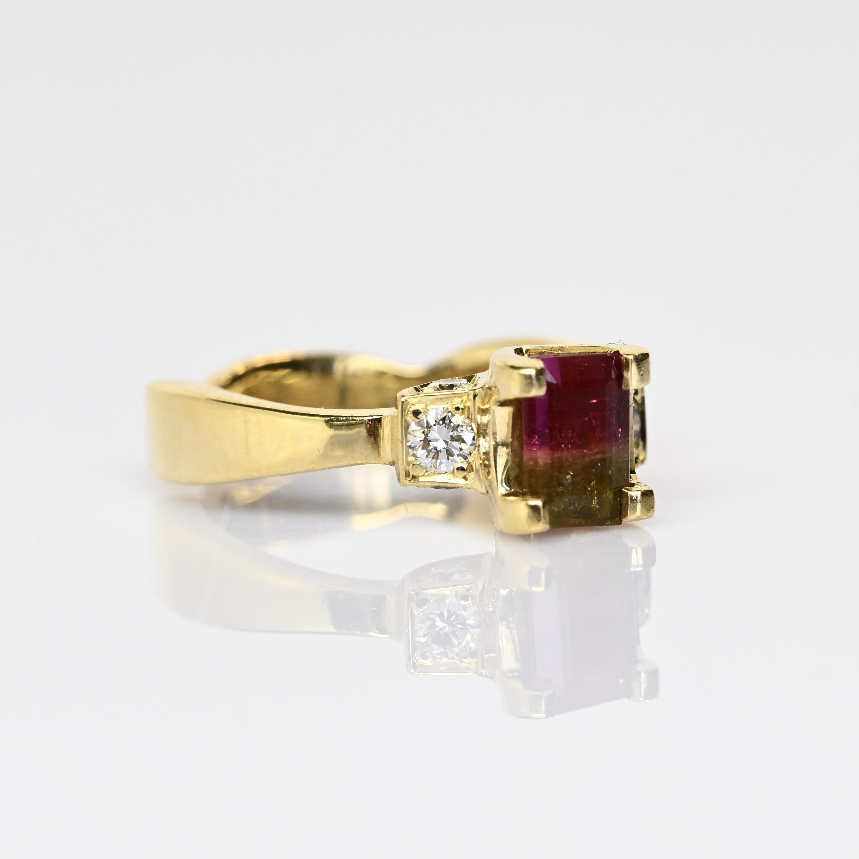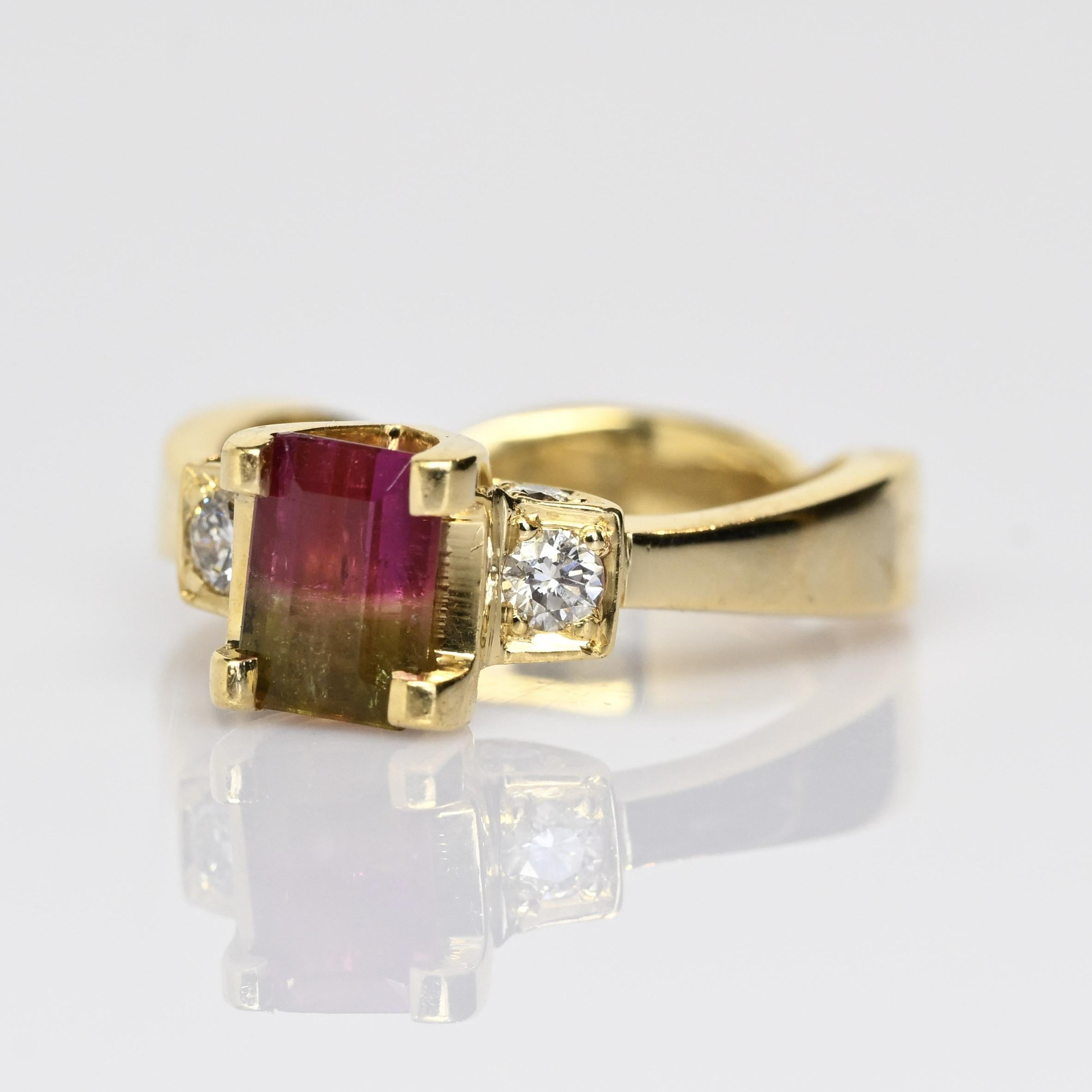 This stunning 18K yellow gold ring features a captivating watermelon tourmaline, showcasing beautiful natural bi-color hues of pink and green in an elegant emerald cut. Flanked by sparkling diamond accents, the vibrant center stone is perfectly complemented by the rich warmth of solid 18 karat gold. Each watermelon tourmaline is one-of-a-kind, making this ring a truly unique statement piece. Ideal as an alternative engagement ring or a standout addition to any fine jewelry collection. A gorgeous gift for her, blending bold color, luxury, and timeless craftsmanship.
