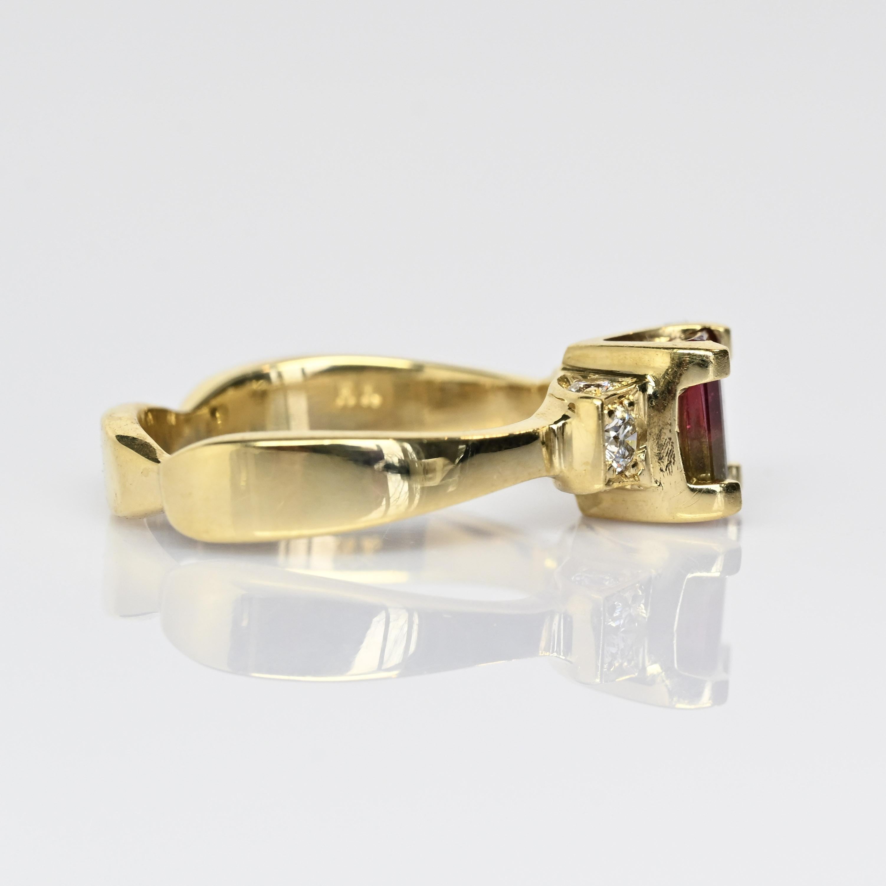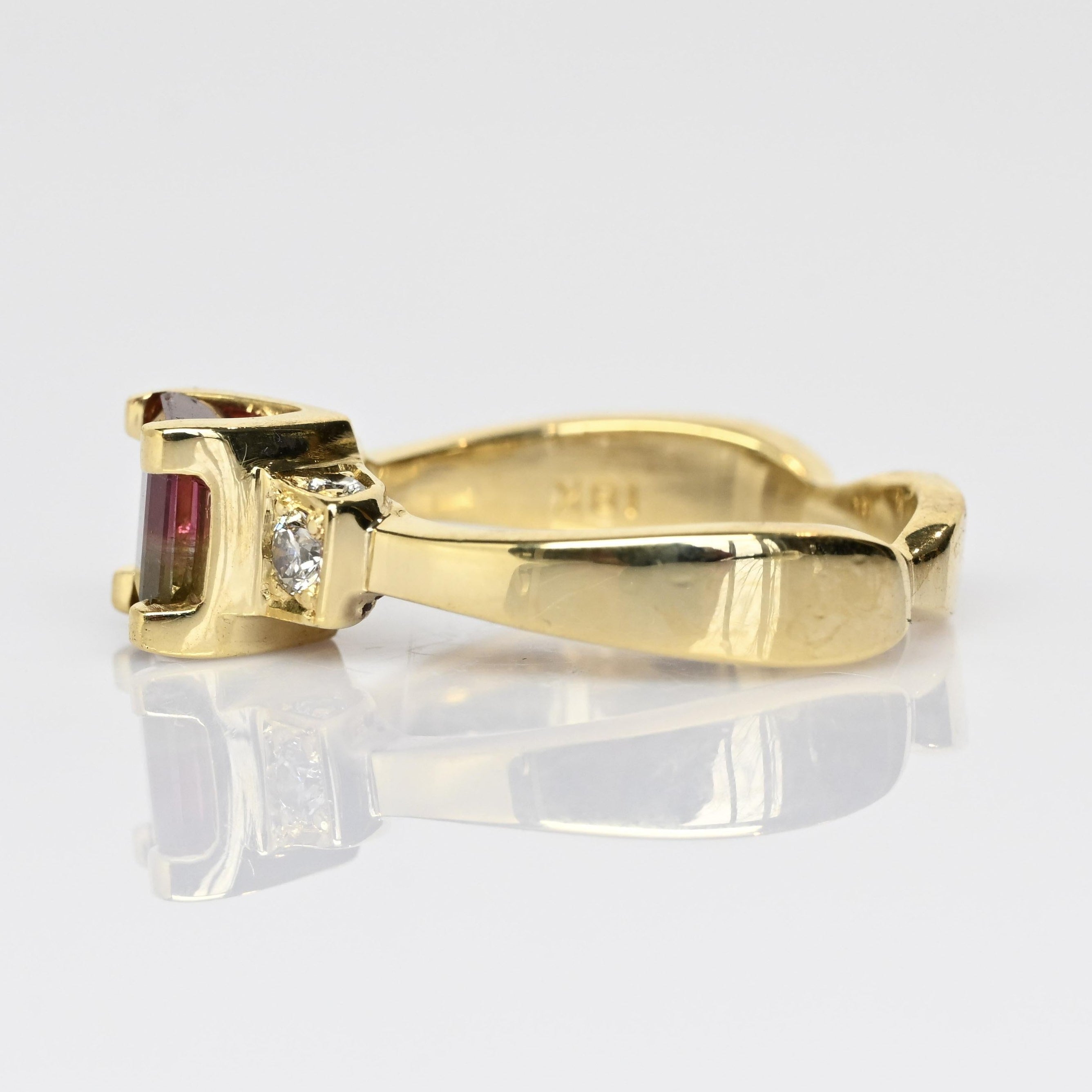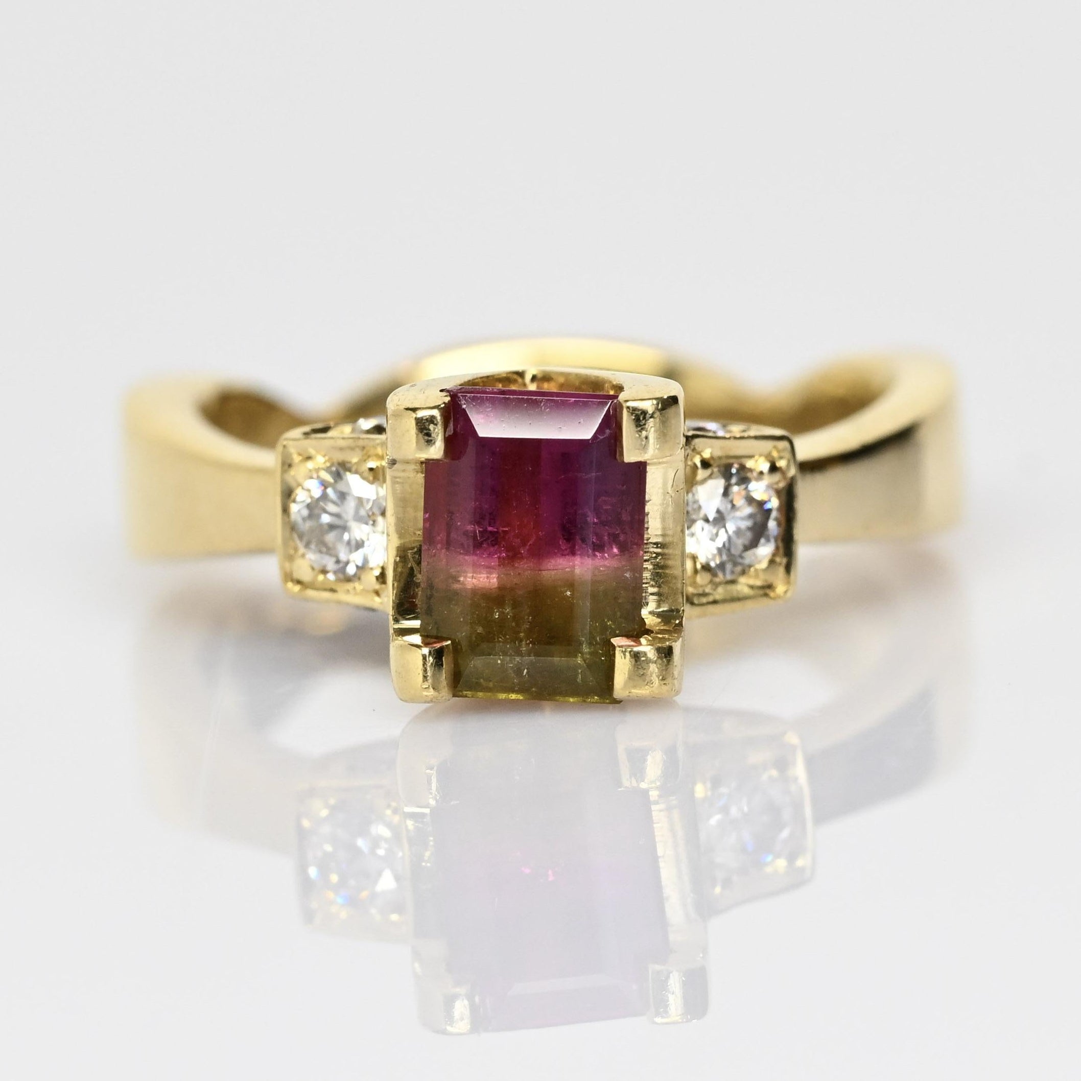 This stunning 18K yellow gold ring features a captivating watermelon tourmaline, showcasing beautiful natural bi-color hues of pink and green in an elegant emerald cut. Flanked by sparkling diamond accents, the vibrant center stone is perfectly complemented by the rich warmth of solid 18 karat gold. Each watermelon tourmaline is one-of-a-kind, making this ring a truly unique statement piece. Ideal as an alternative engagement ring or a standout addition to any fine jewelry collection. A gorgeous gift for her, blending bold color, luxury, and timeless craftsmanship.