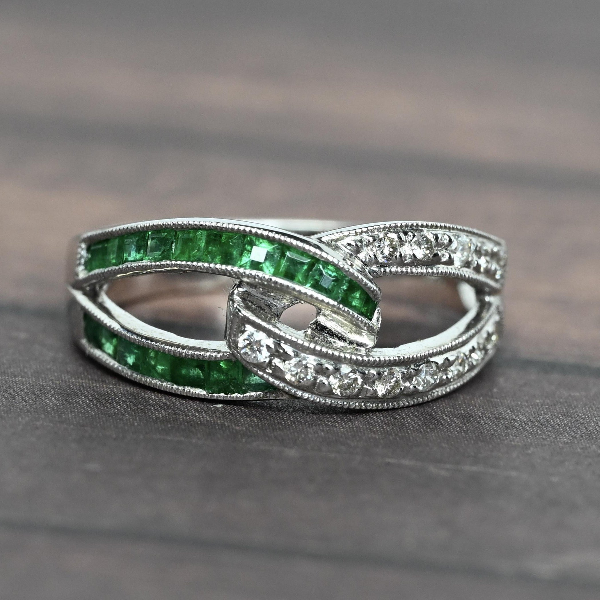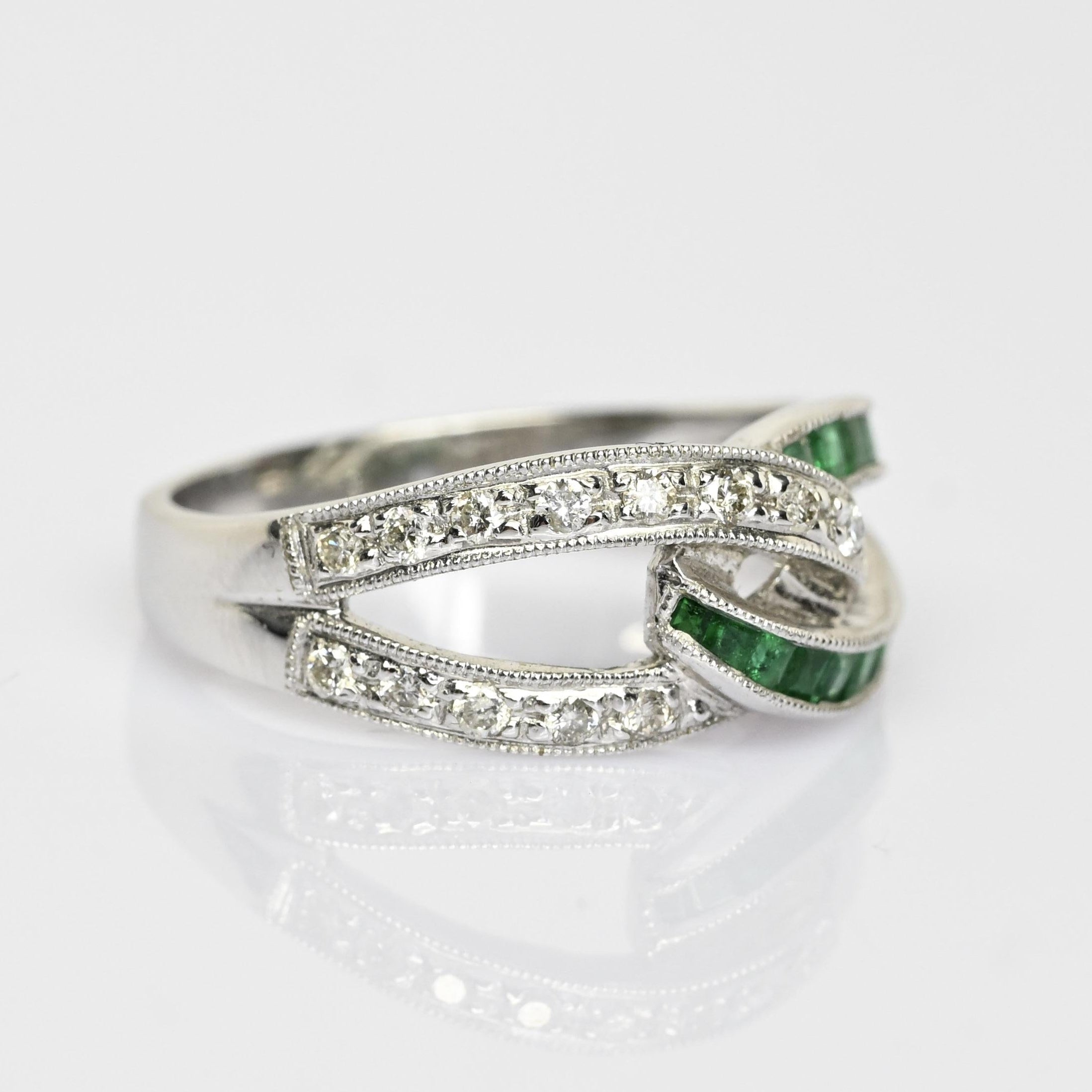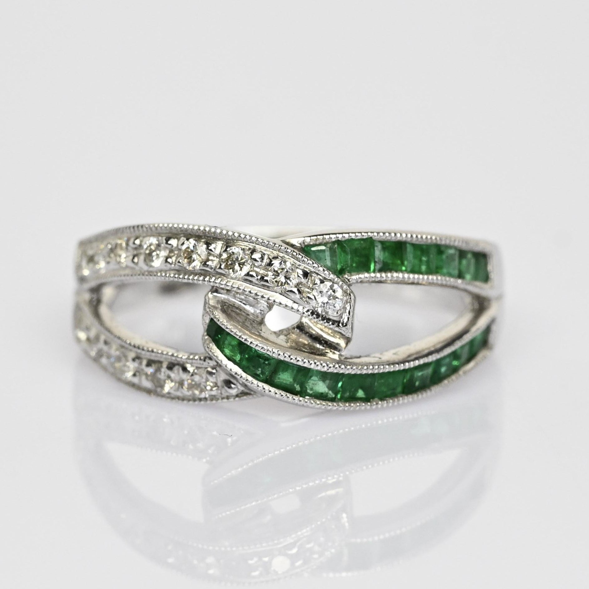 Celebrate timeless elegance with this stunning Emerald & Diamond Interlocked Knot Ring, crafted in 14k white gold. Featuring vivid green emeralds set in sleek channels and sparkling round diamond accents, the intertwined design symbolizes unity, love, and connection. Fine milgrain detailing enhances the vintage-inspired look, adding texture and sophistication to this unique piece. Perfect as a promise ring, anniversary band, or meaningful statement ring, it offers both brilliance and symbolism. A beautiful choice for those seeking a green gemstone ring with classic elegance and modern design.