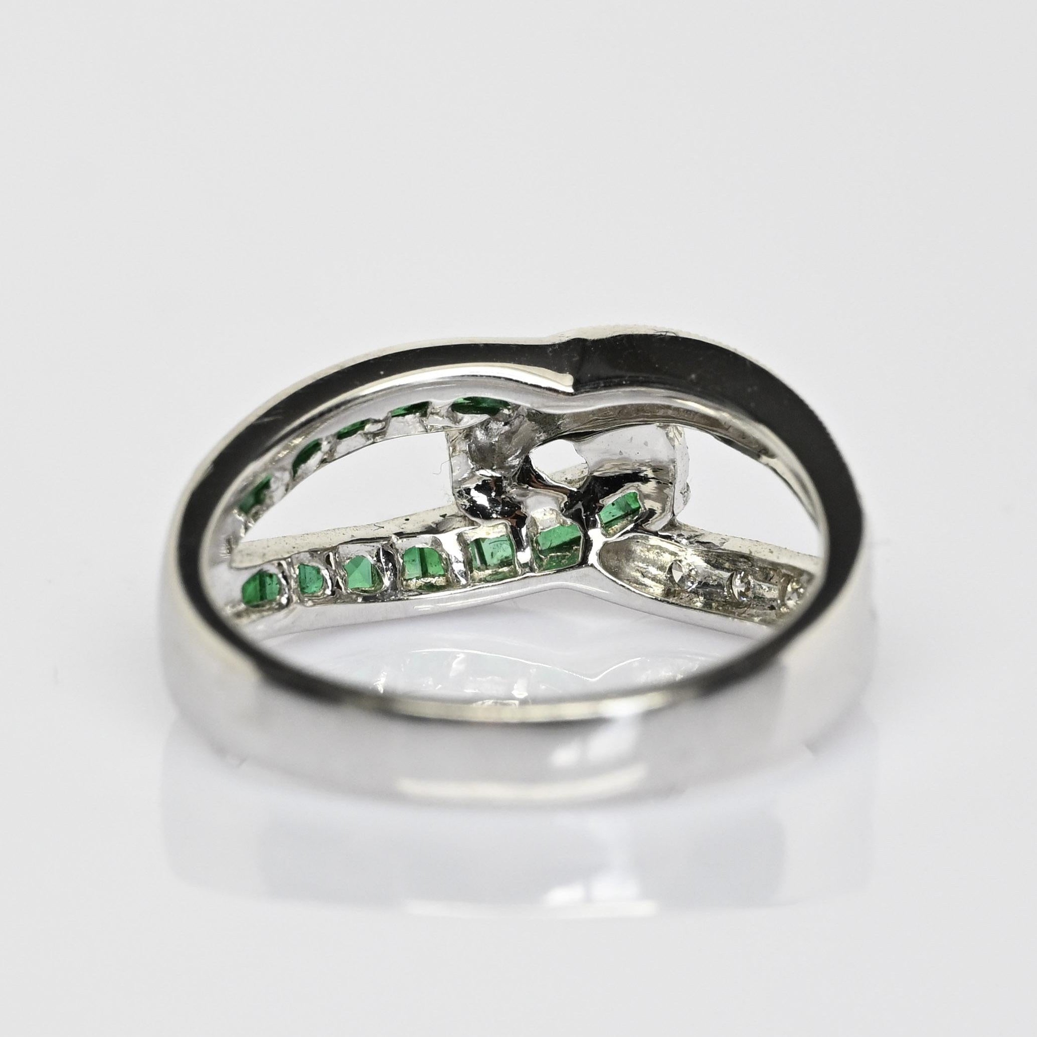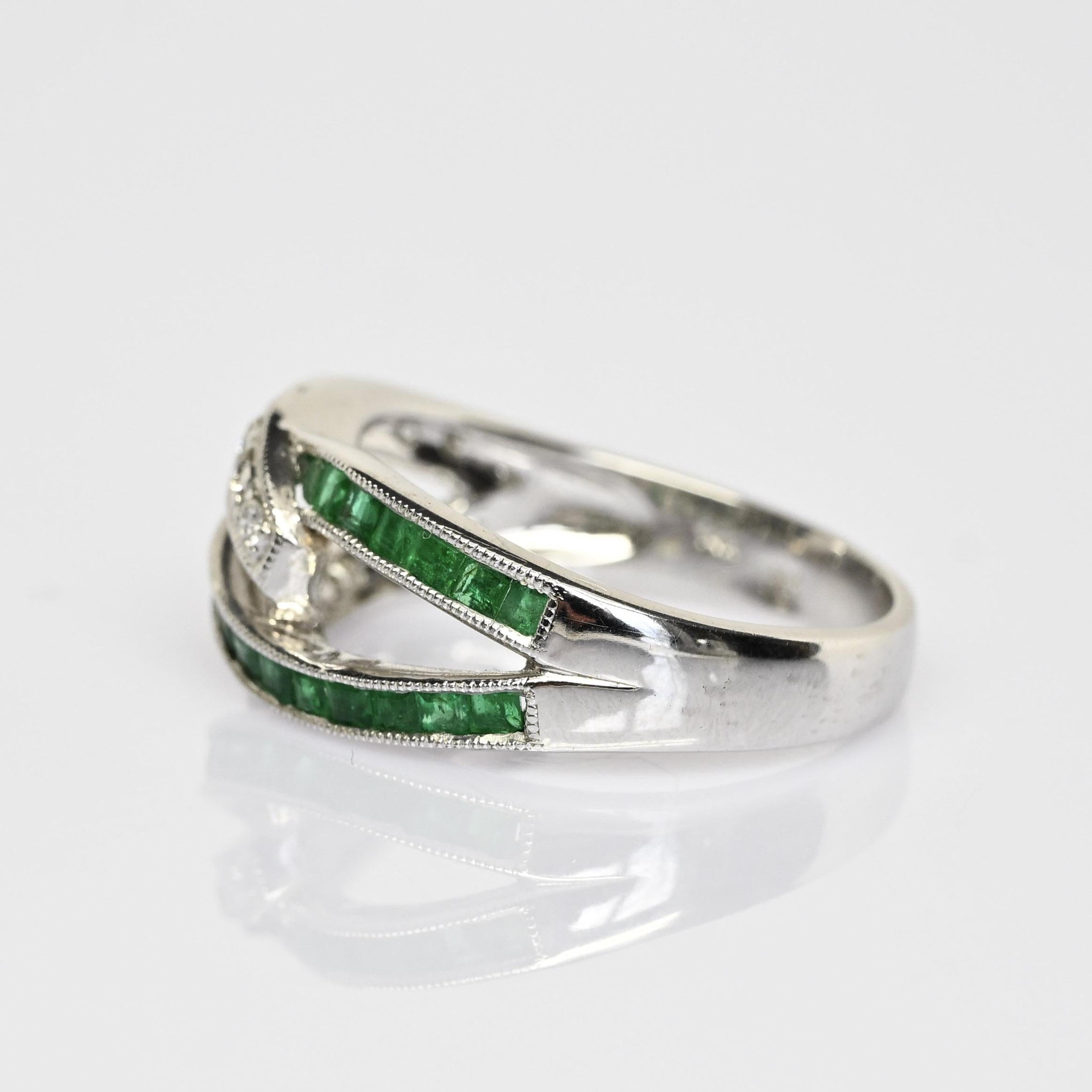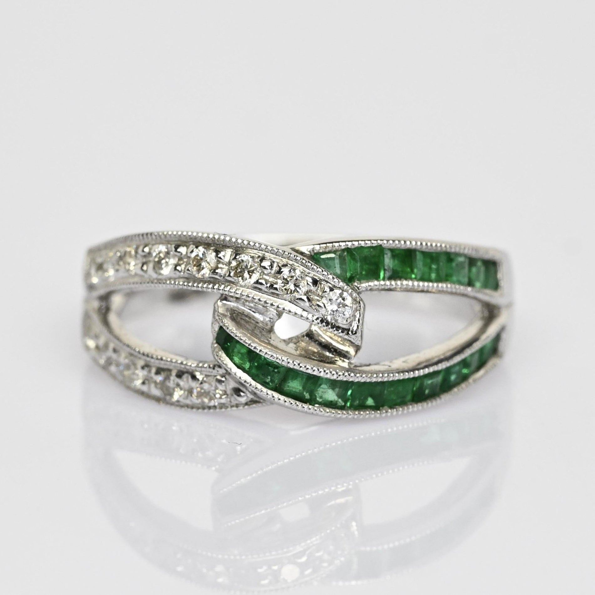 Celebrate timeless elegance with this stunning Emerald & Diamond Interlocked Knot Ring, crafted in 14k white gold. Featuring vivid green emeralds set in sleek channels and sparkling round diamond accents, the intertwined design symbolizes unity, love, and connection. Fine milgrain detailing enhances the vintage-inspired look, adding texture and sophistication to this unique piece. Perfect as a promise ring, anniversary band, or meaningful statement ring, it offers both brilliance and symbolism. A beautiful choice for those seeking a green gemstone ring with classic elegance and modern design.
