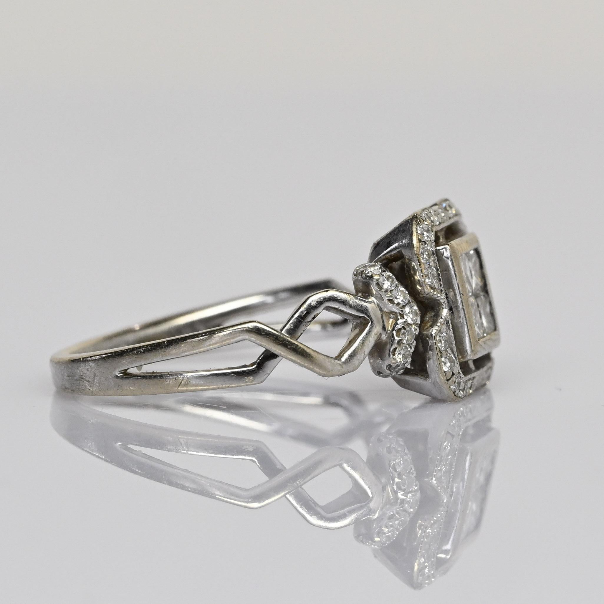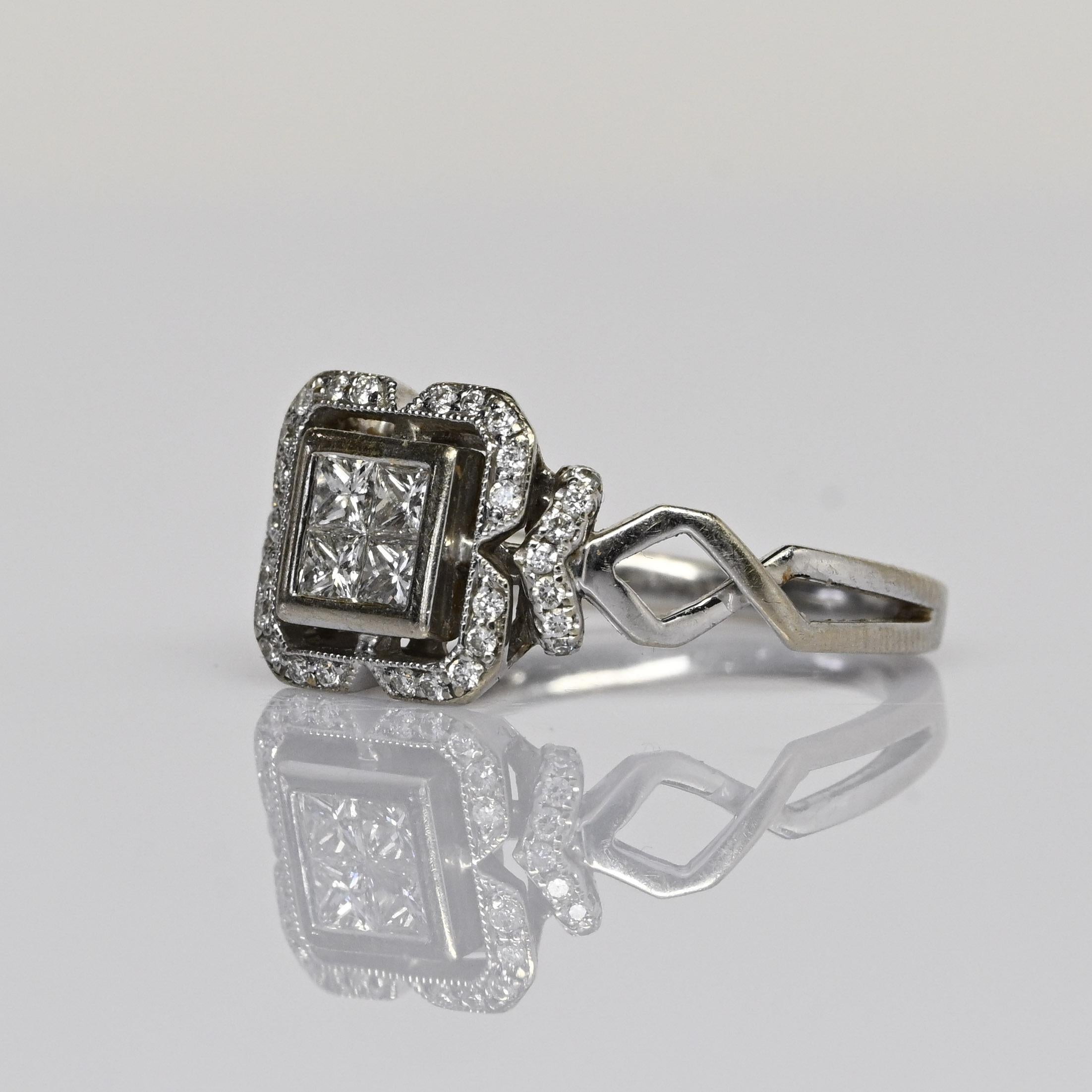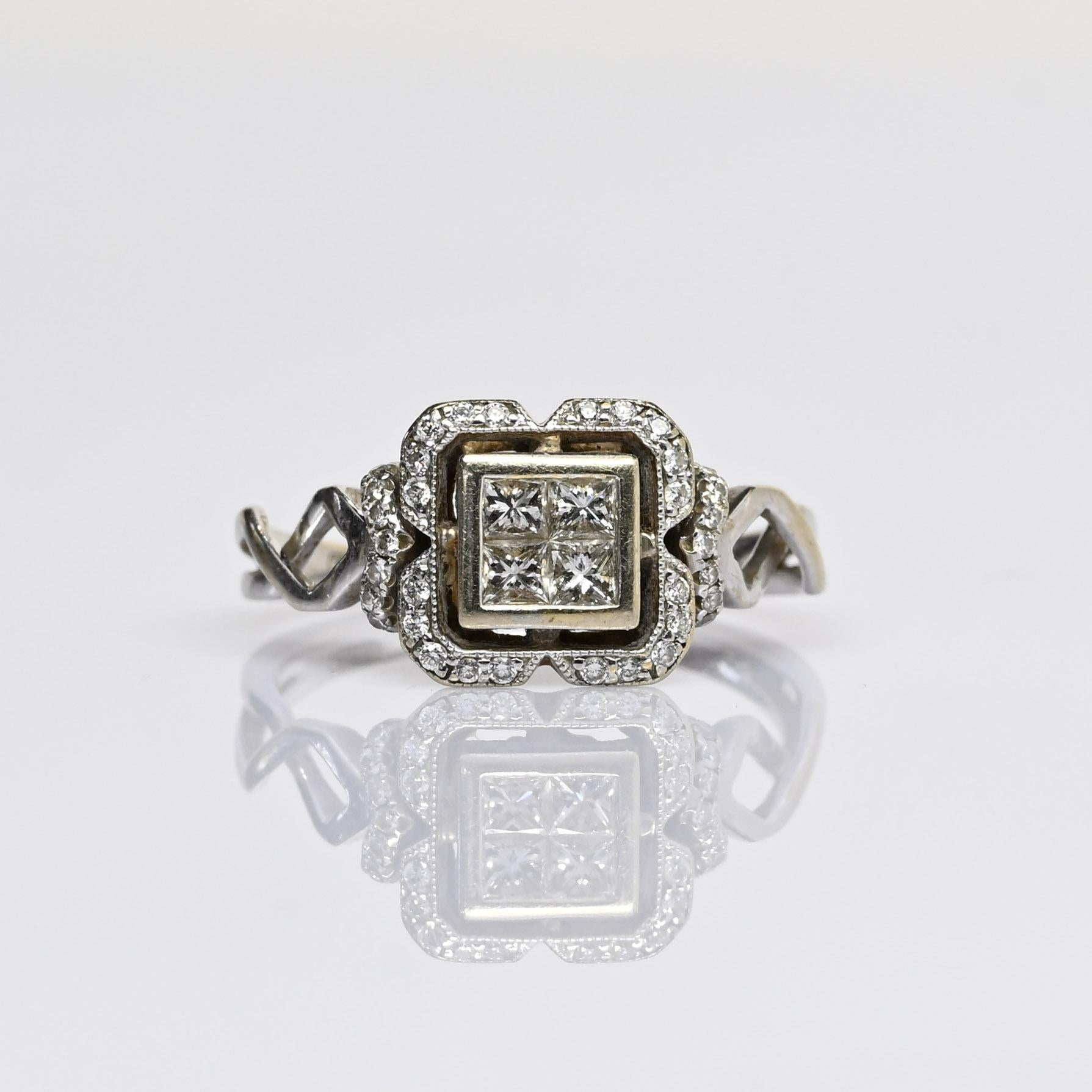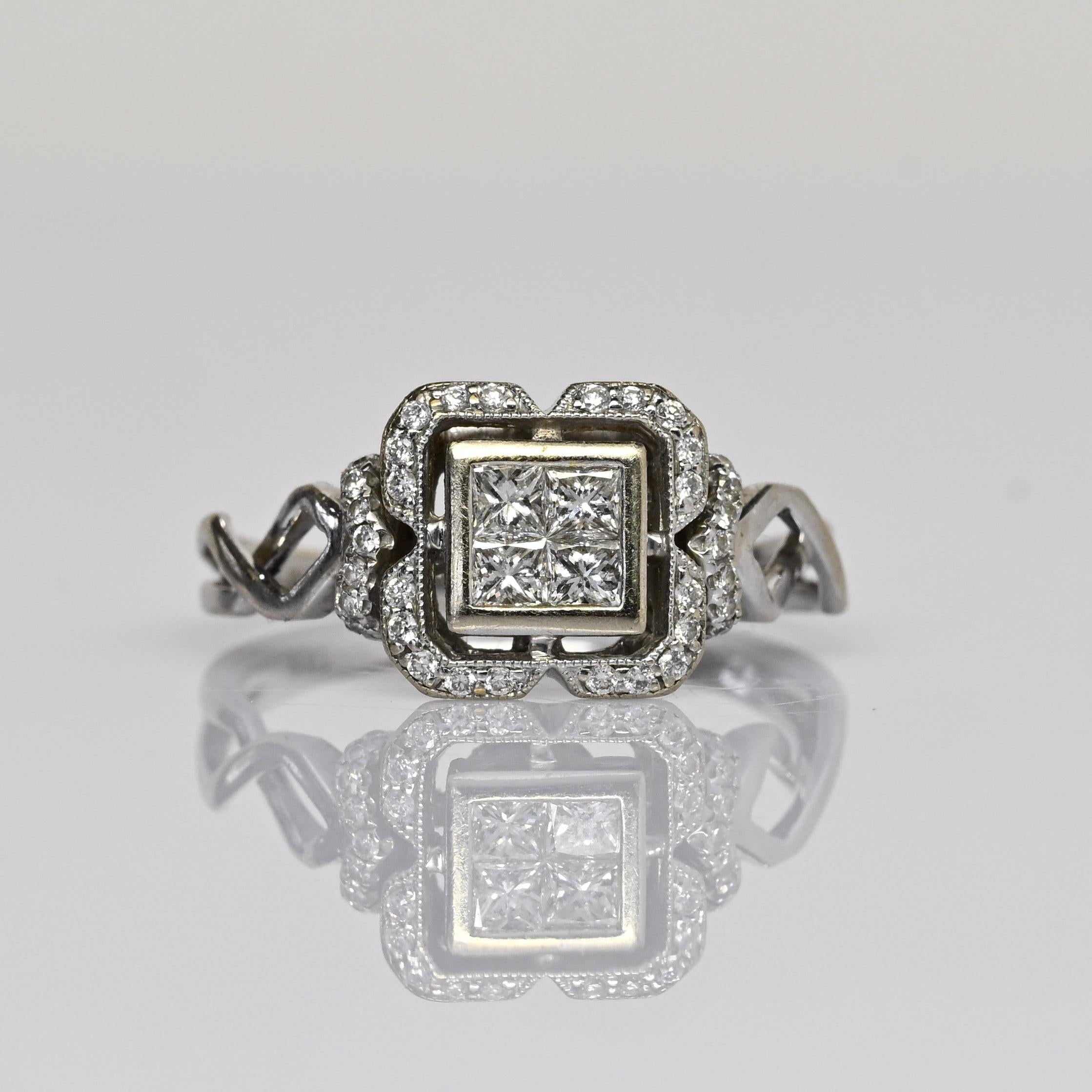 This stunning Vannah K ring showcases a sophisticated cluster of princess-cut diamonds in an invisible setting, creating a seamless and radiant centerpiece. Crafted in luxurious 18k white gold, the design is framed by a delicate diamond halo that enhances its brilliance. The sculpted openwork band adds a touch of modern elegance and intricate artistry. A perfect blend of precision and glamour, this piece captures timeless beauty with a contemporary edge.