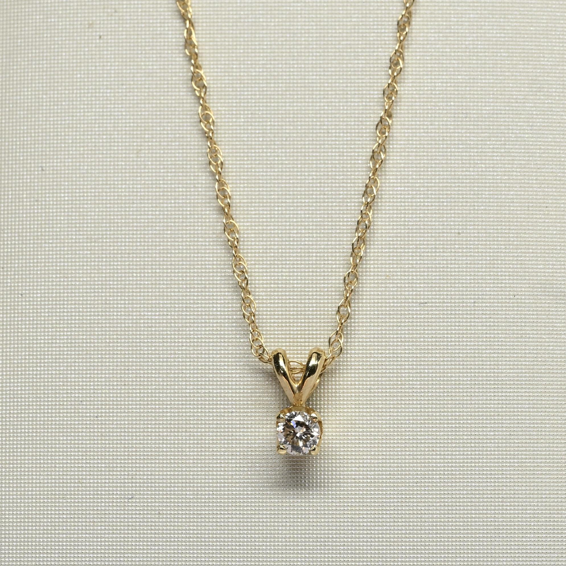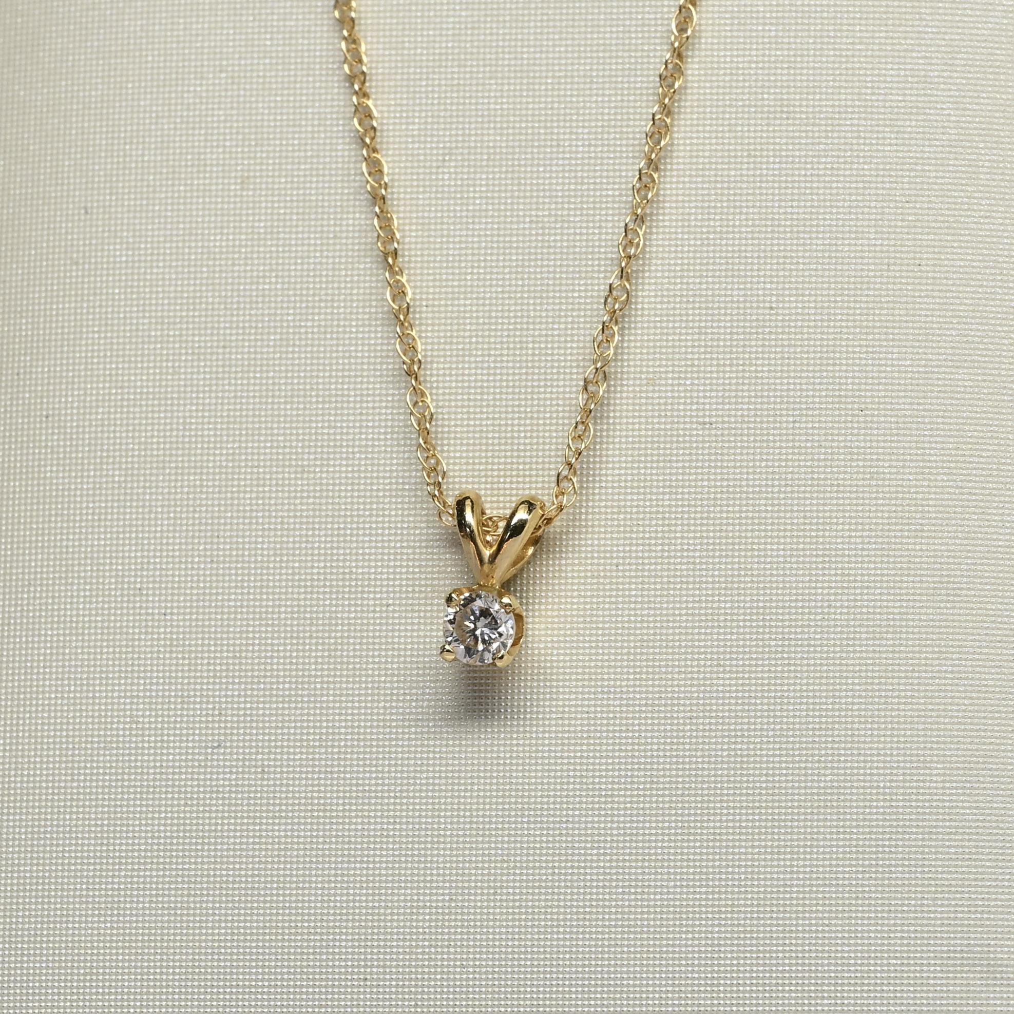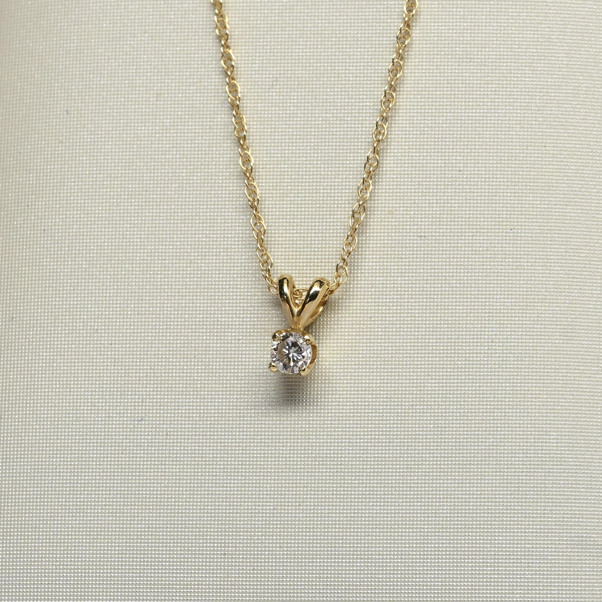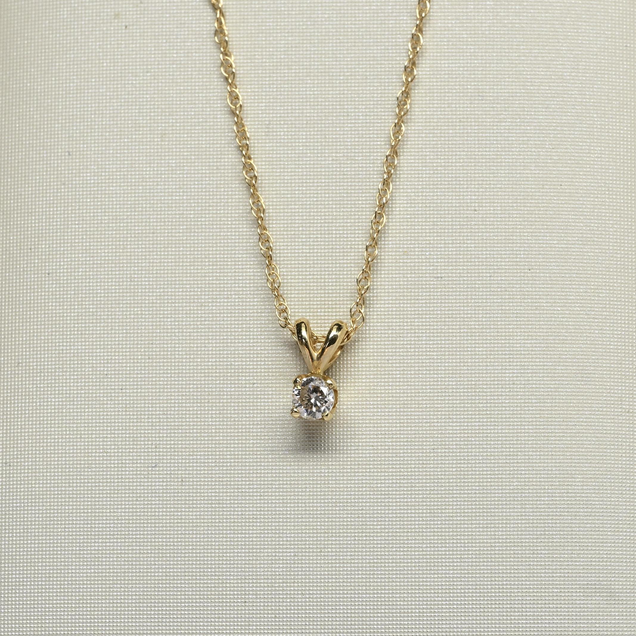 This elegant 0.12 carat round diamond solitaire pendant exudes timeless simplicity and charm. The sparkling diamond is set in a classic 14k yellow gold four-prong setting, allowing light to dance beautifully across its surface. Suspended from a delicate gold chain, it offers just the right touch of brilliance for everyday wear or special occasions. A perfect gift or personal treasure, this necklace embodies effortless sophistication and enduring beauty.