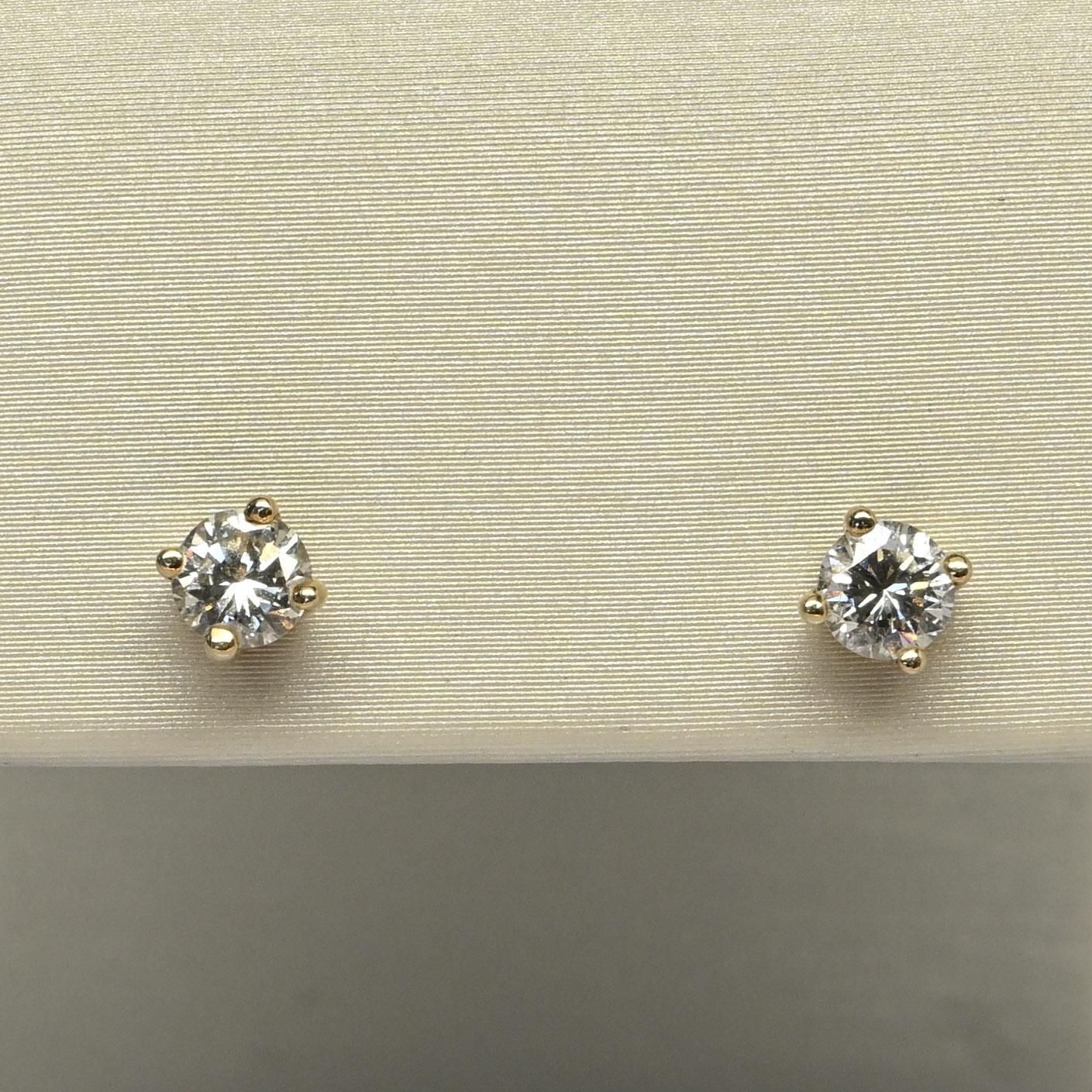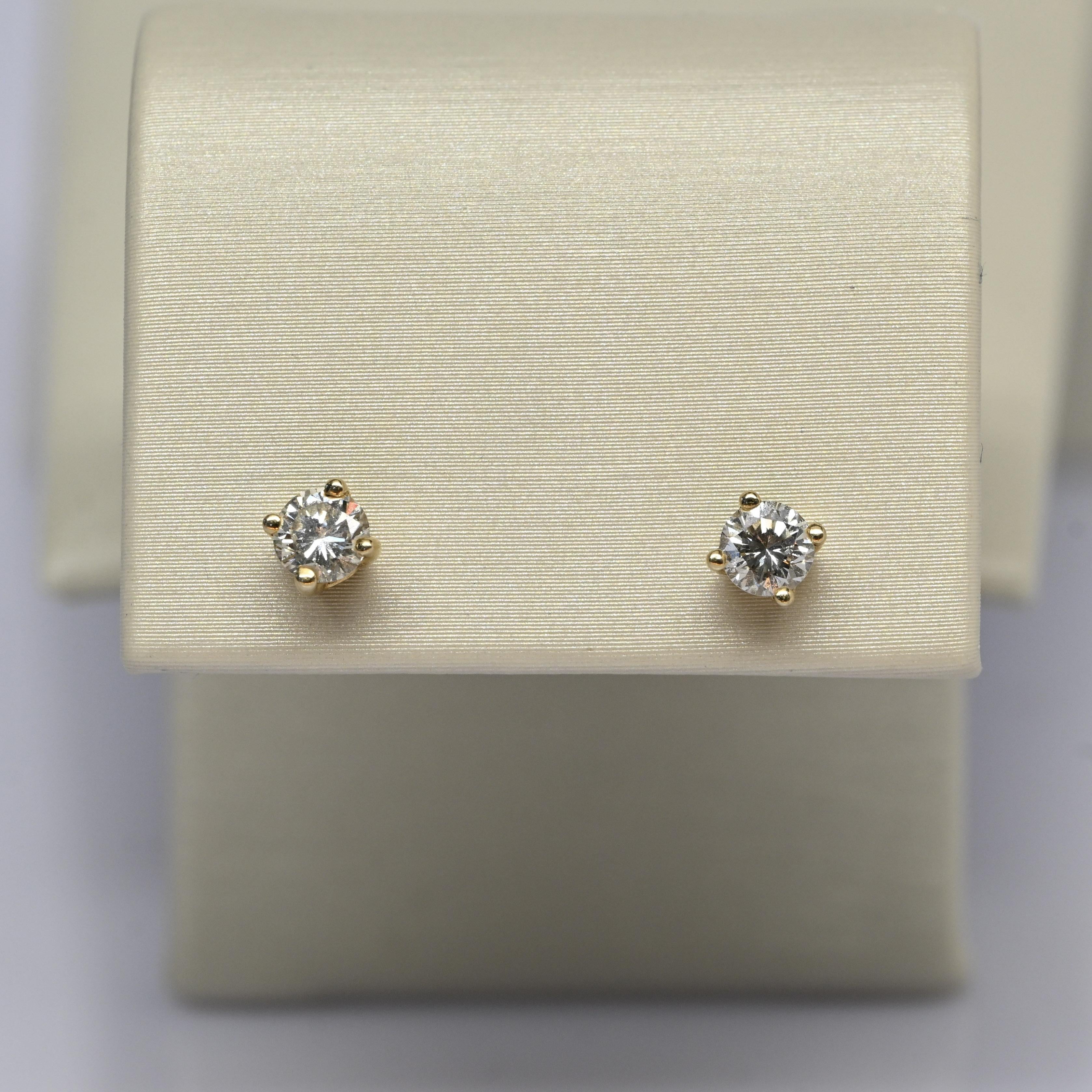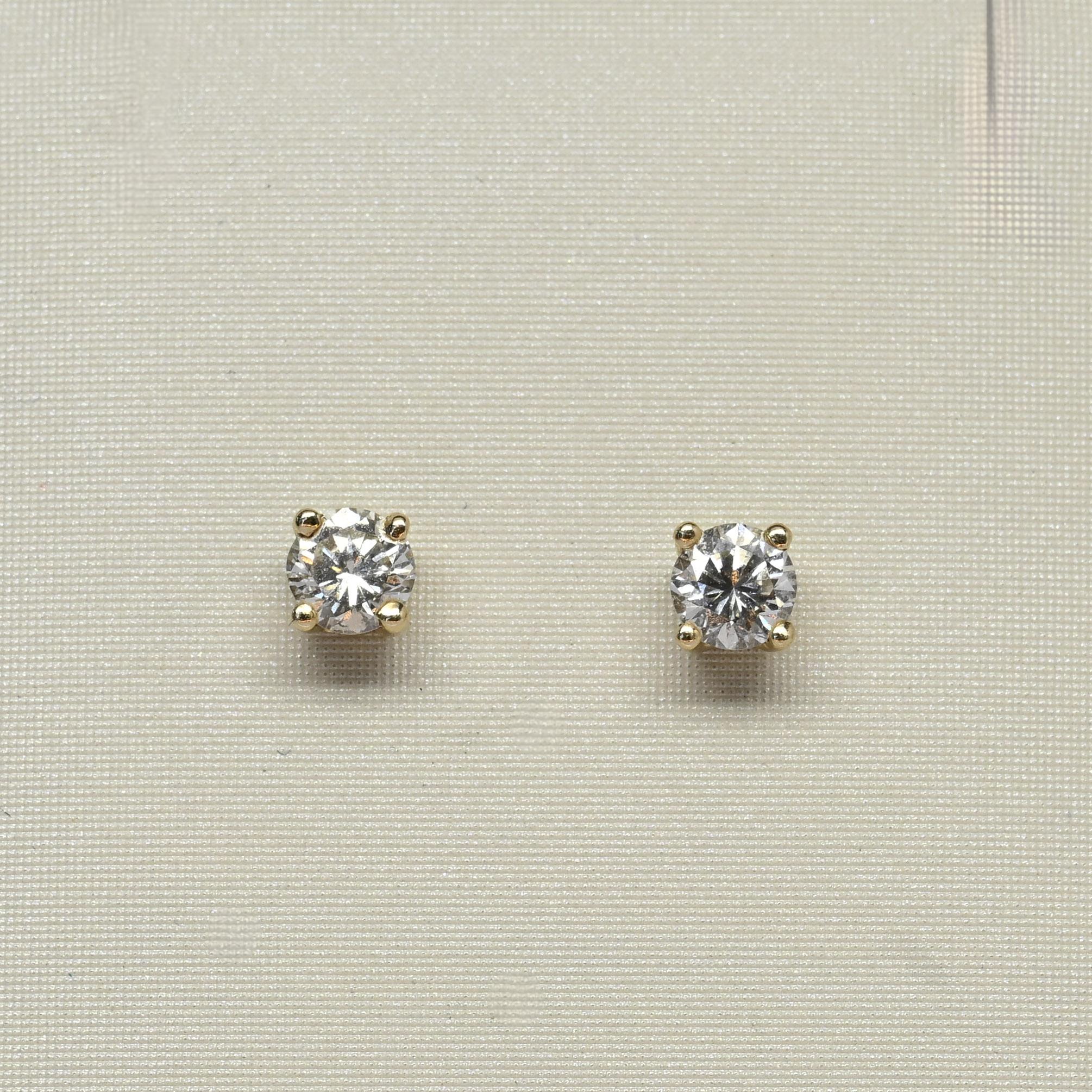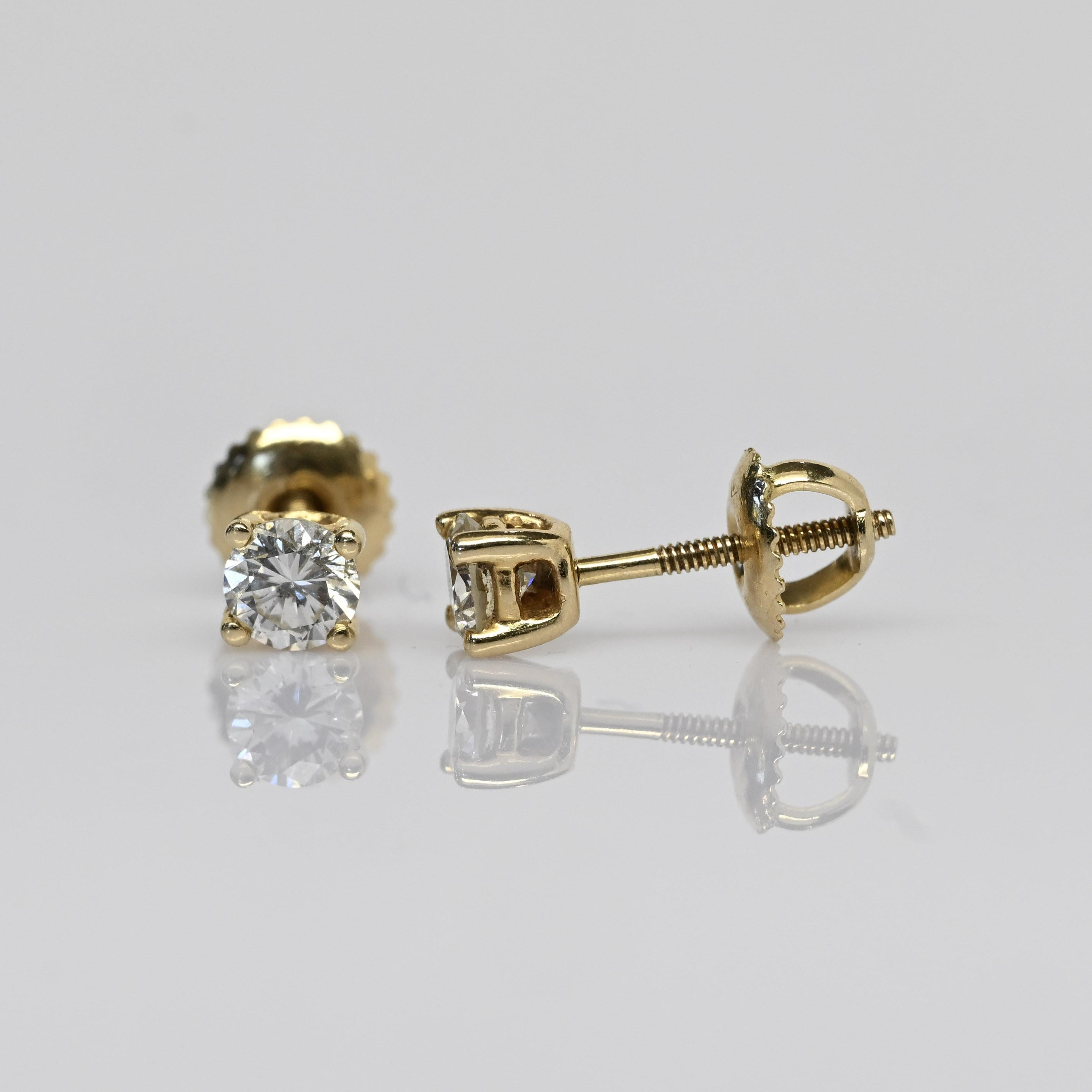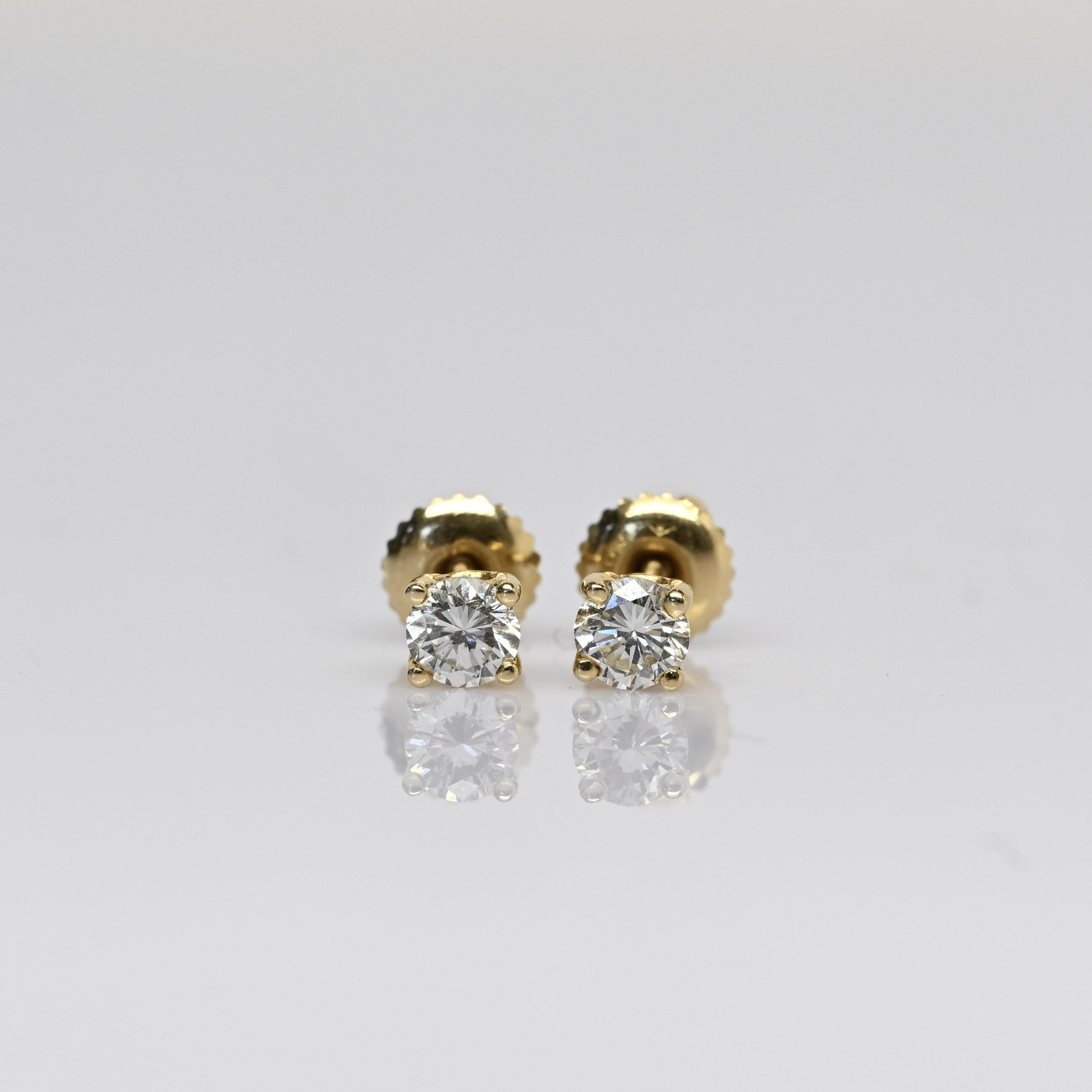 These classic stud earrings feature a total of 0.60 carats of natural round brilliant cut diamonds set in 14k yellow gold. Each diamond is securely held in a four-prong setting, allowing maximum light to enhance their brilliance and fire. Designed with screw-back posts for added security, these earrings combine timeless elegance with everyday practicality. A beautiful staple piece that adds a touch of sparkle to any look.