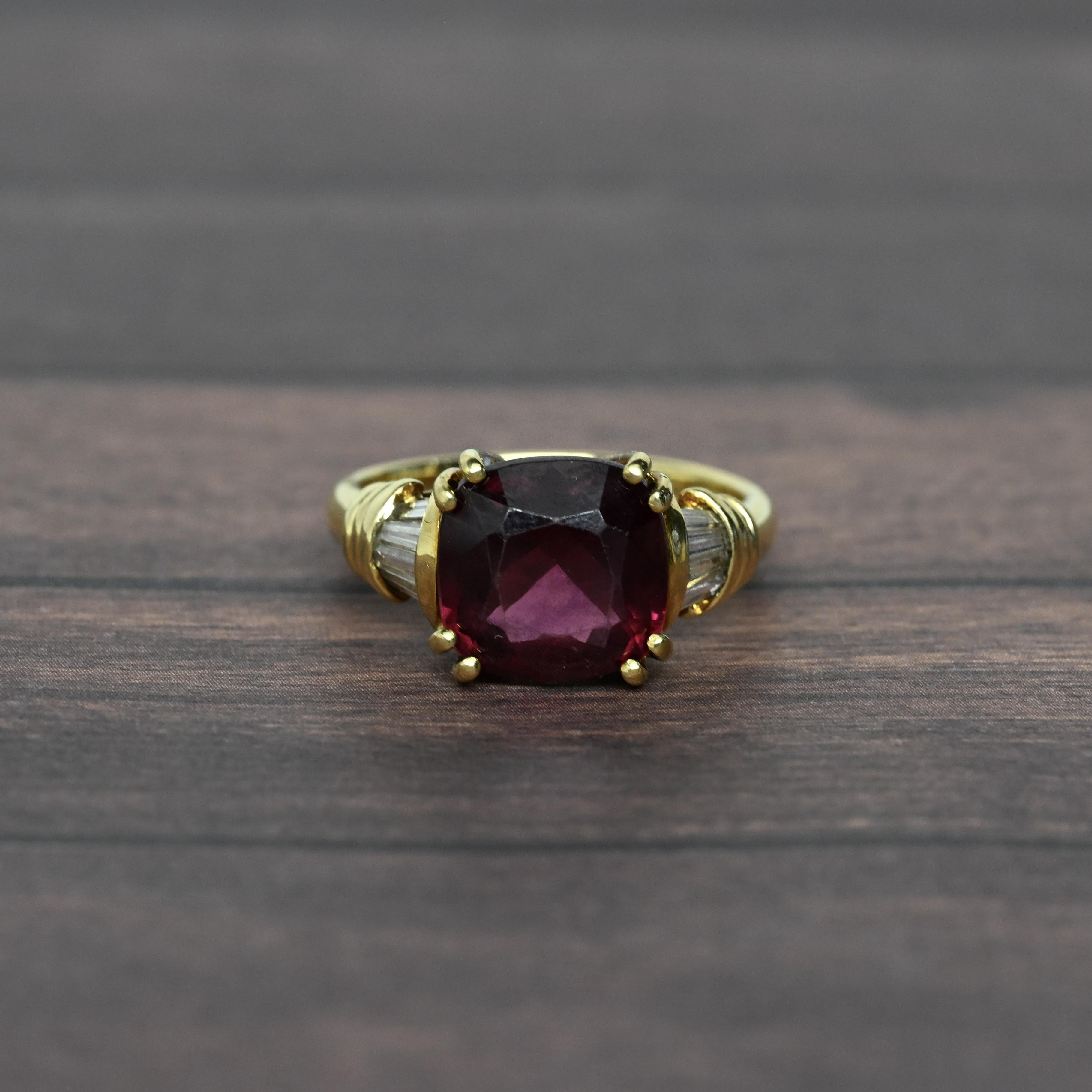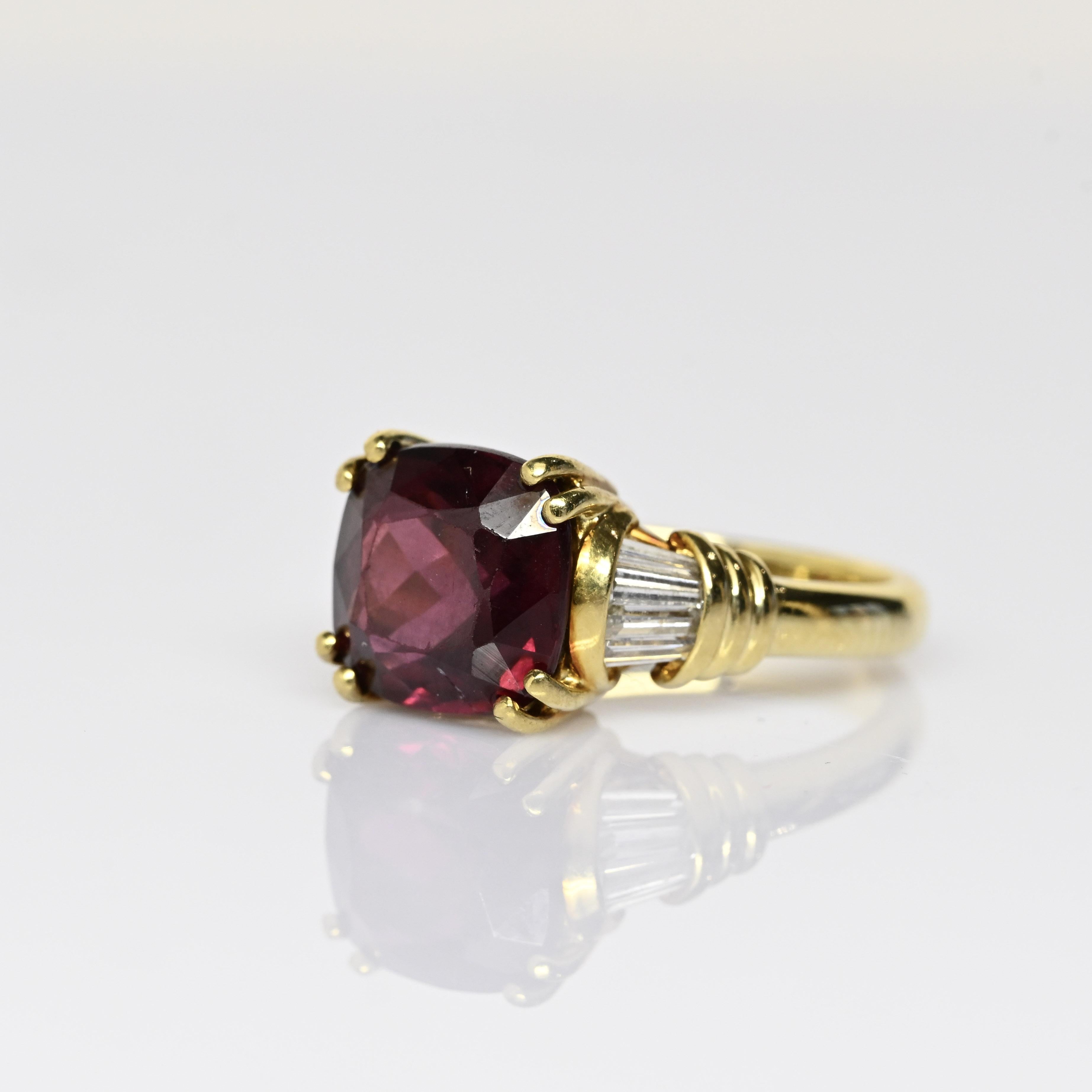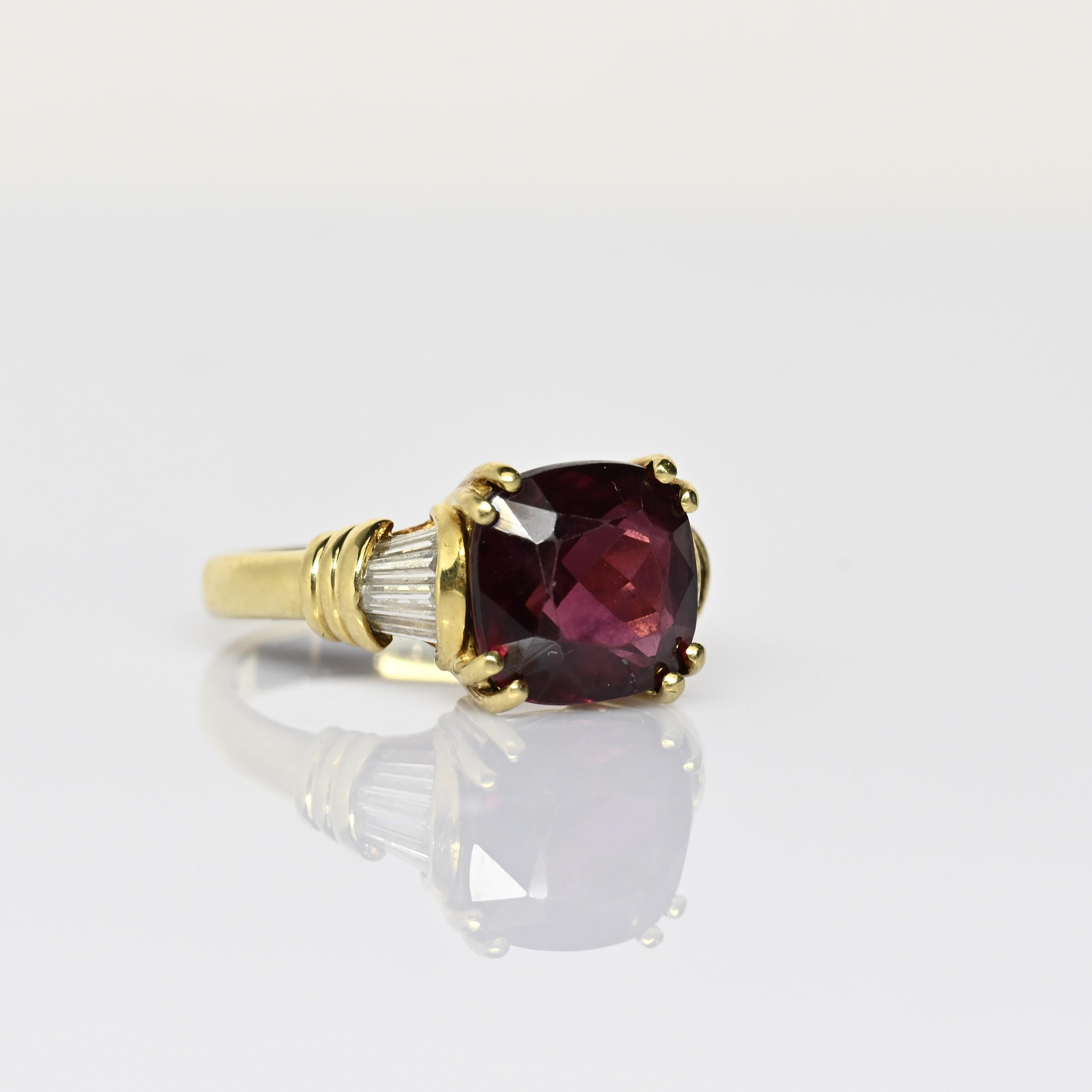 This striking Hanora Rhodolite ring is crafted in rich 18 karat yellow gold and showcases a vibrant cushion-cut rhodolite garnet at its center. The garnet displays deep raspberry and wine-red tones, beautifully complemented by tapered diamond accents along the shoulders. Elegant prong detailing and the warm gold setting enhance the stone’s natural depth and brilliance. A bold yet refined design, this ring makes a stunning statement piece with timeless appeal.