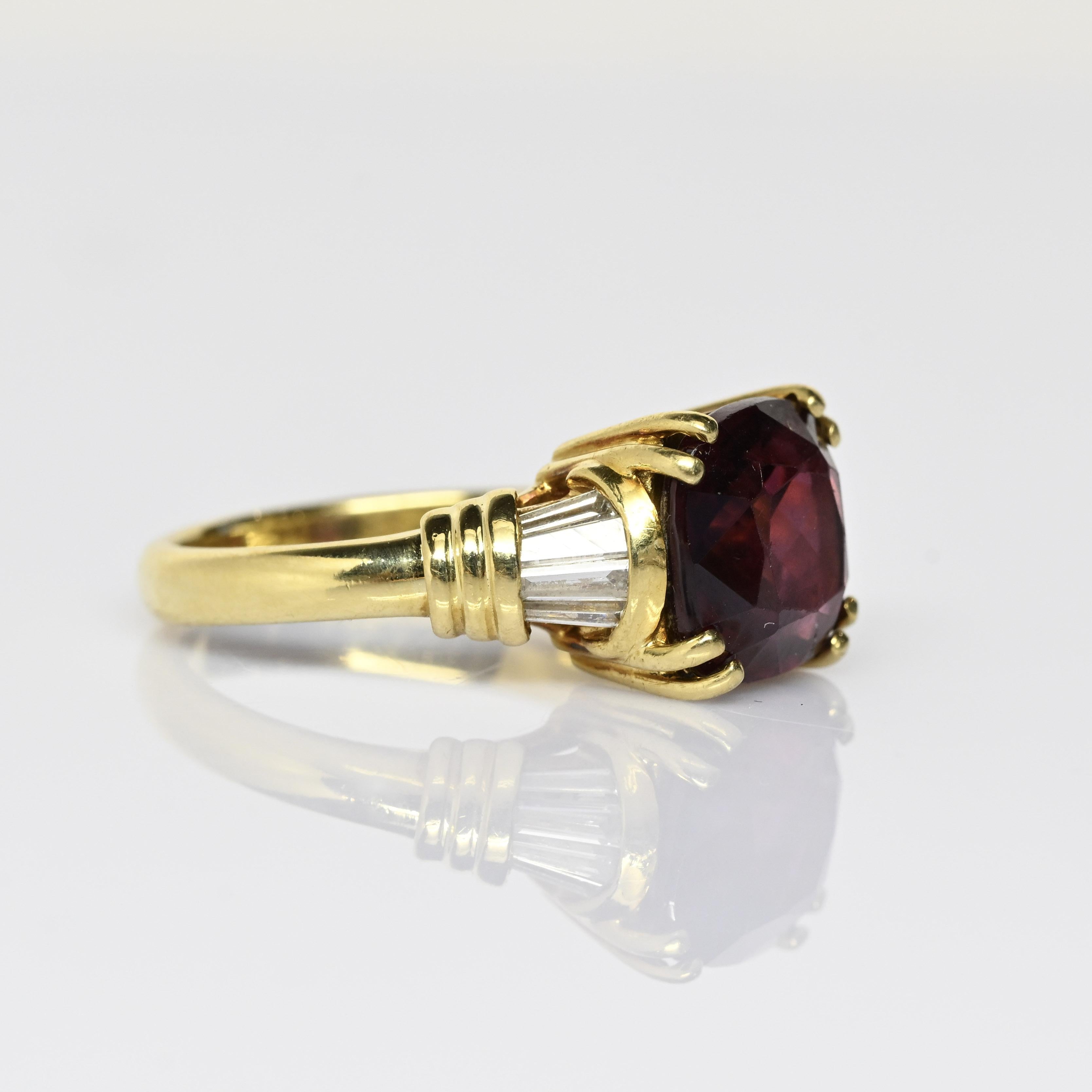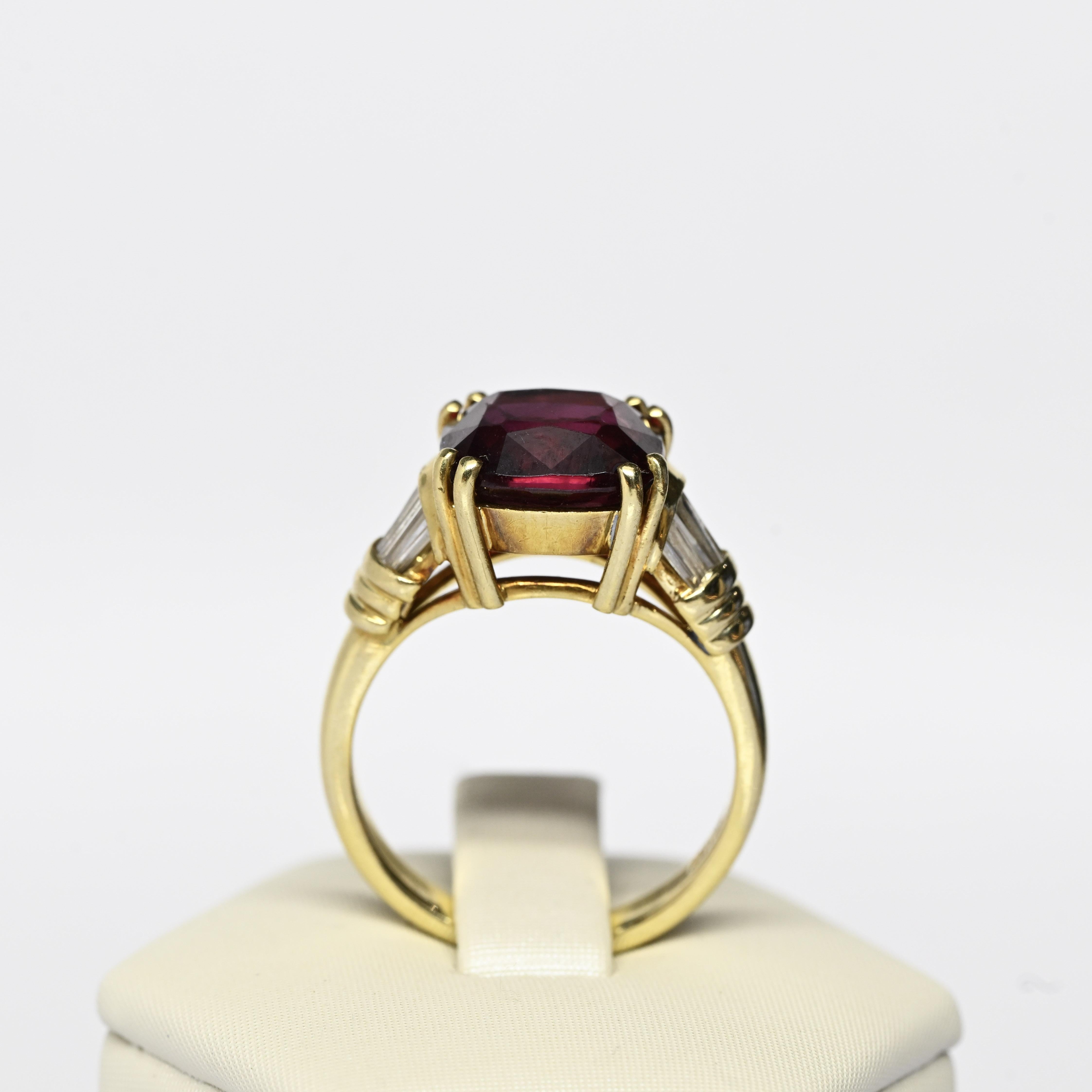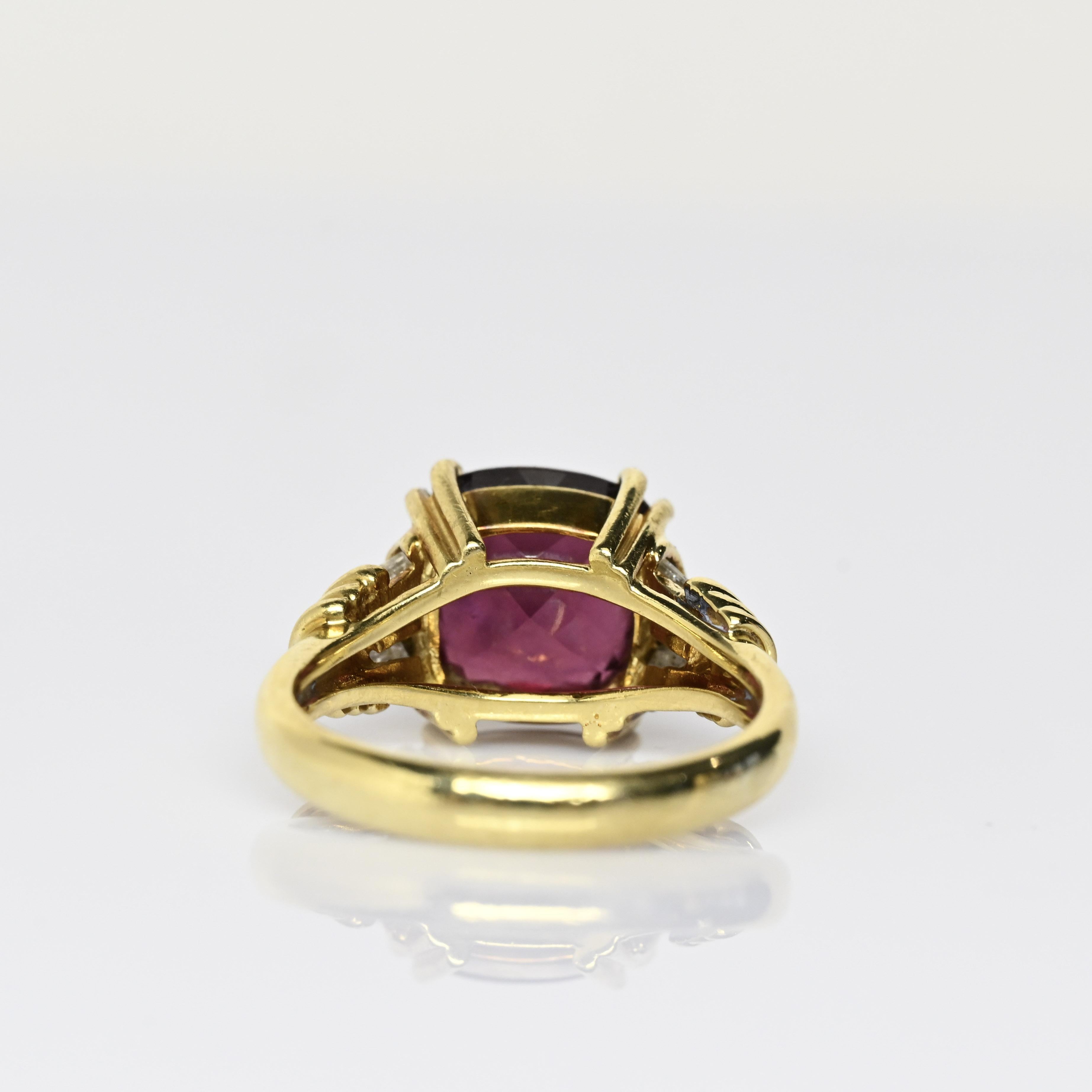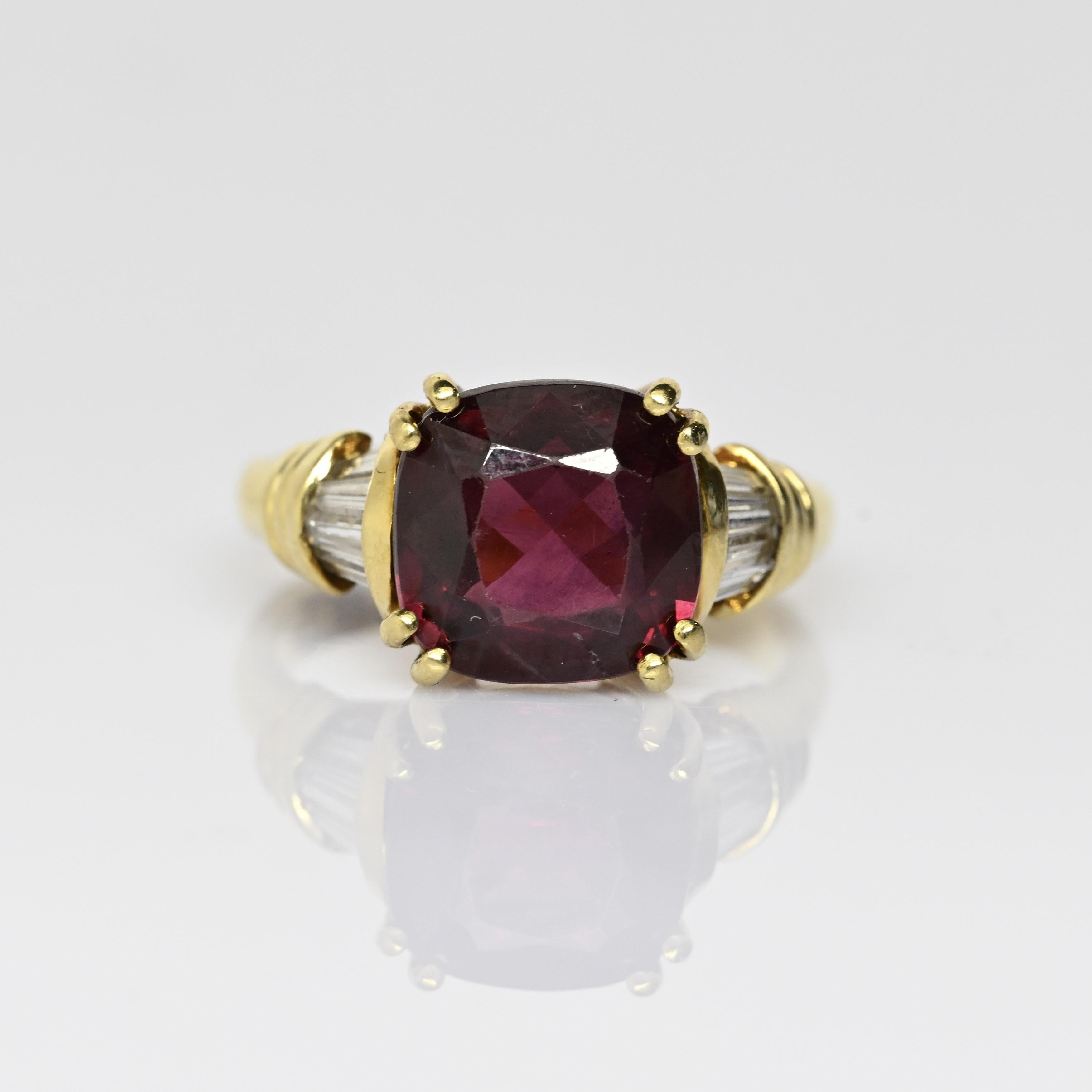 This striking Hanora Rhodolite ring is crafted in rich 18 karat yellow gold and showcases a vibrant cushion-cut rhodolite garnet at its center. The garnet displays deep raspberry and wine-red tones, beautifully complemented by tapered diamond accents along the shoulders. Elegant prong detailing and the warm gold setting enhance the stone’s natural depth and brilliance. A bold yet refined design, this ring makes a stunning statement piece with timeless appeal.