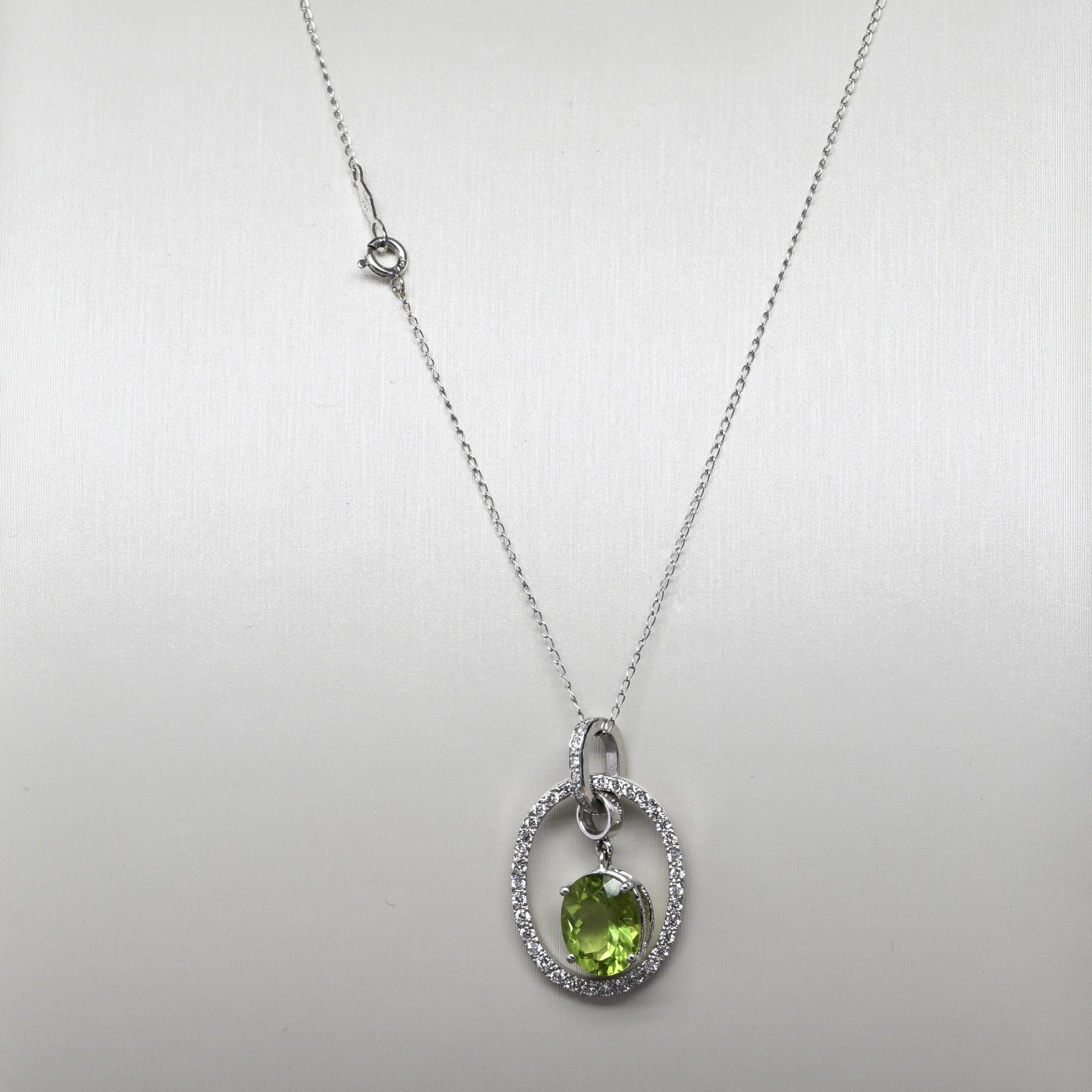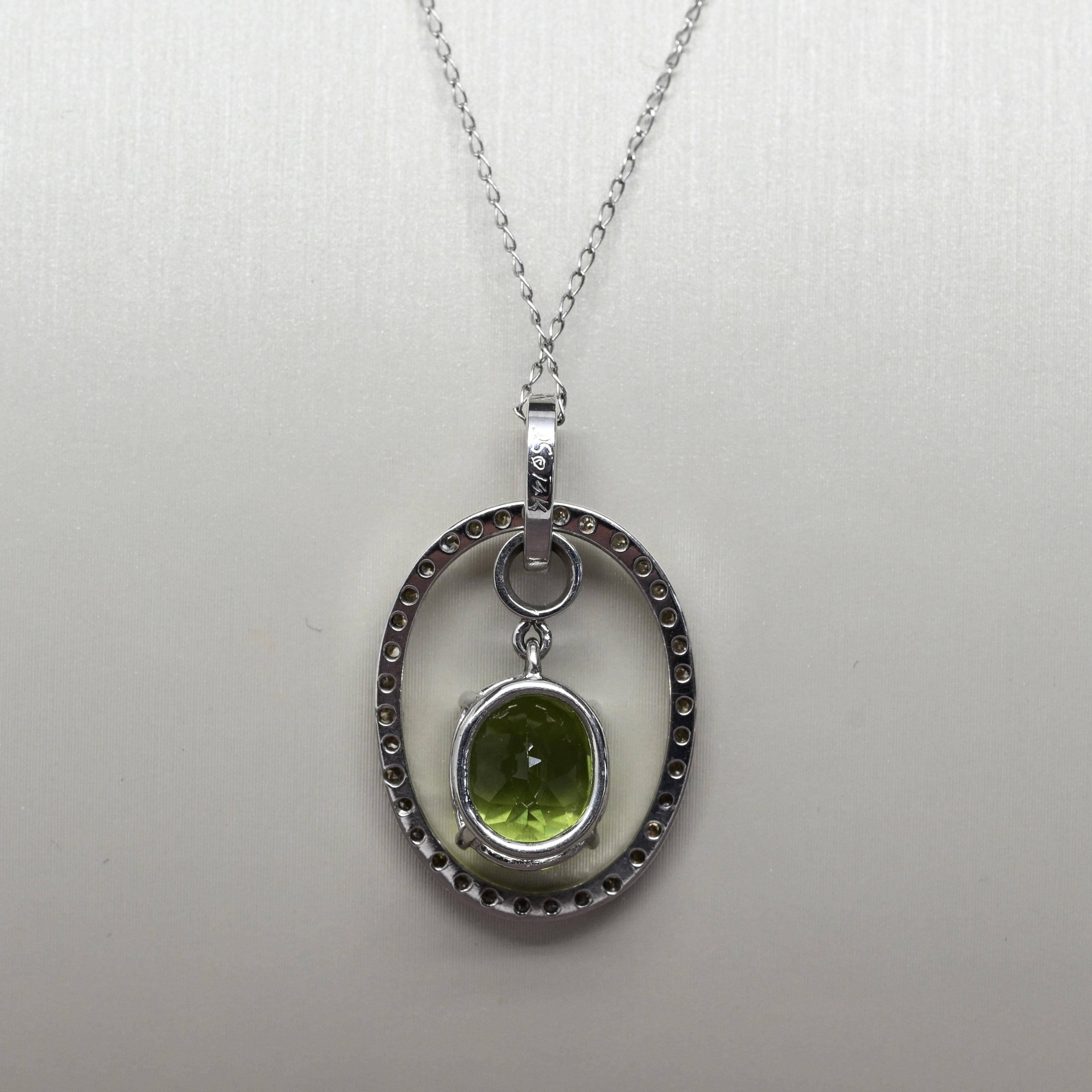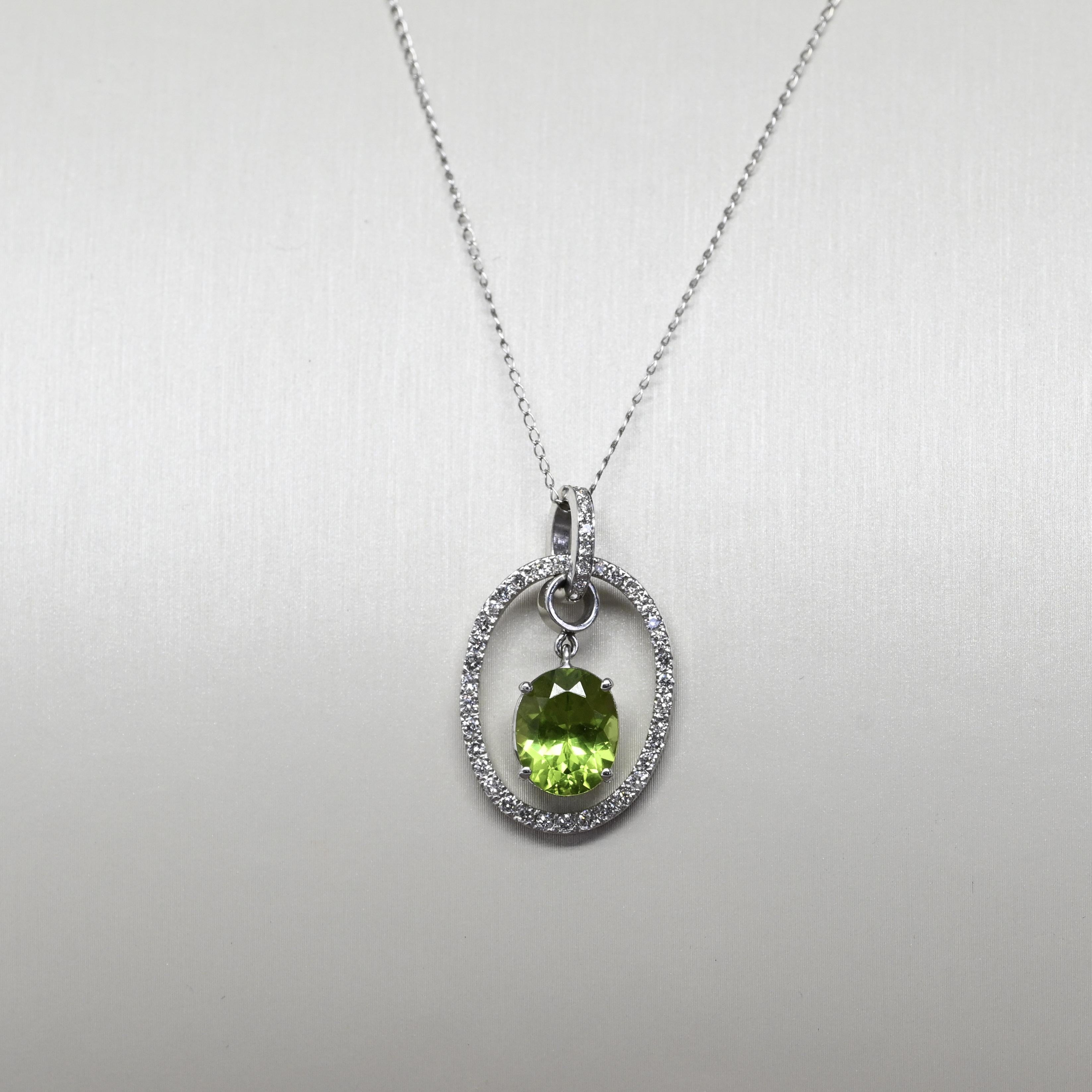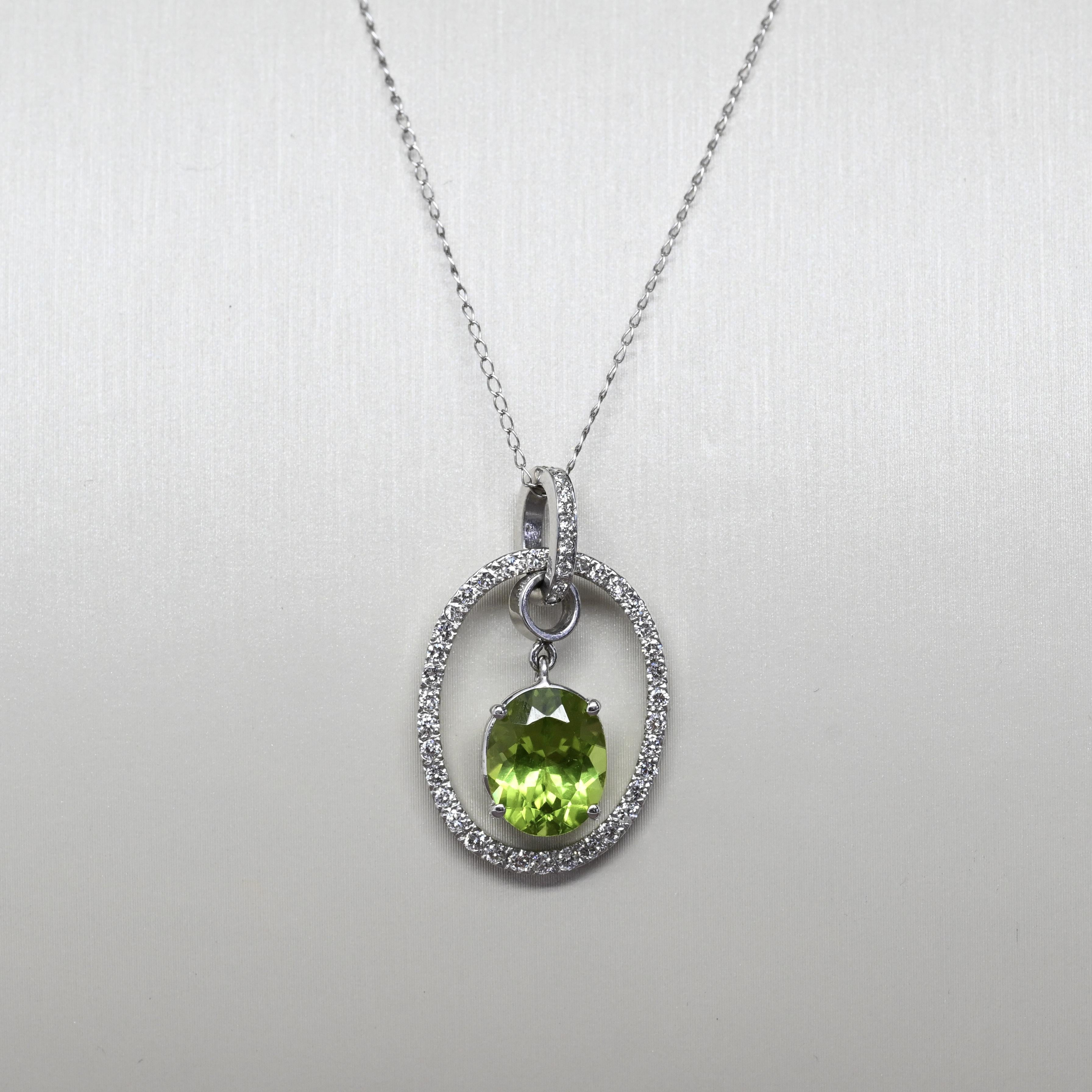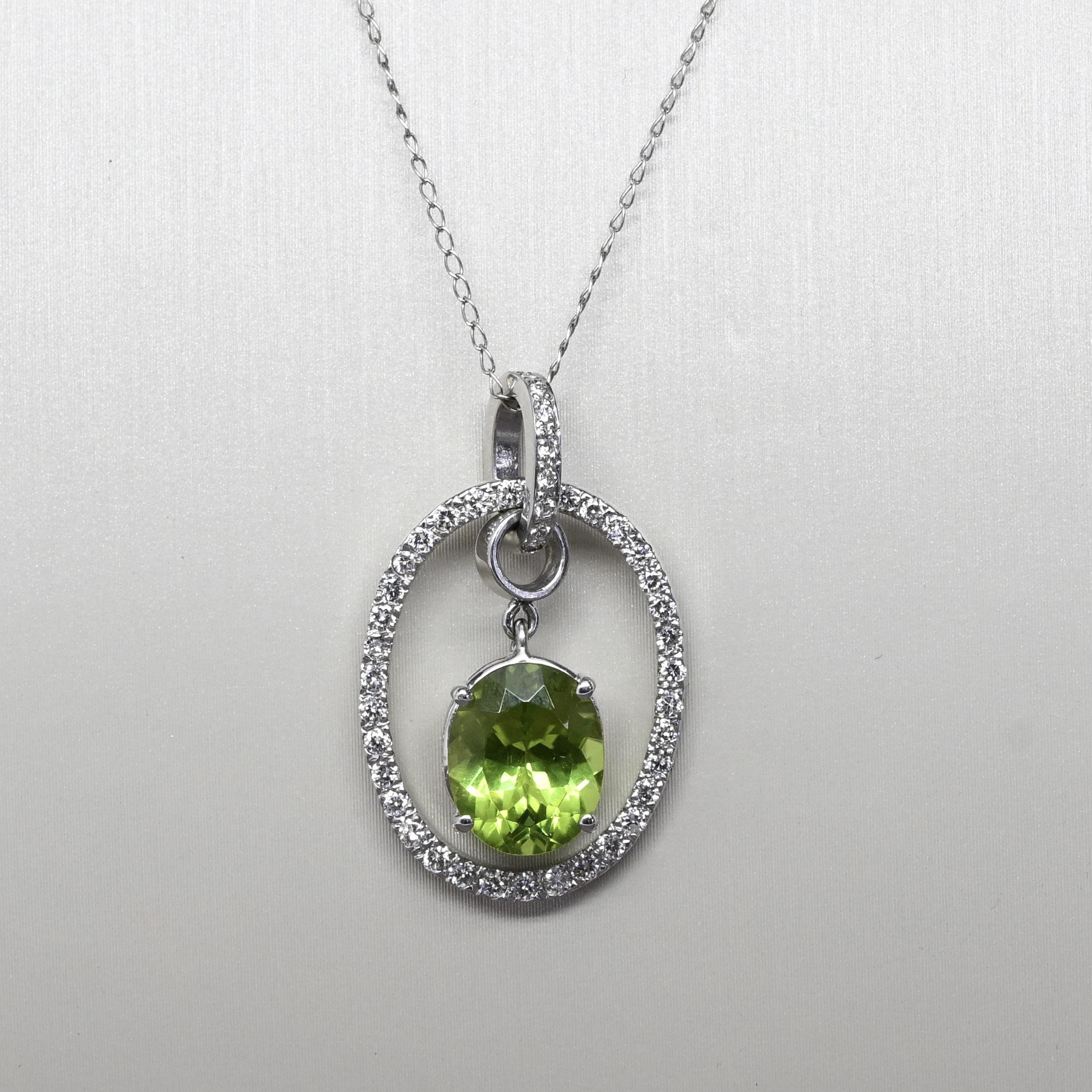 This peridot and diamond pendant necklace is a radiant blend of fresh color and timeless elegance. The centerpiece features a vibrant oval peridot that dangles gracefully within a sparkling oval frame of round diamonds, all set in polished 14k white gold. The open design adds movement and light, allowing the gemstone to catch the eye with its vivid green brilliance. Delicate yet striking, this necklace is perfect for adding a touch of luxury to both everyday and special occasion looks.