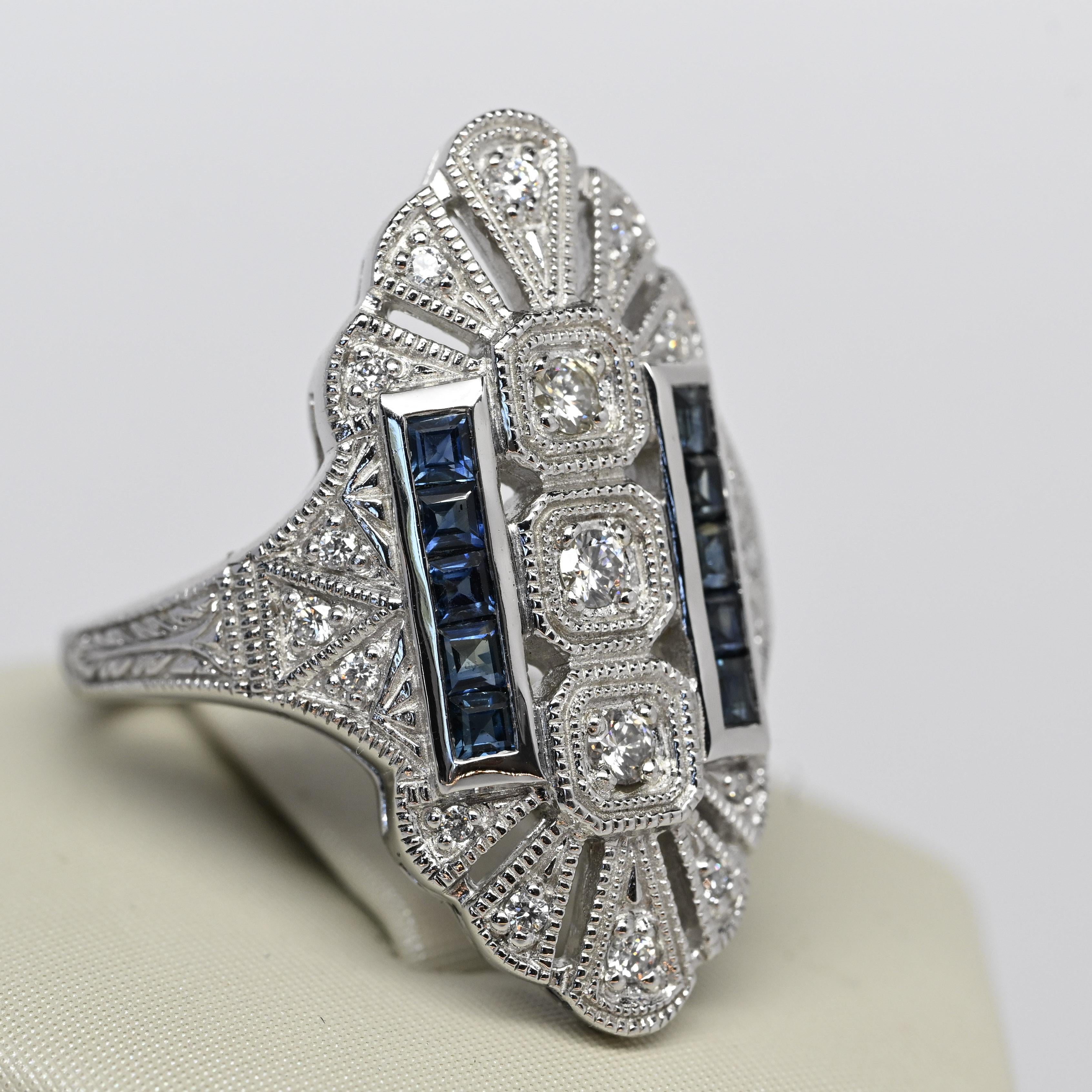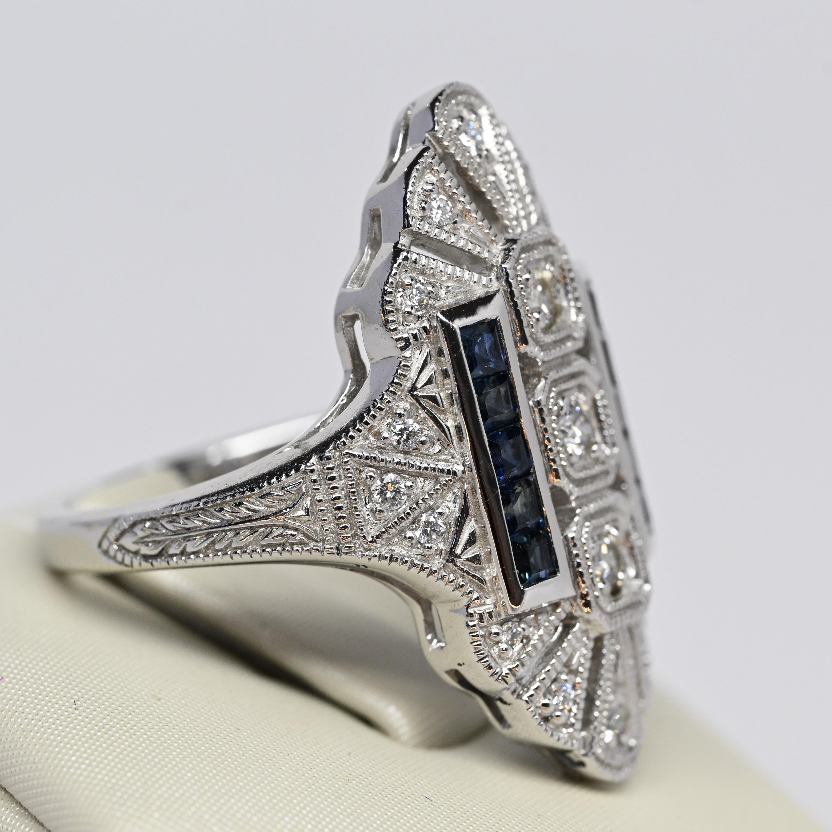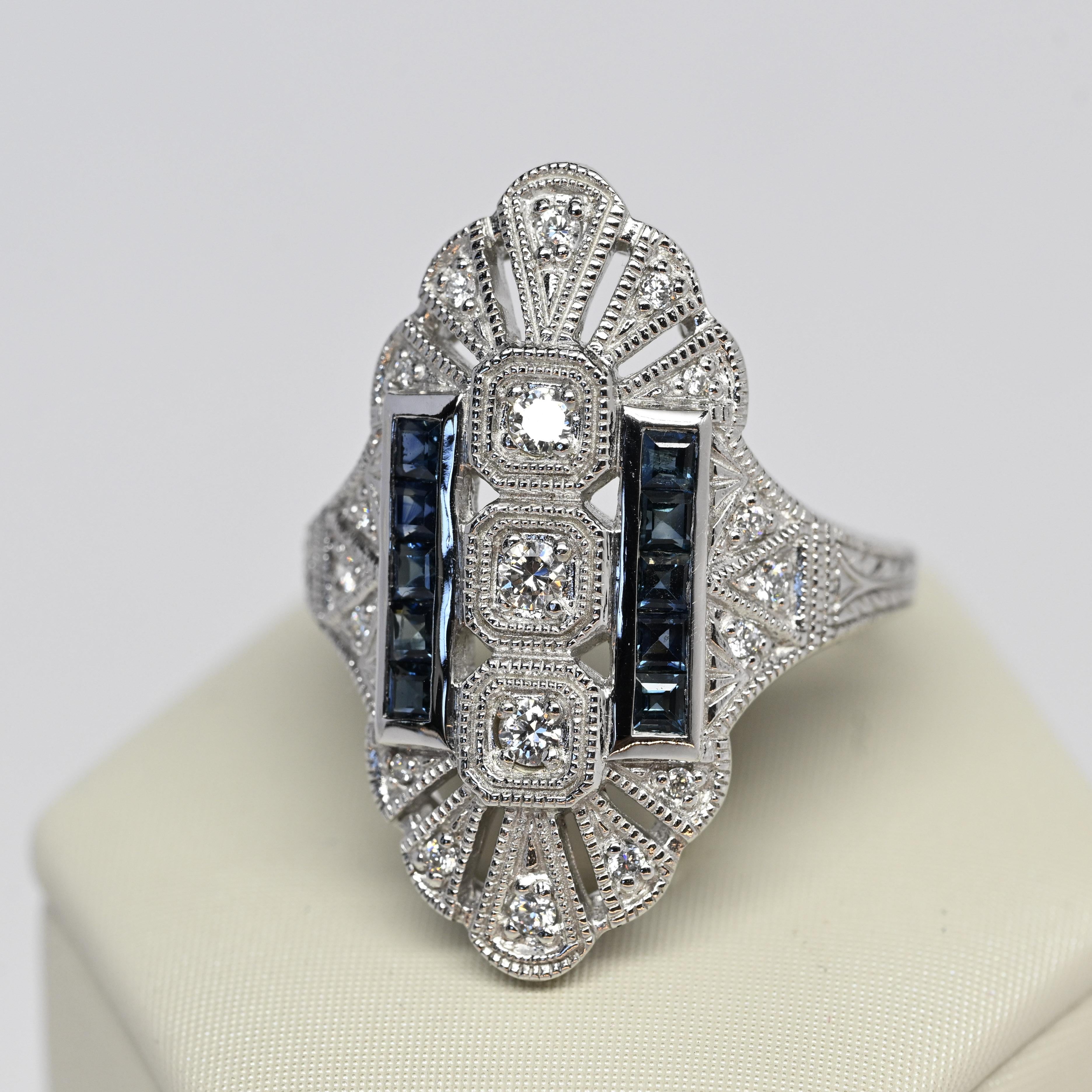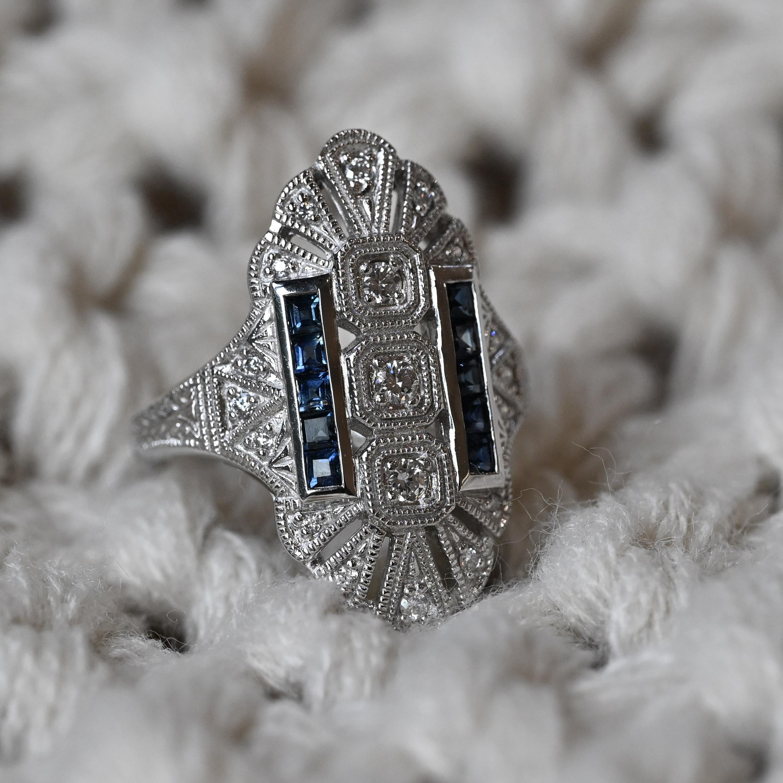 This Art Deco reproduction shield ring made by Trufili beautifully captures the bold elegance of the 1920s. Crafted in white gold, it showcases a geometric shield design set with sparkling round diamonds framed by intricate milgrain detailing. Two vertical rows of deep blue square-cut sapphires add striking contrast and symmetry. A perfect blend of vintage charm and timeless sophistication, this ring makes a dazzling statement piece or unique engagement choice.