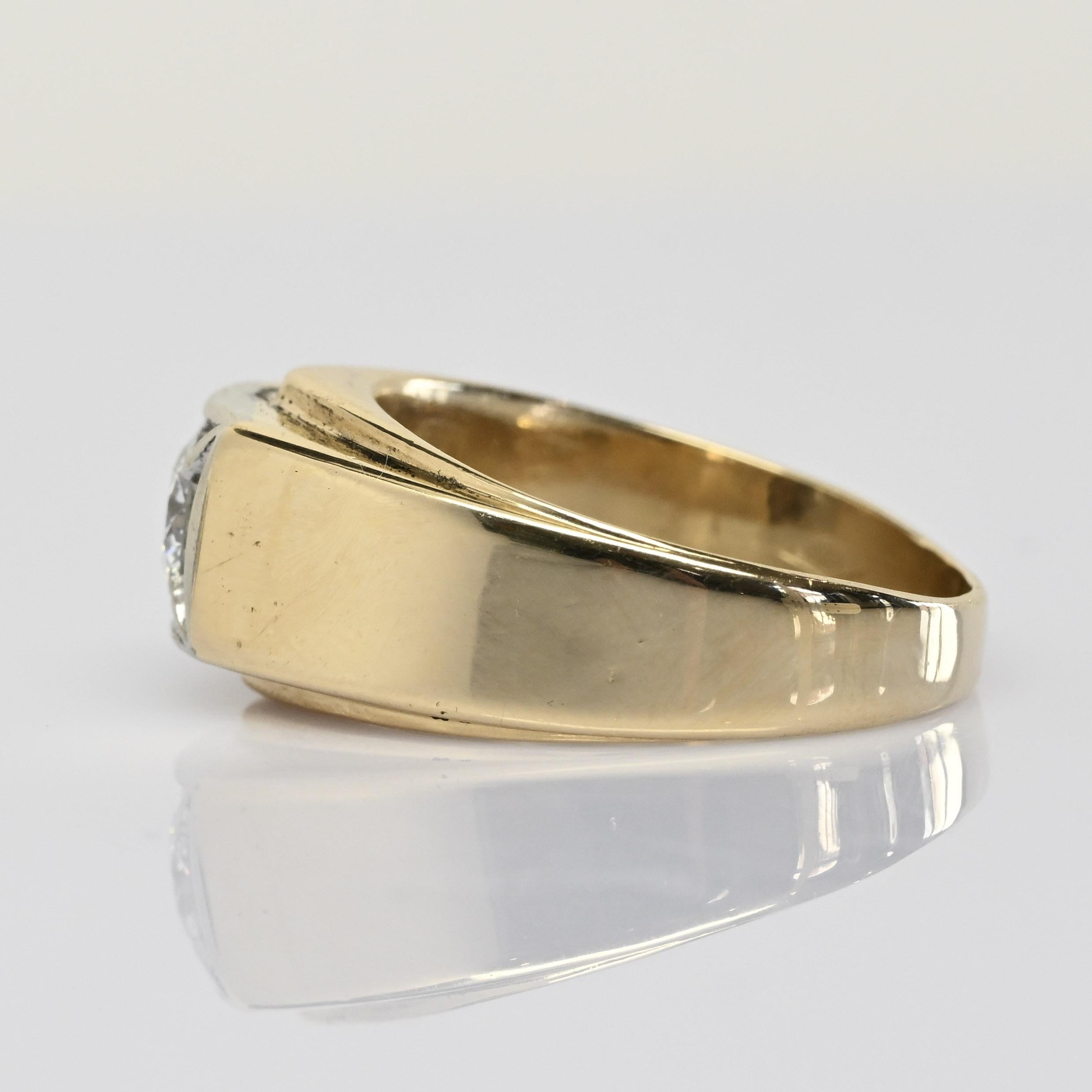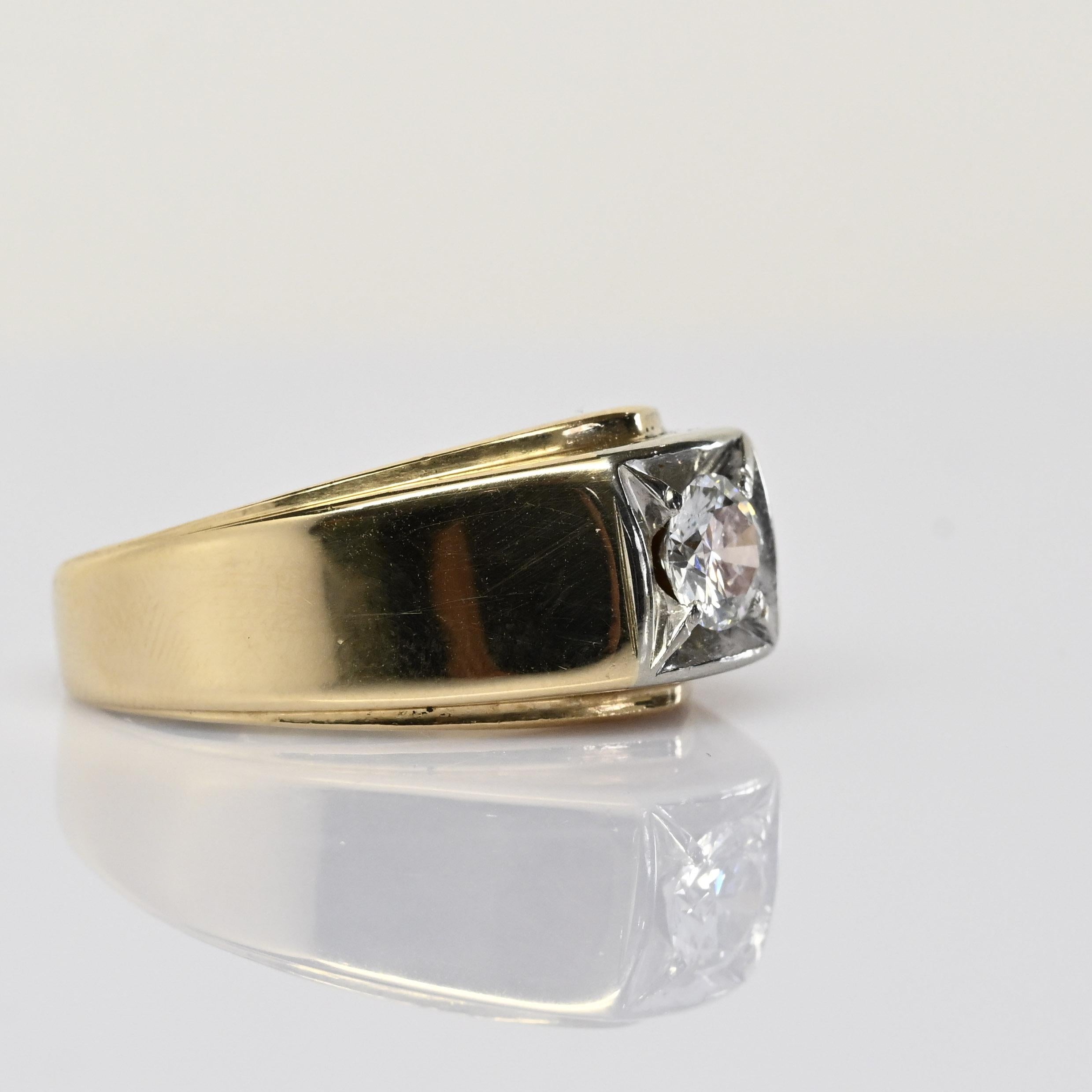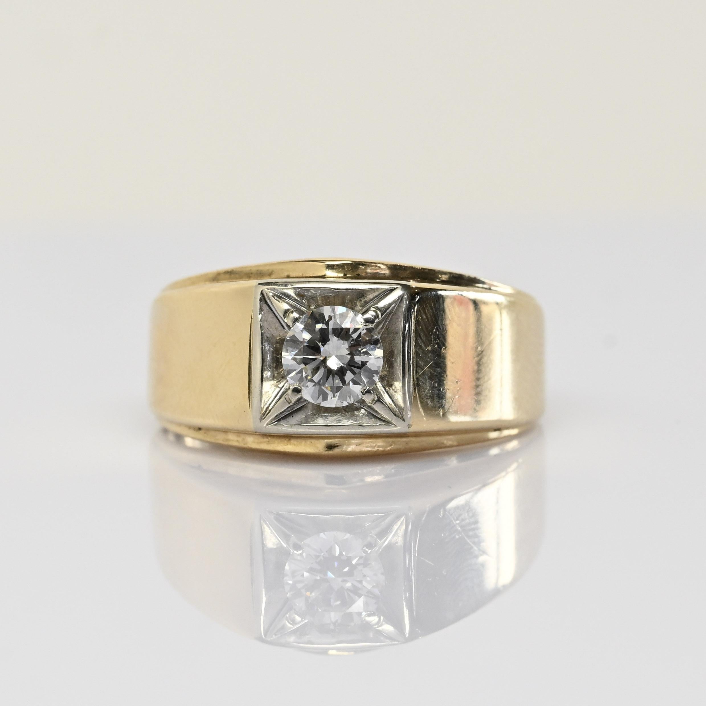 This vintage men’s ring showcases a striking 0.6ct diamond set in a crisp square illusion-style frame that enhances its brilliance. Crafted in rich 14k yellow gold, the bold, smooth band offers a classic and substantial feel. The diamond’s vintage cut adds character with its warm sparkle and hand-crafted charm. A timeless piece with distinguished presence, it’s perfect as a signature ring or meaningful heirloom.