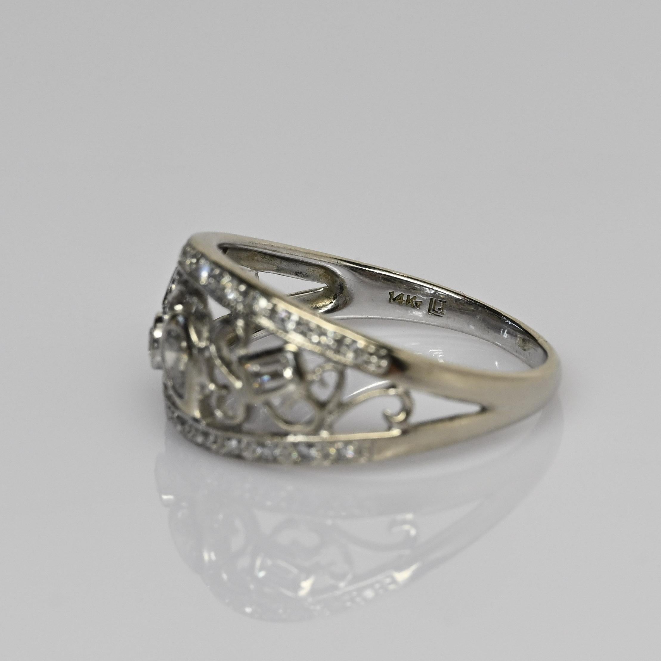 This white gold filigree diamond band is a graceful blend of artistry and sparkle. The openwork filigree design swirls with delicate detail, framing a mix of round, pear, and geometric diamond settings for a unique, romantic look. A row of accent diamonds lines the edges, adding extra brilliance and shimmer. Elegant and timeless, this band makes a stunning choice for a wedding ring, anniversary gift, or right-hand statement piece.