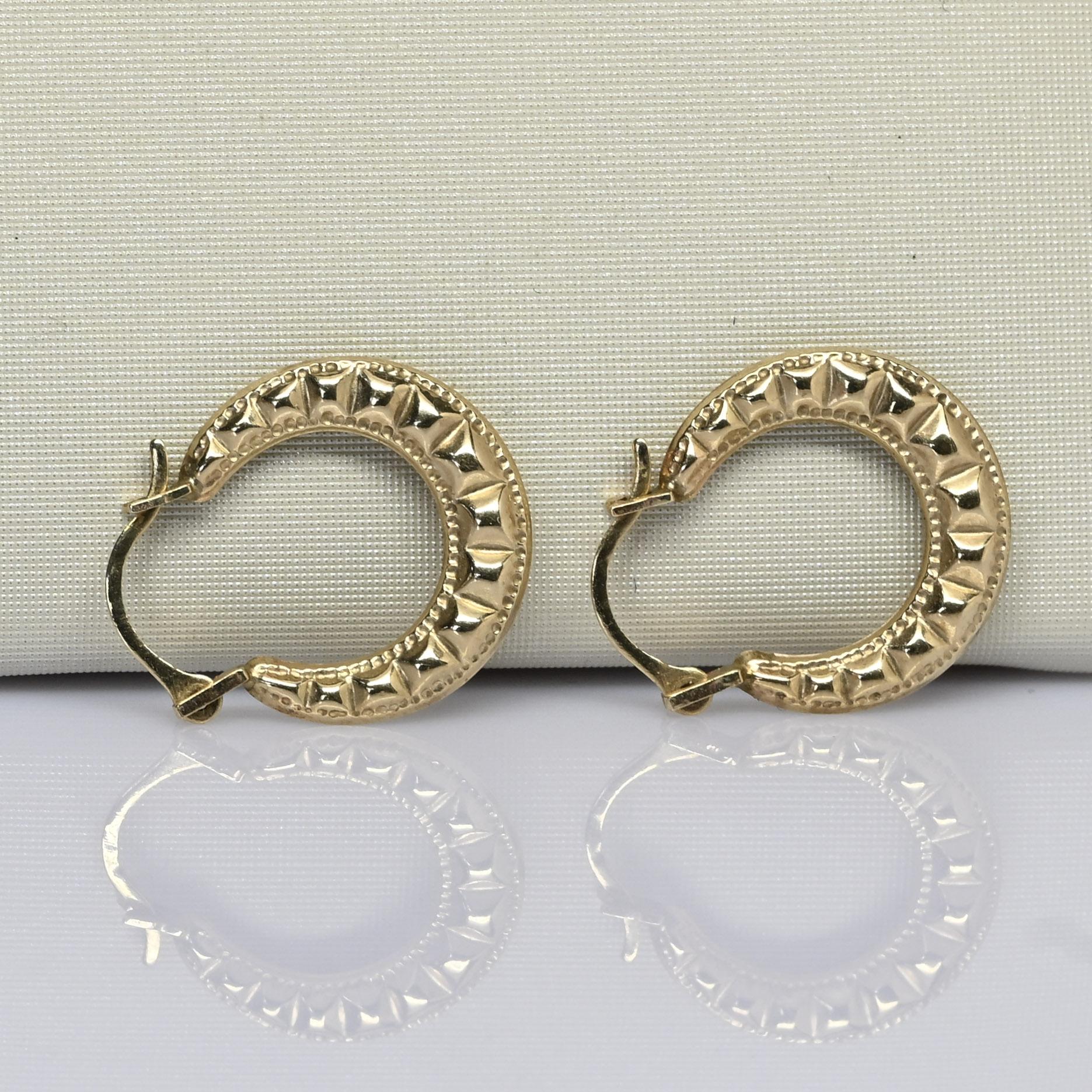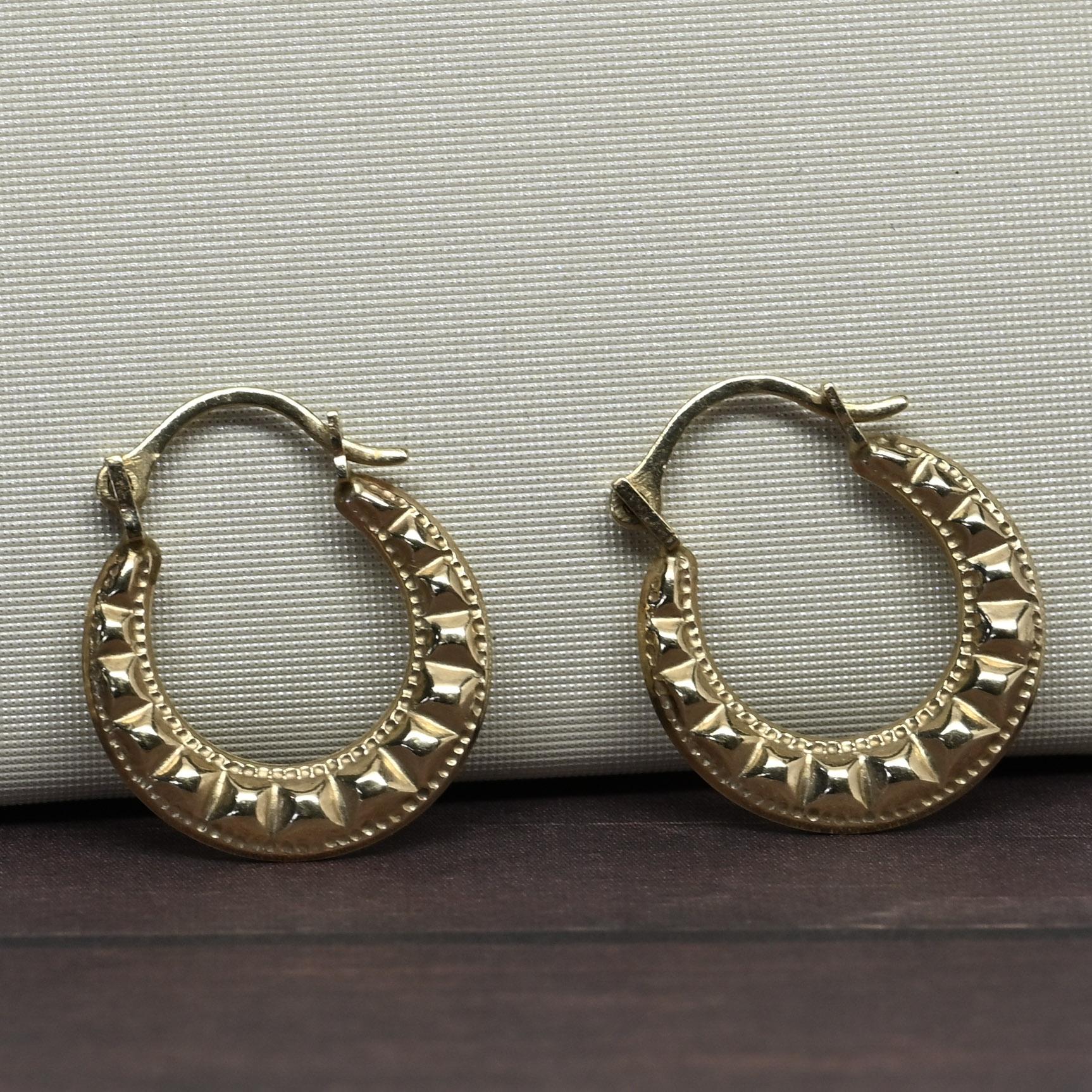 These vintage 10K gold earrings feature a charming crescent hoop design with intricate embossed detailing that captures light beautifully. Their textured pattern adds depth and character, evoking a timeless, old-world elegance. Lightweight and comfortable to wear, they offer just the right touch of vintage allure for any occasion. Perfect for collectors or anyone who appreciates classic craftsmanship with a hint of bohemian flair.