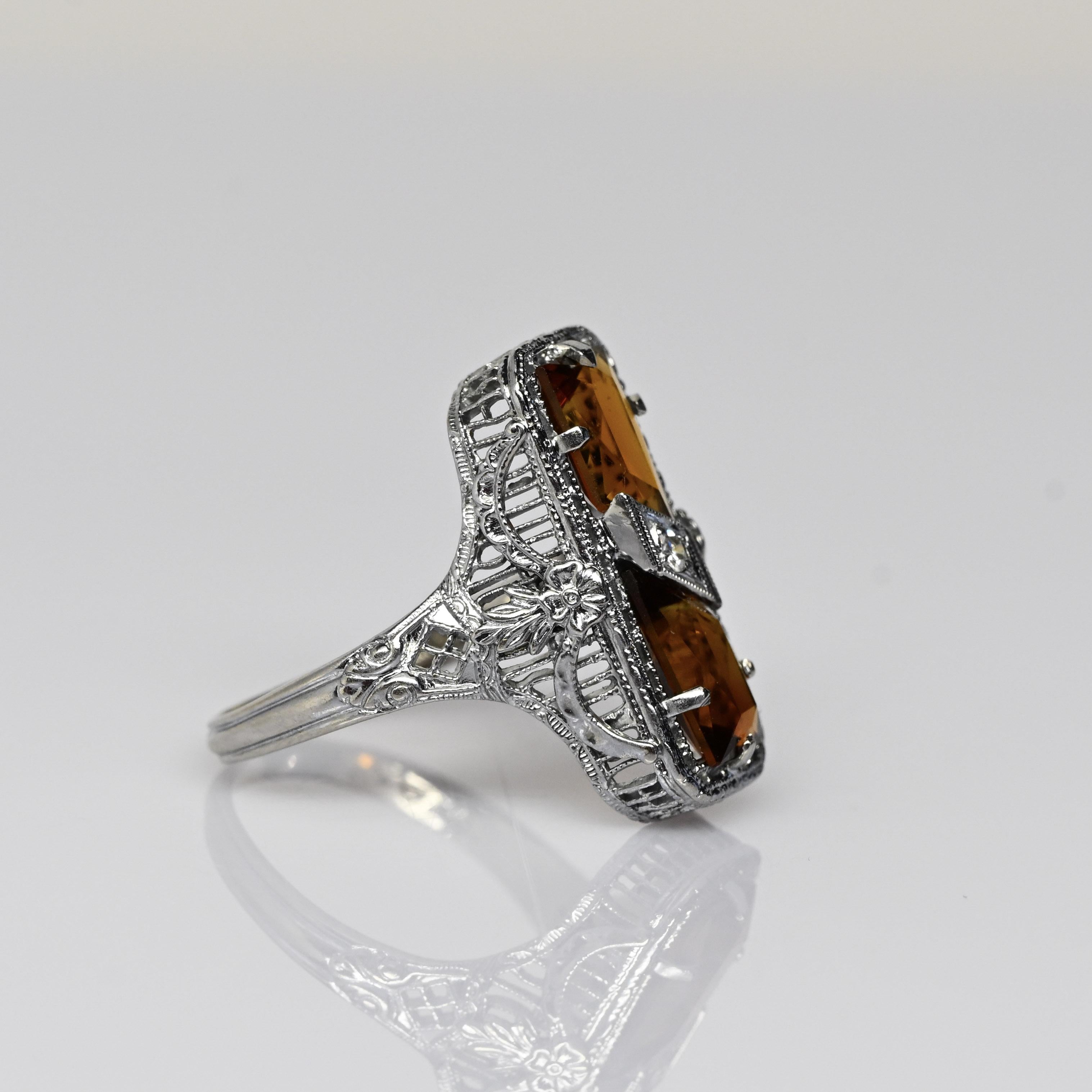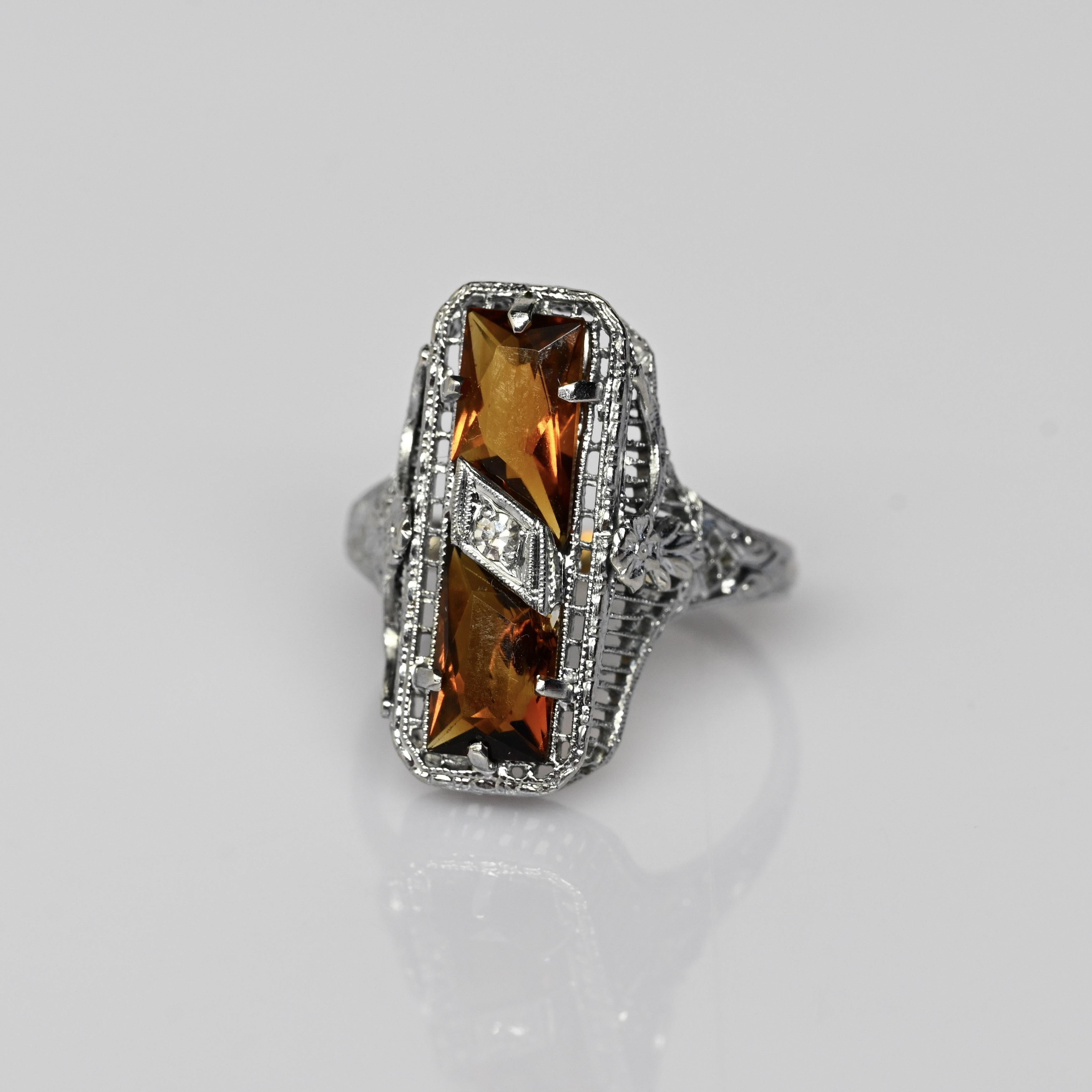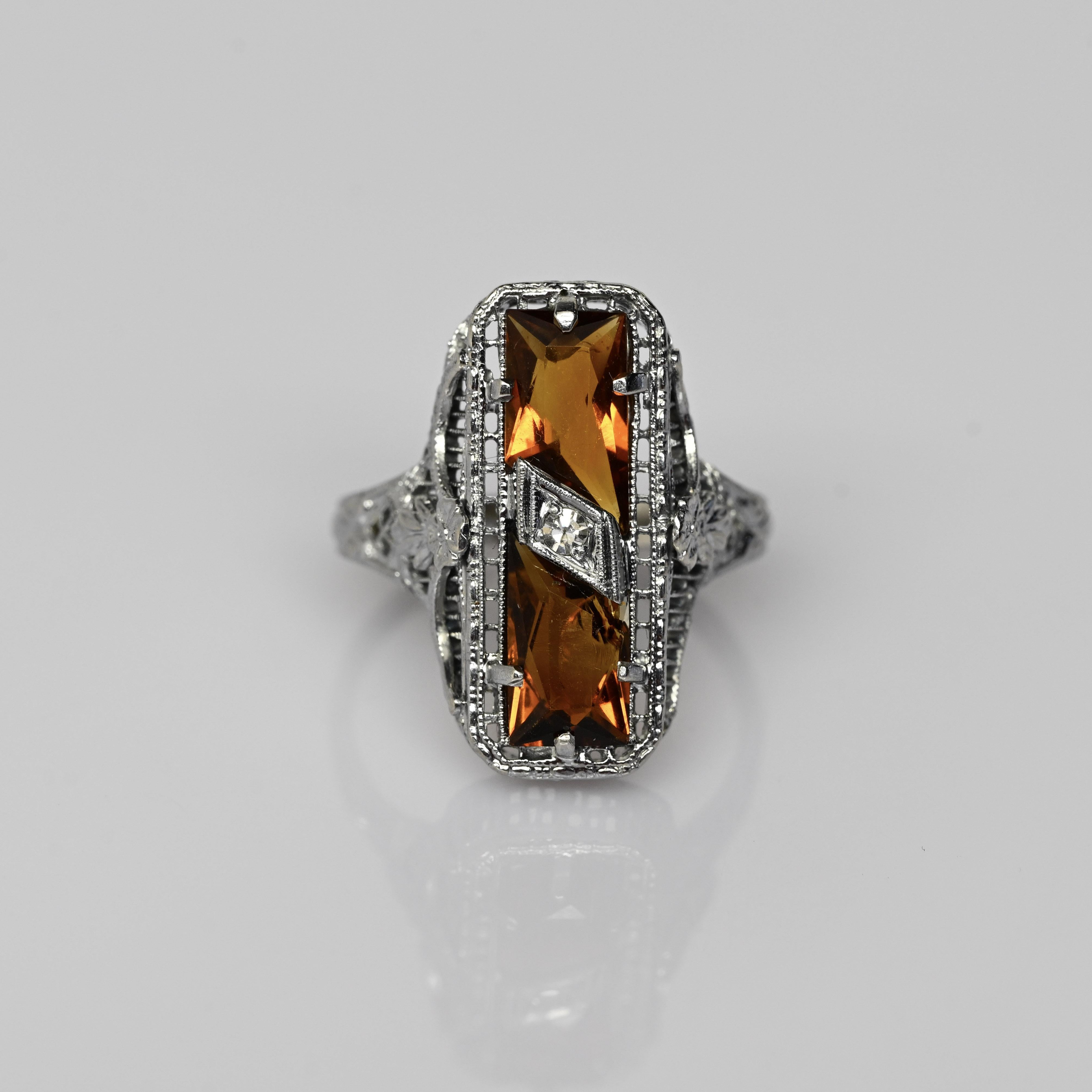 This exquisite Art Deco ring is crafted in 14 karat white gold and showcases two rich, amber-toned citrine gemstones set vertically for striking symmetry. Intricate open filigree work and fine milgrain detailing frame the stones, highlighting the refined craftsmanship characteristic of the Art Deco era. A single diamond accent set in a geometric lozenge adds a touch of brilliance and contrast at the center. Elegant and architectural, this ring is a standout antique piece with timeless sophistication and bold vintage charm.