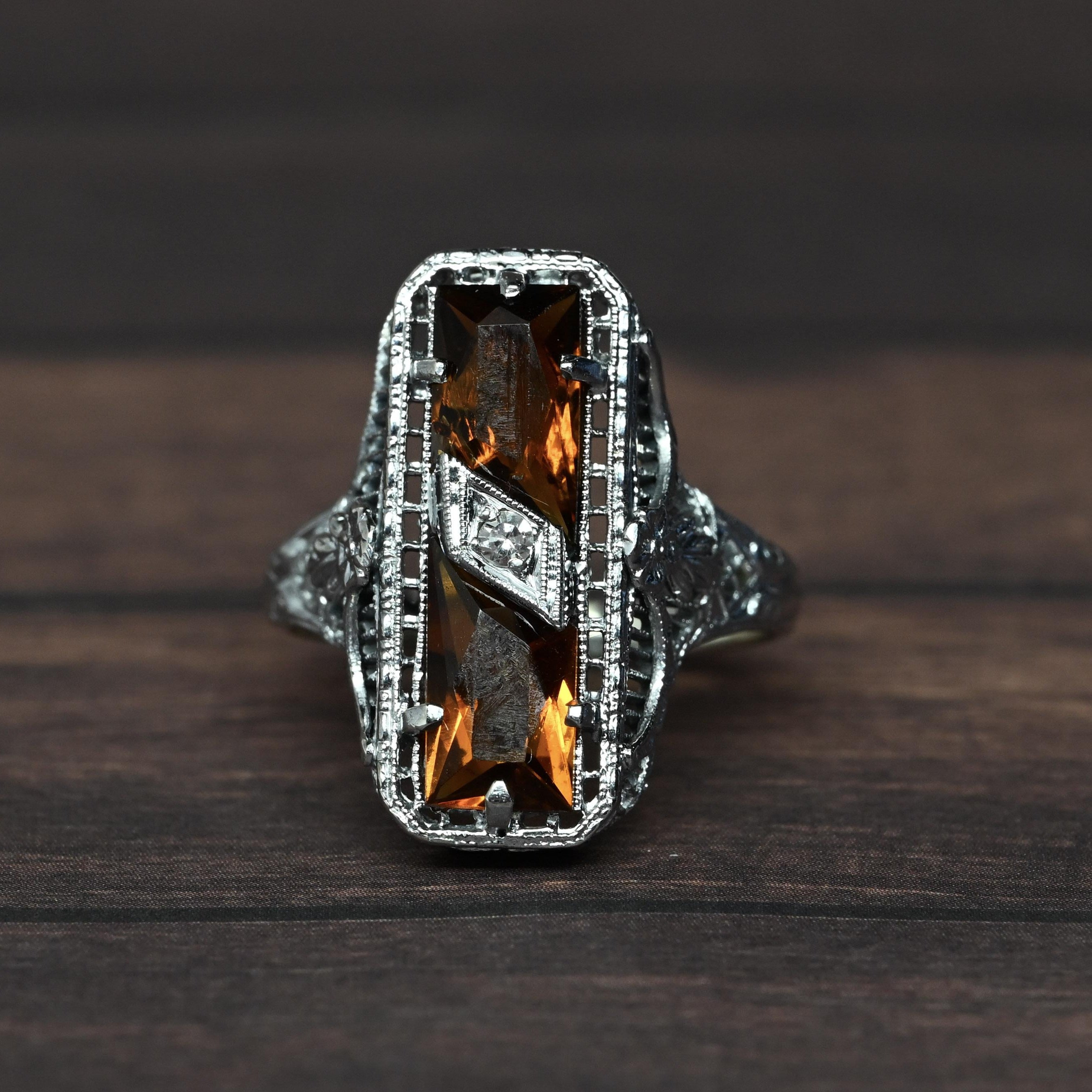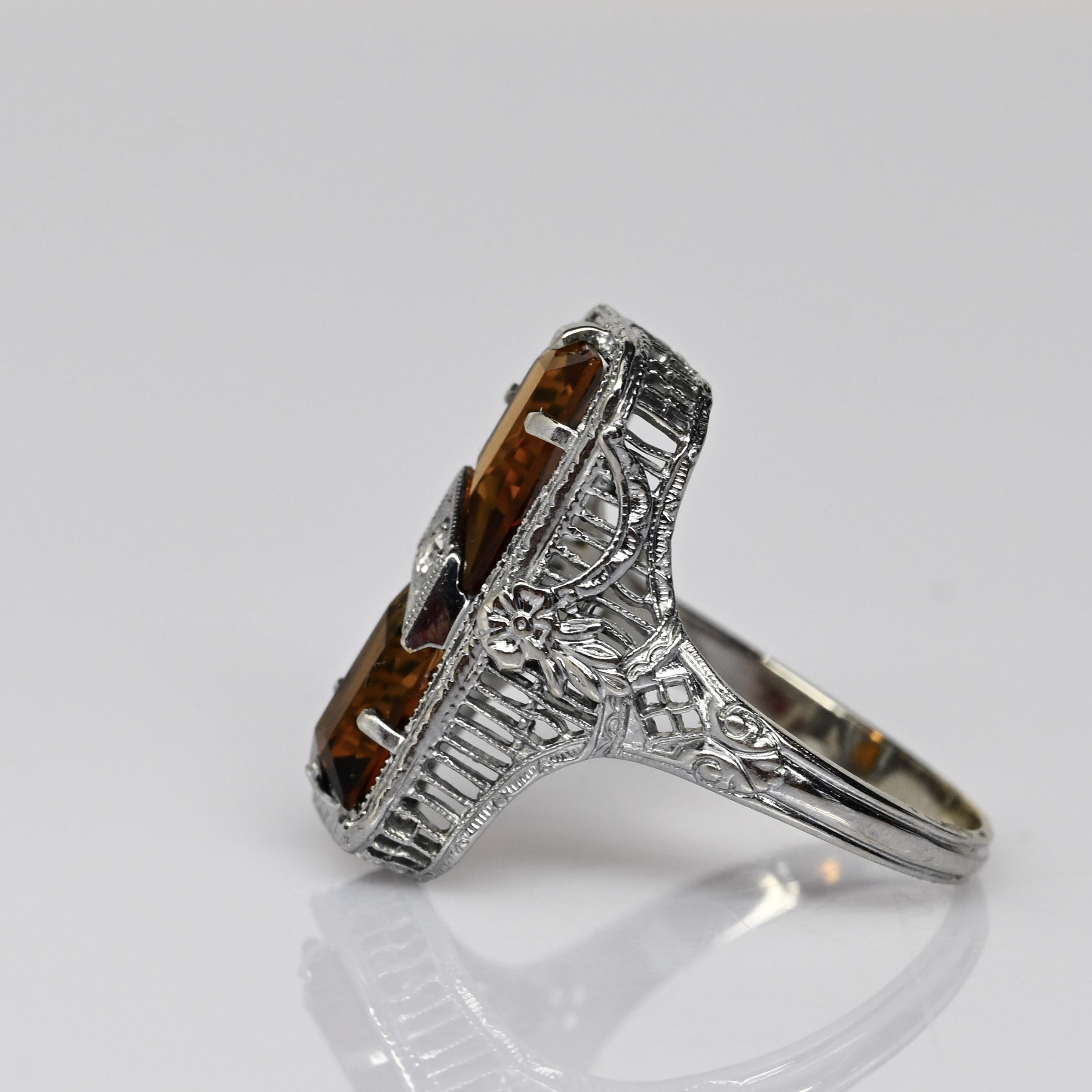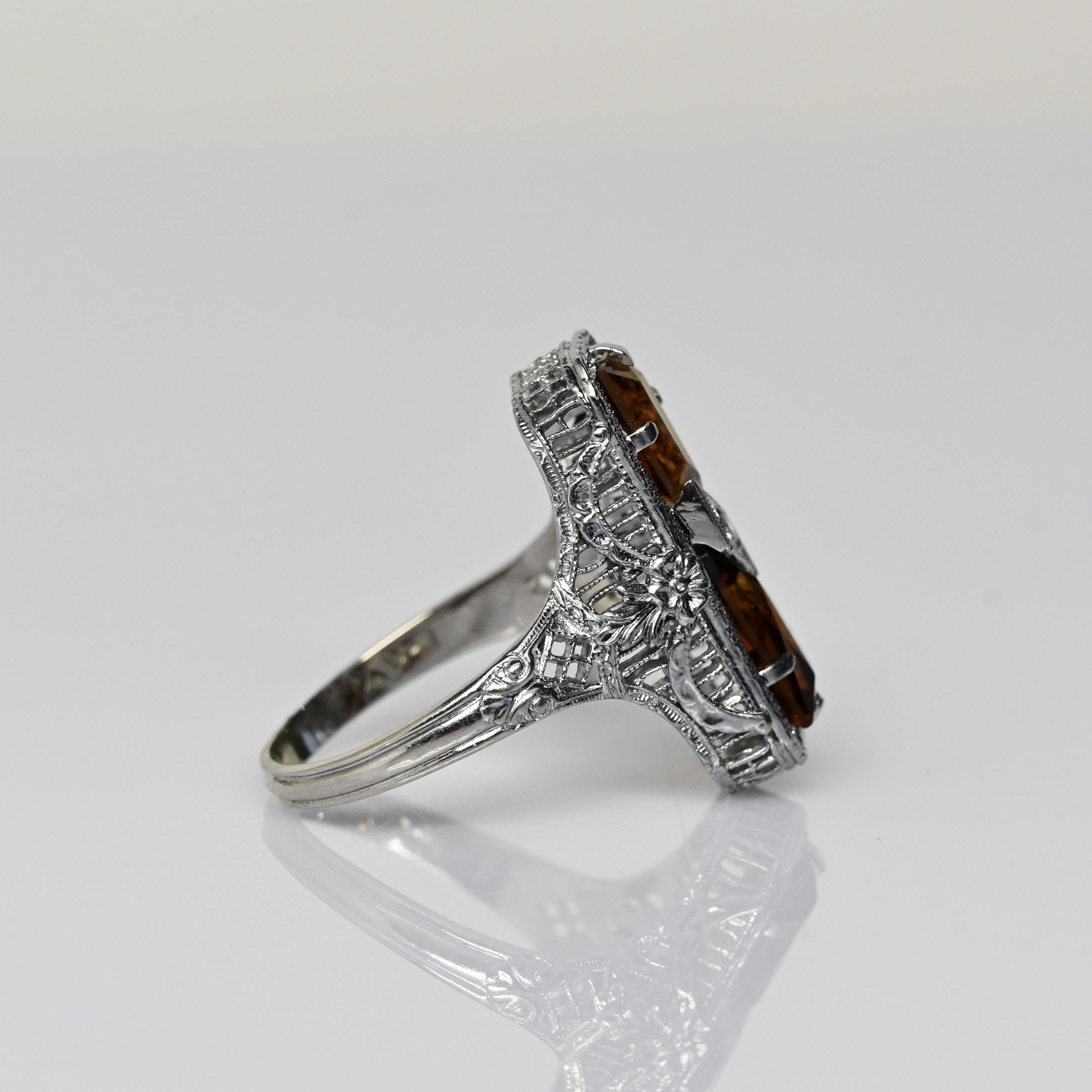This exquisite Art Deco ring is crafted in 14 karat white gold and showcases two rich, amber-toned citrine gemstones set vertically for striking symmetry. Intricate open filigree work and fine milgrain detailing frame the stones, highlighting the refined craftsmanship characteristic of the Art Deco era. A single diamond accent set in a geometric lozenge adds a touch of brilliance and contrast at the center. Elegant and architectural, this ring is a standout antique piece with timeless sophistication and bold vintage charm.