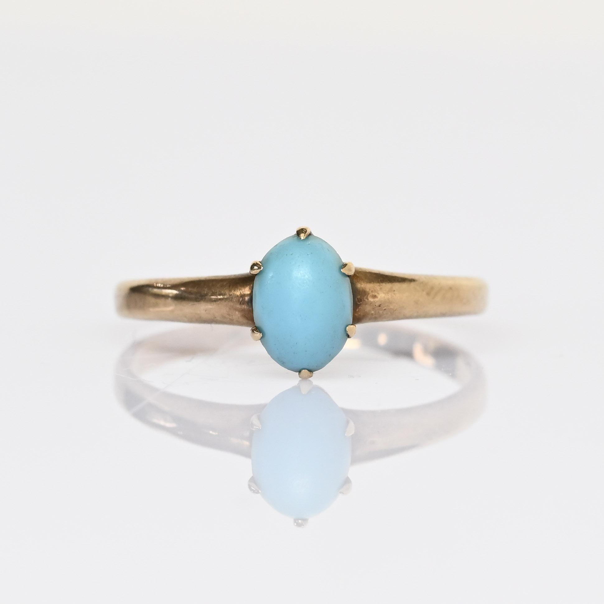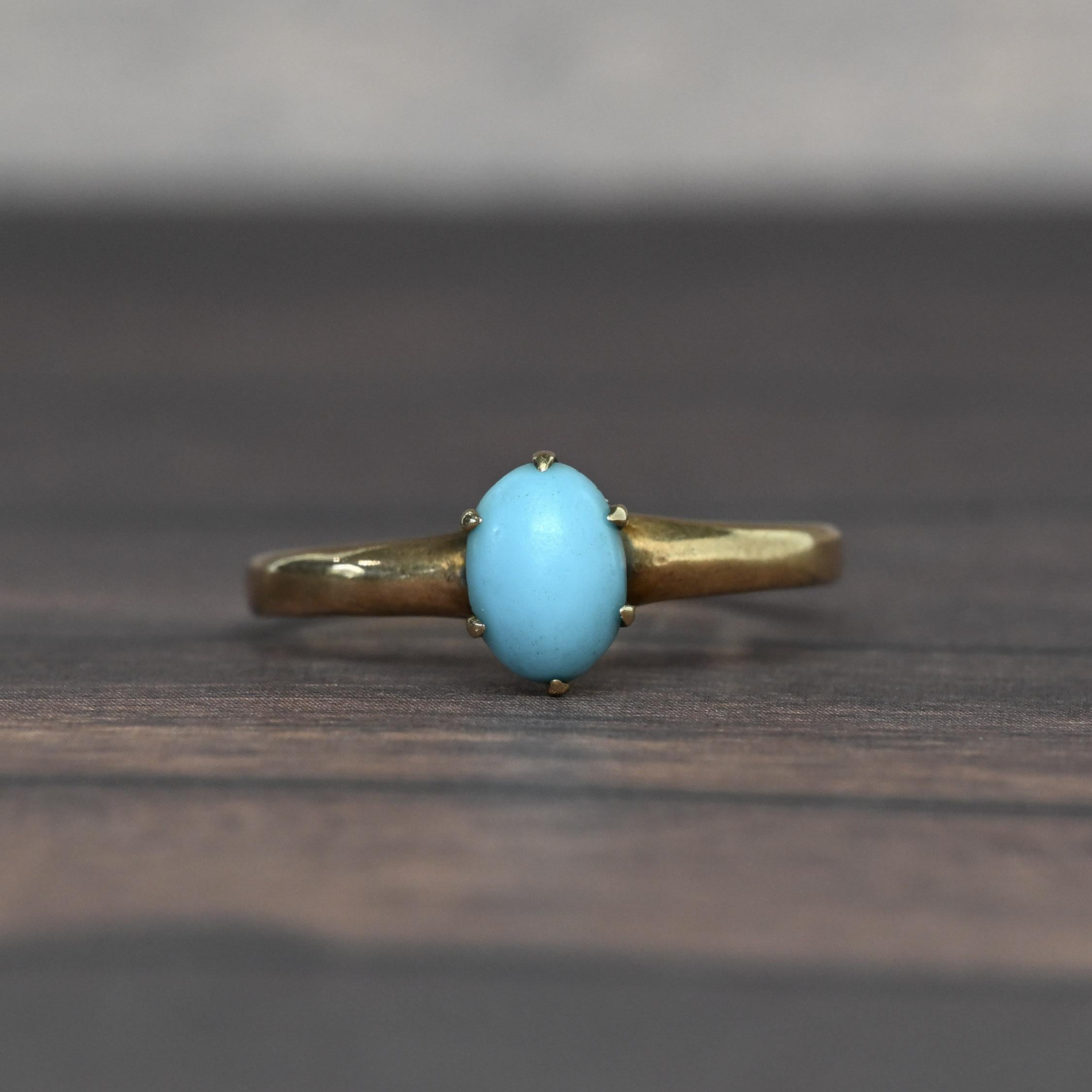 This antique solitaire ring features a vibrant oval turquoise cabochon, held securely by bold talon prongs that give it a distinctive and dramatic presence. Set in warm yellow gold, the design balances simplicity with striking detail, allowing the turquoise’s natural sky-blue color to shine. A timeless piece, it embodies classic antique craftsmanship and makes a unique statement of elegance and history.