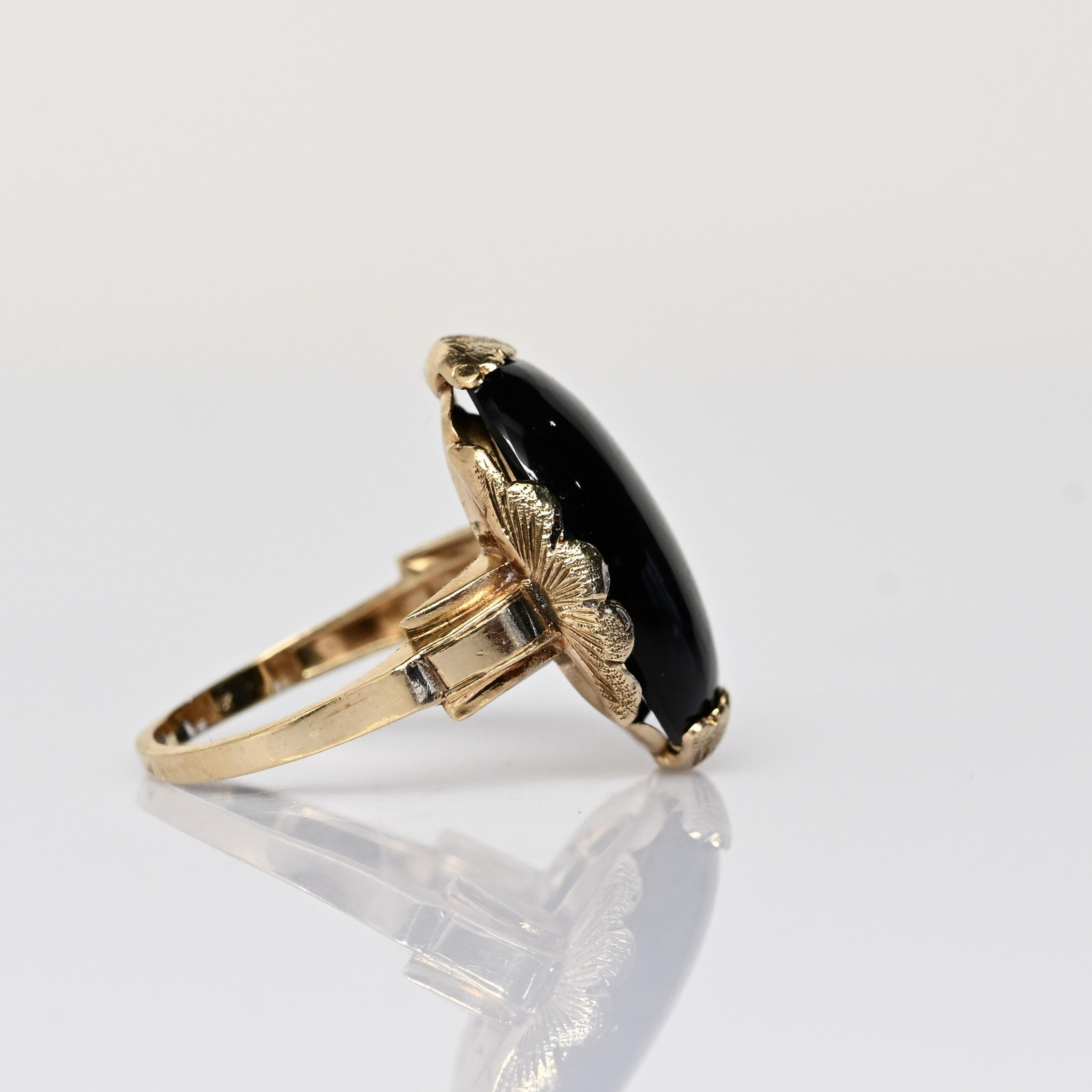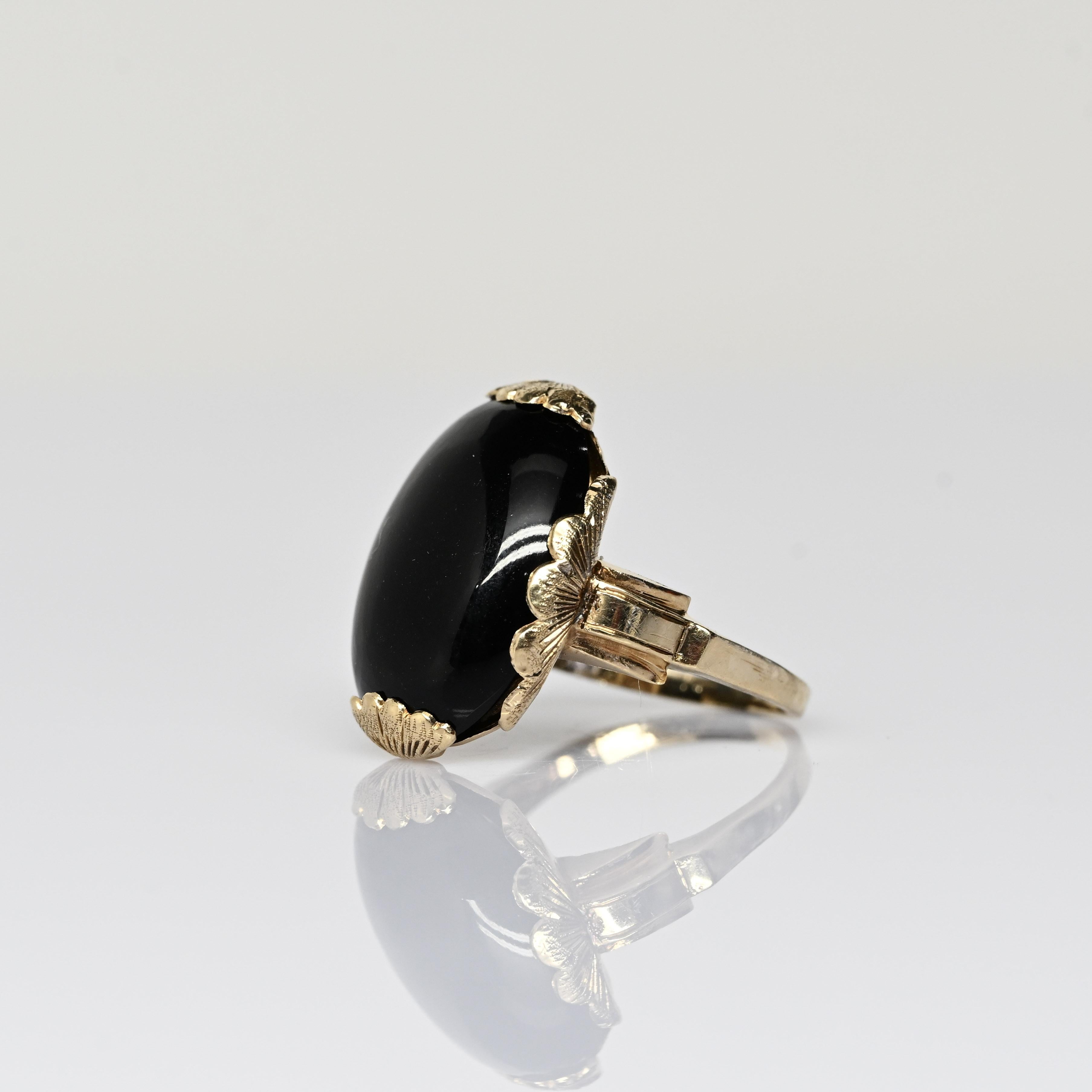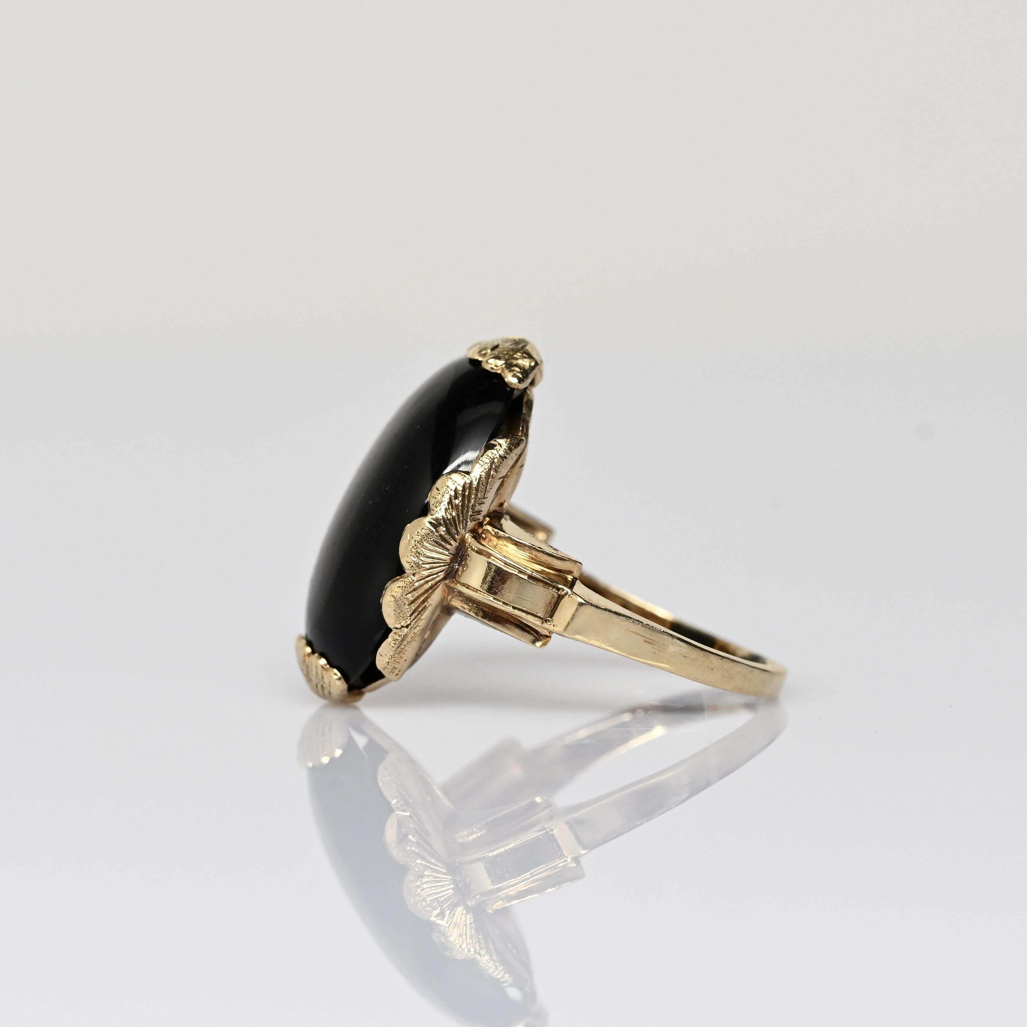This striking Art Deco onyx ring features a bold, high-polish black onyx set in warm yellow gold, creating a dramatic and timeless contrast. The elongated oval stone is framed by a decorative scalloped setting, showcasing the clean lines and sculptural elegance characteristic of the Art Deco era. A split-shank band adds architectural interest while enhancing the ring’s substantial presence on the hand. Confident and sophisticated, this ring is a standout statement piece with enduring vintage appeal.