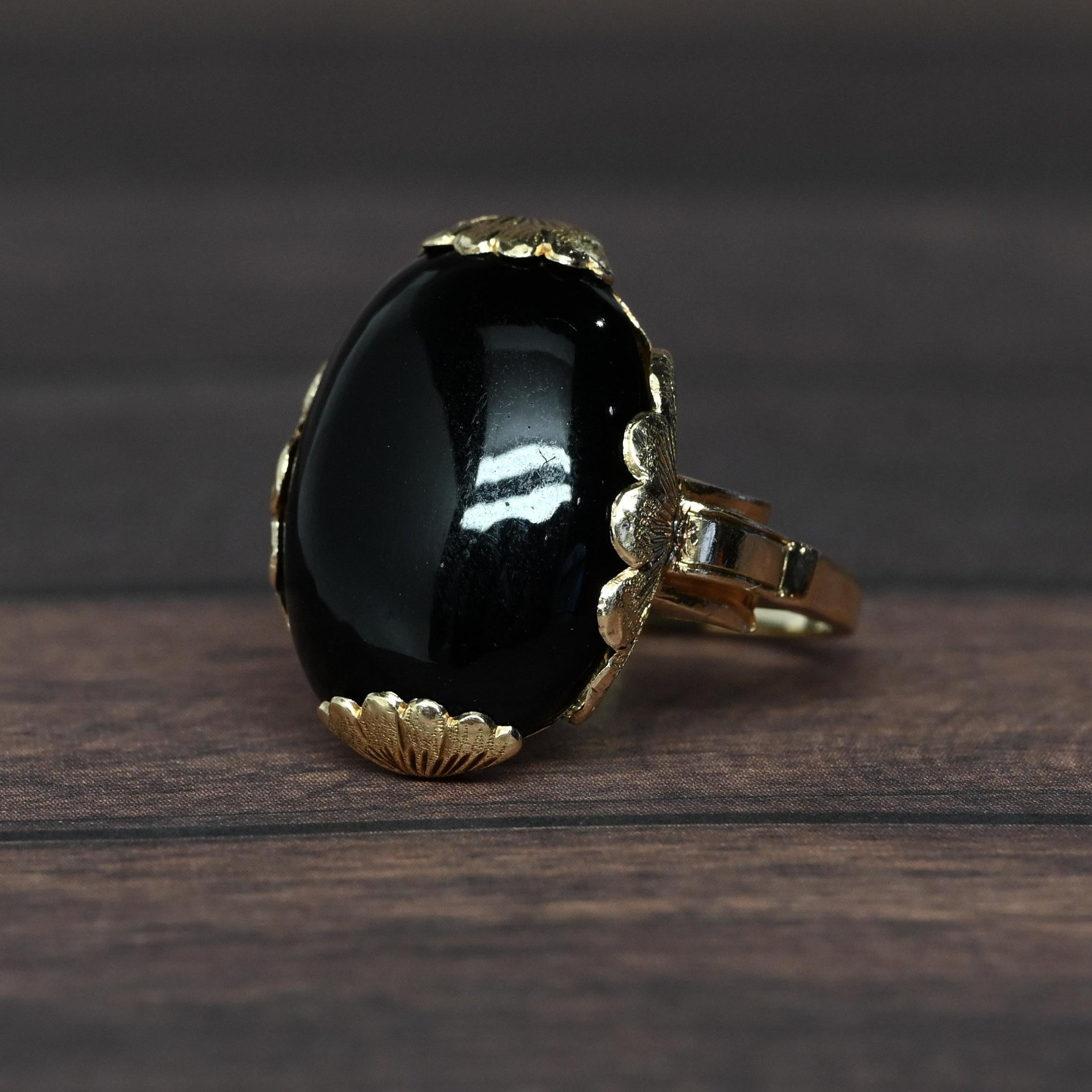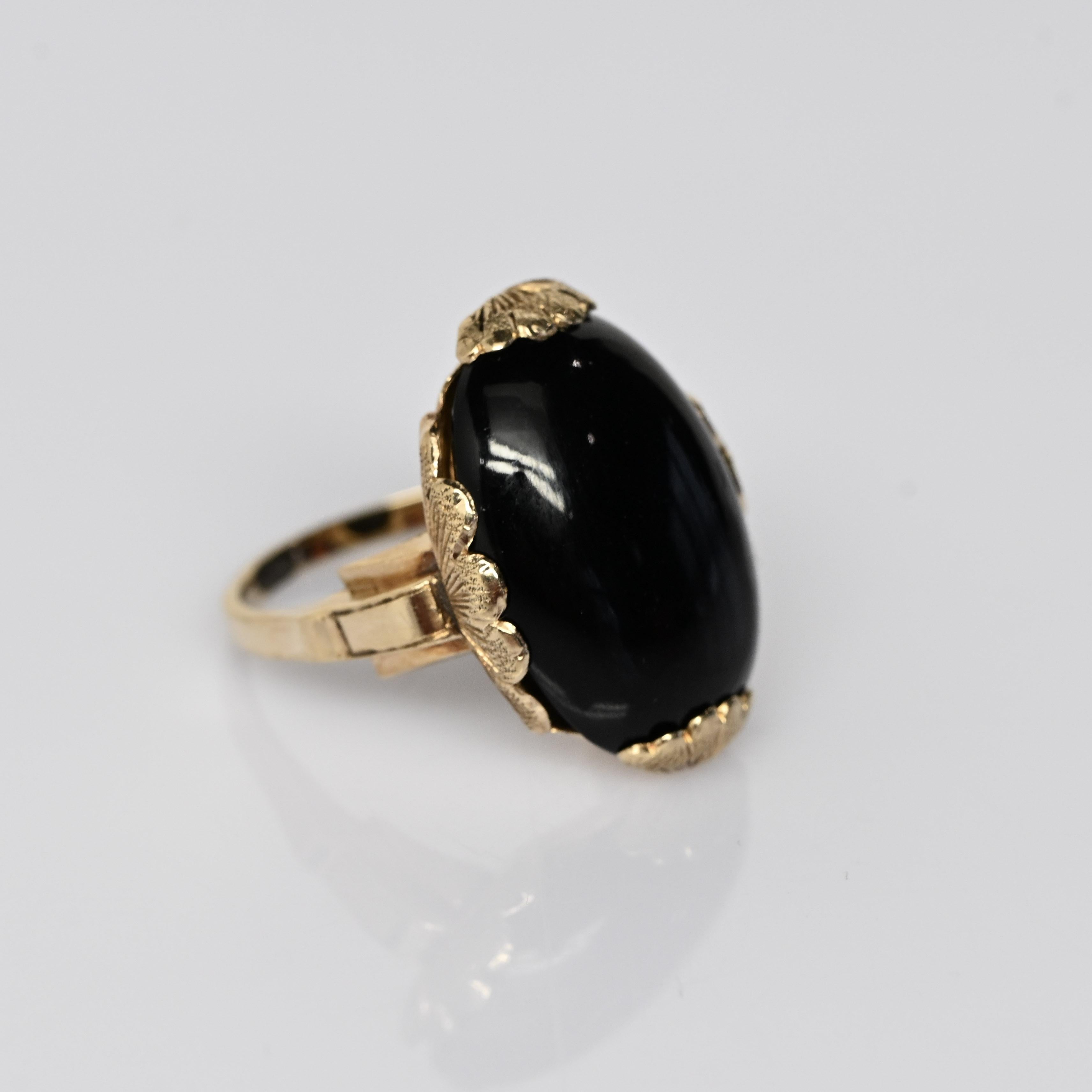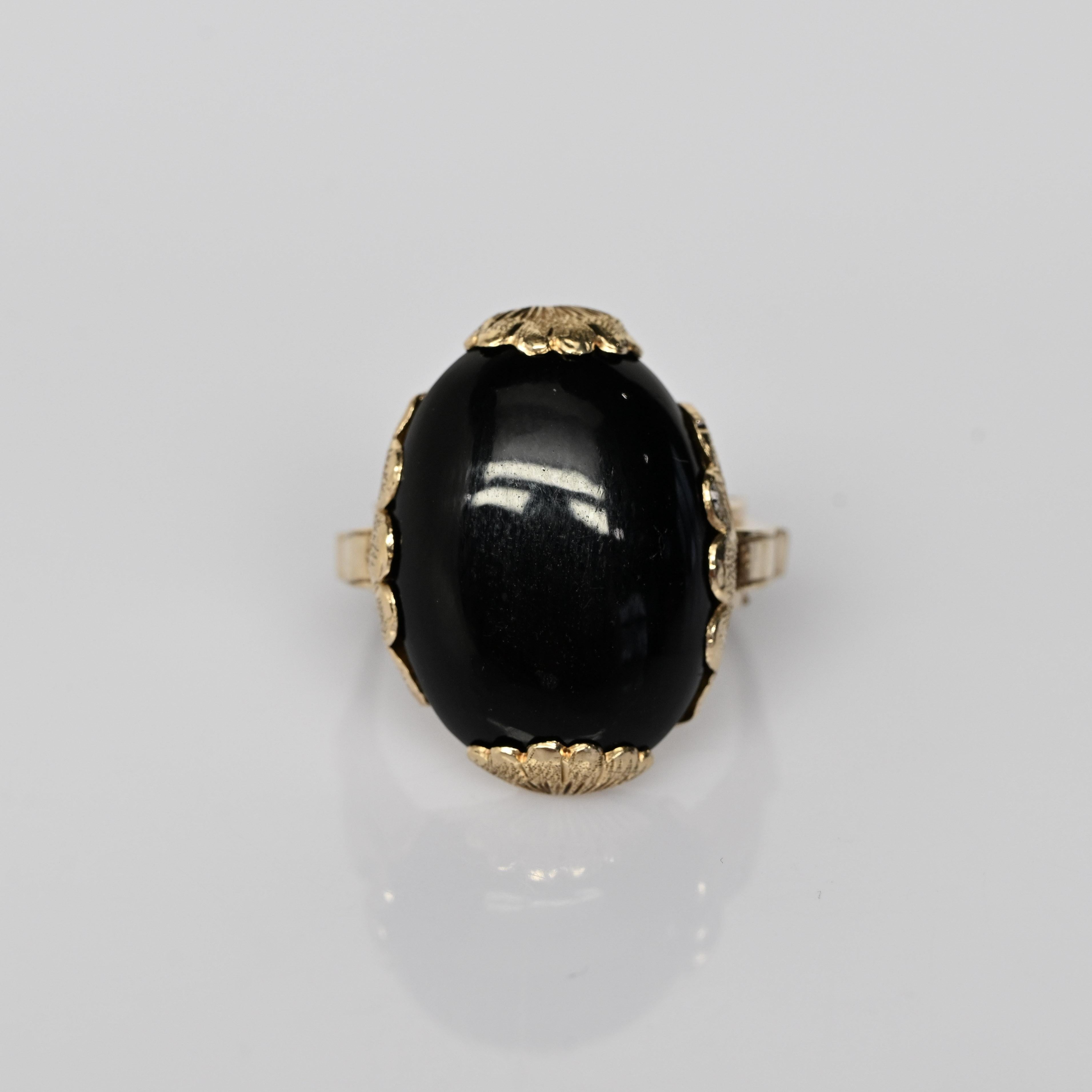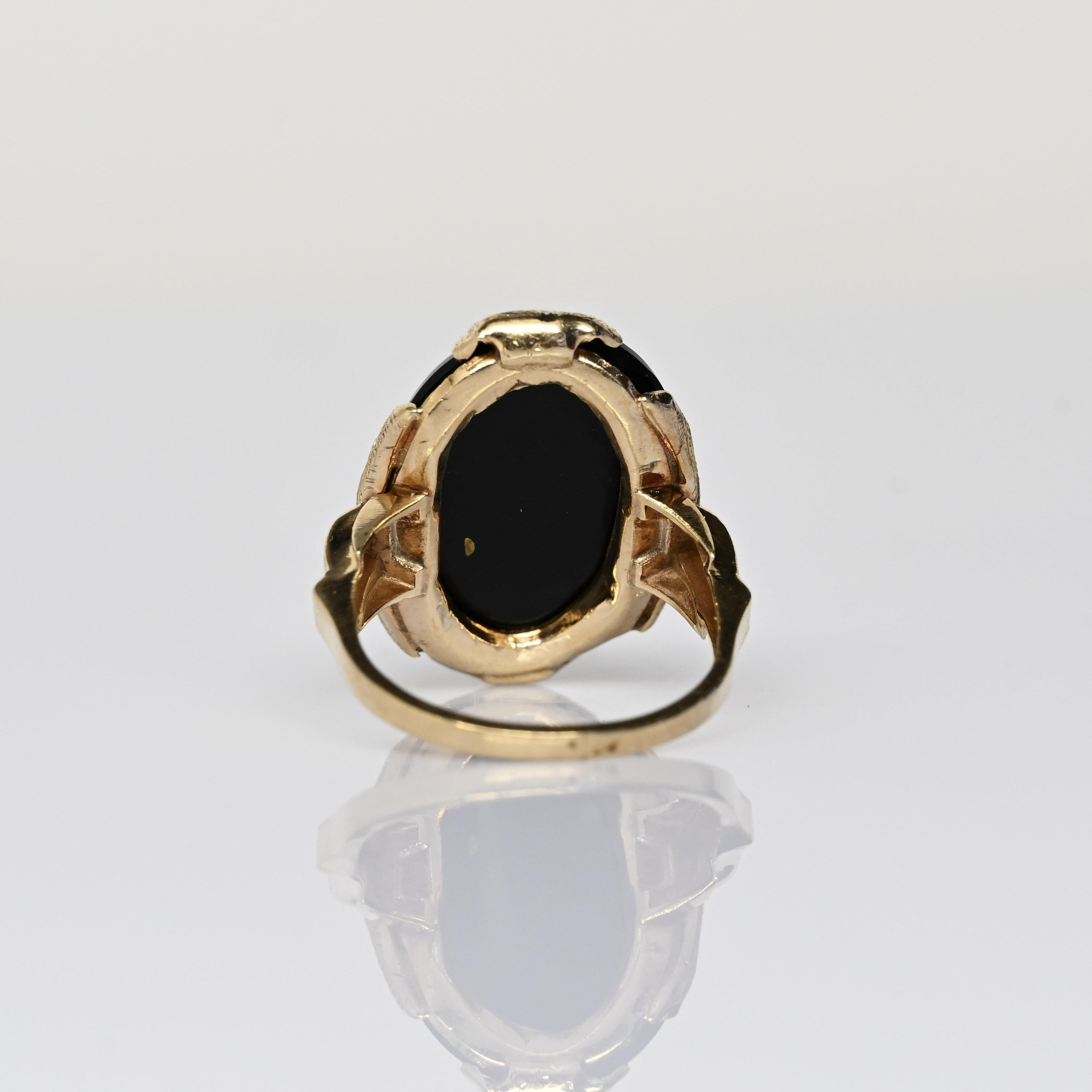 This striking Art Deco onyx ring features a bold, high-polish black onyx set in warm yellow gold, creating a dramatic and timeless contrast. The elongated oval stone is framed by a decorative scalloped setting, showcasing the clean lines and sculptural elegance characteristic of the Art Deco era. A split-shank band adds architectural interest while enhancing the ring’s substantial presence on the hand. Confident and sophisticated, this ring is a standout statement piece with enduring vintage appeal.