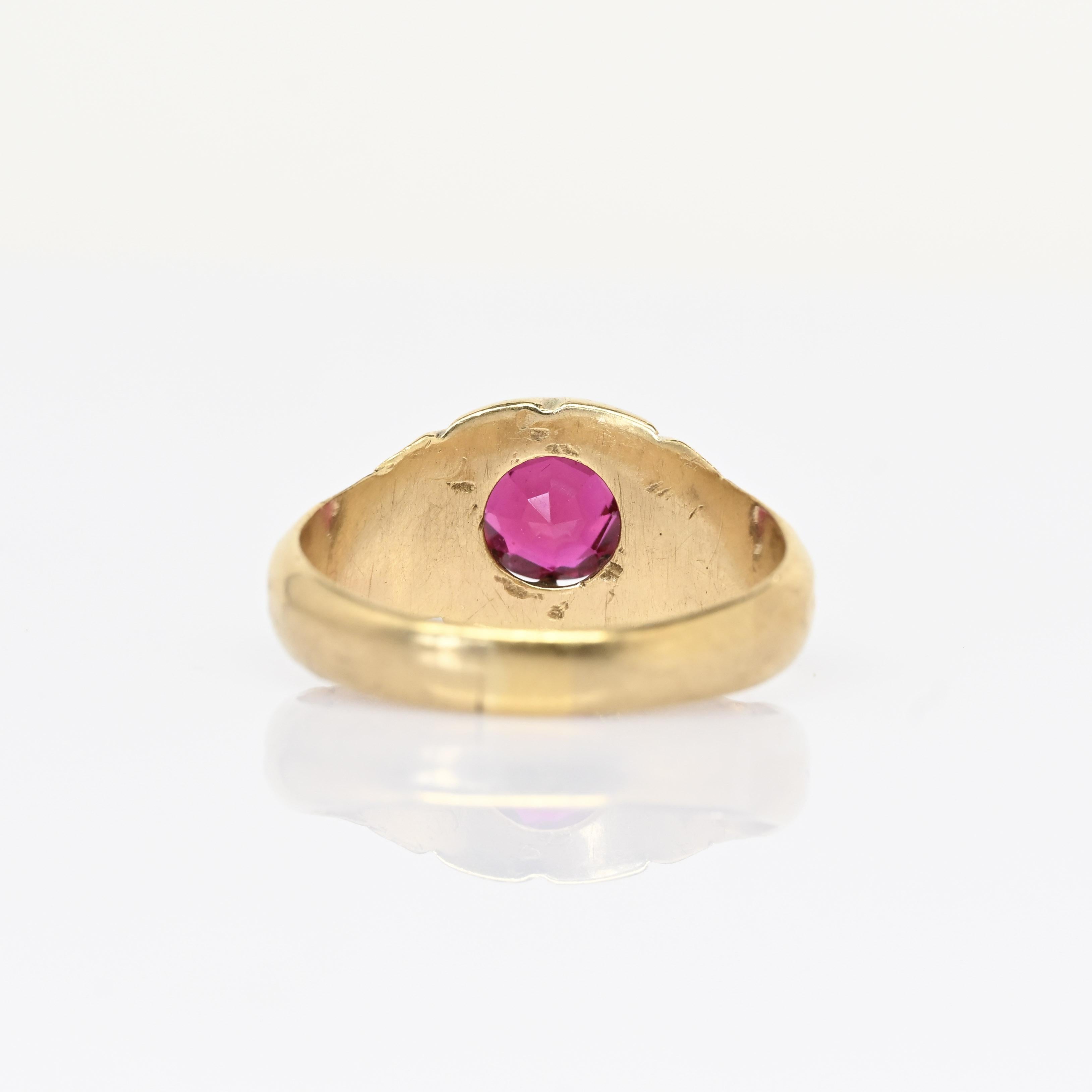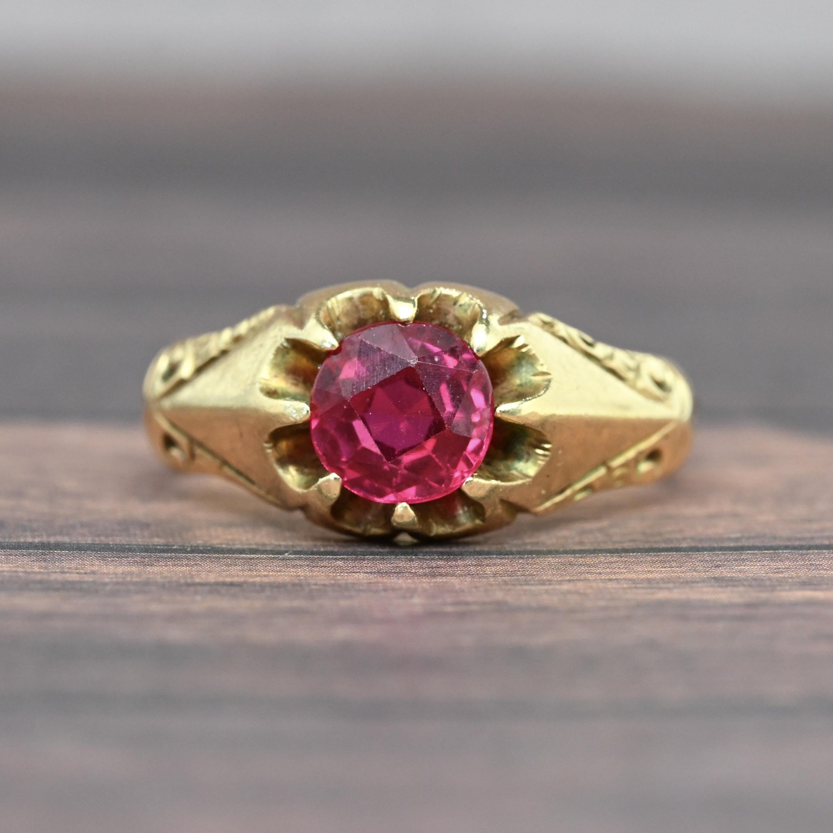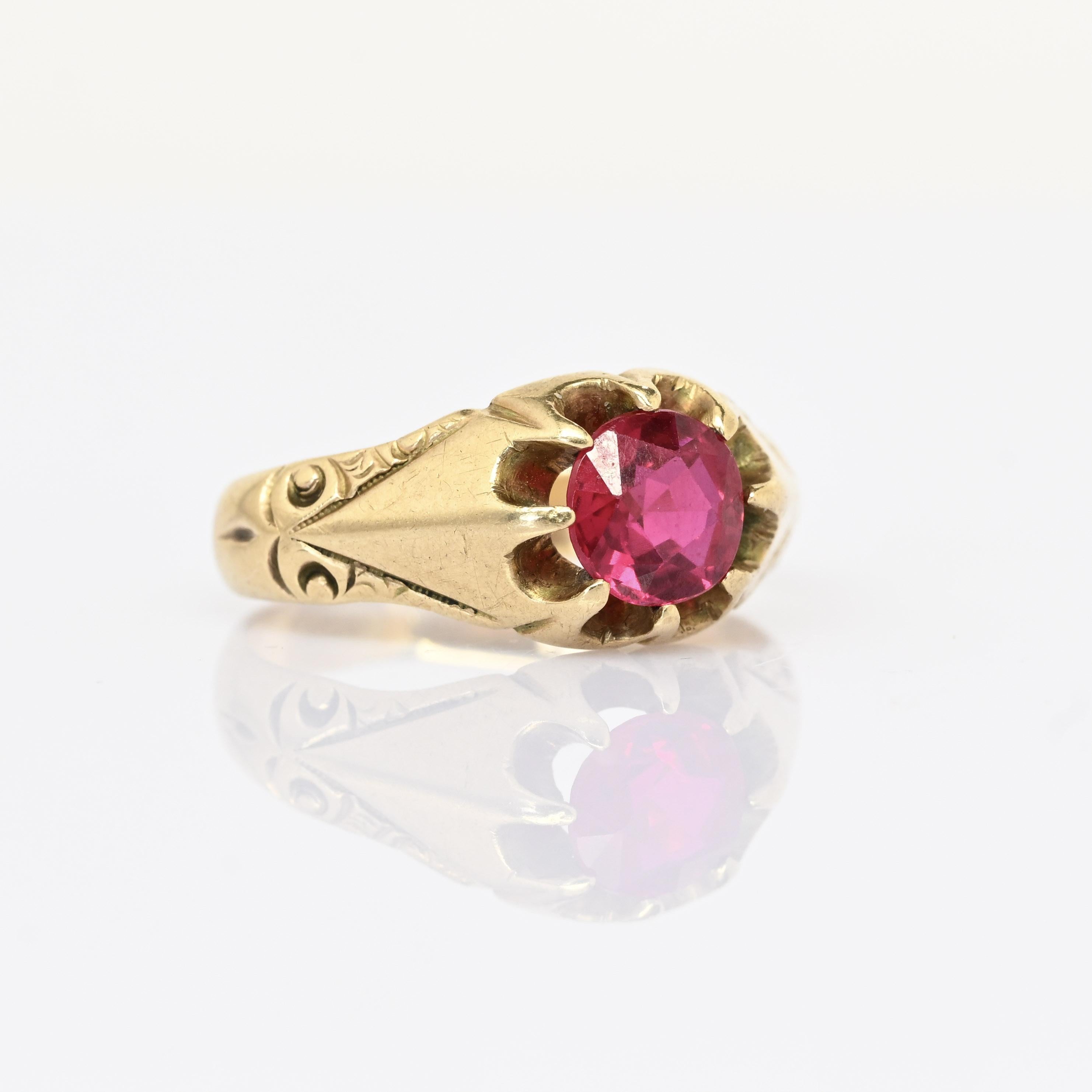 This Victorian-era ring is crafted in 14k yellow gold and showcases a vivid synthetic pink stone in a classic belcher setting. The deeply carved prongs cradle the round gemstone securely while adding a bold and distinctive antique character. With its romantic color and timeless design, this piece is a striking example of 19th-century craftsmanship and enduring elegance.