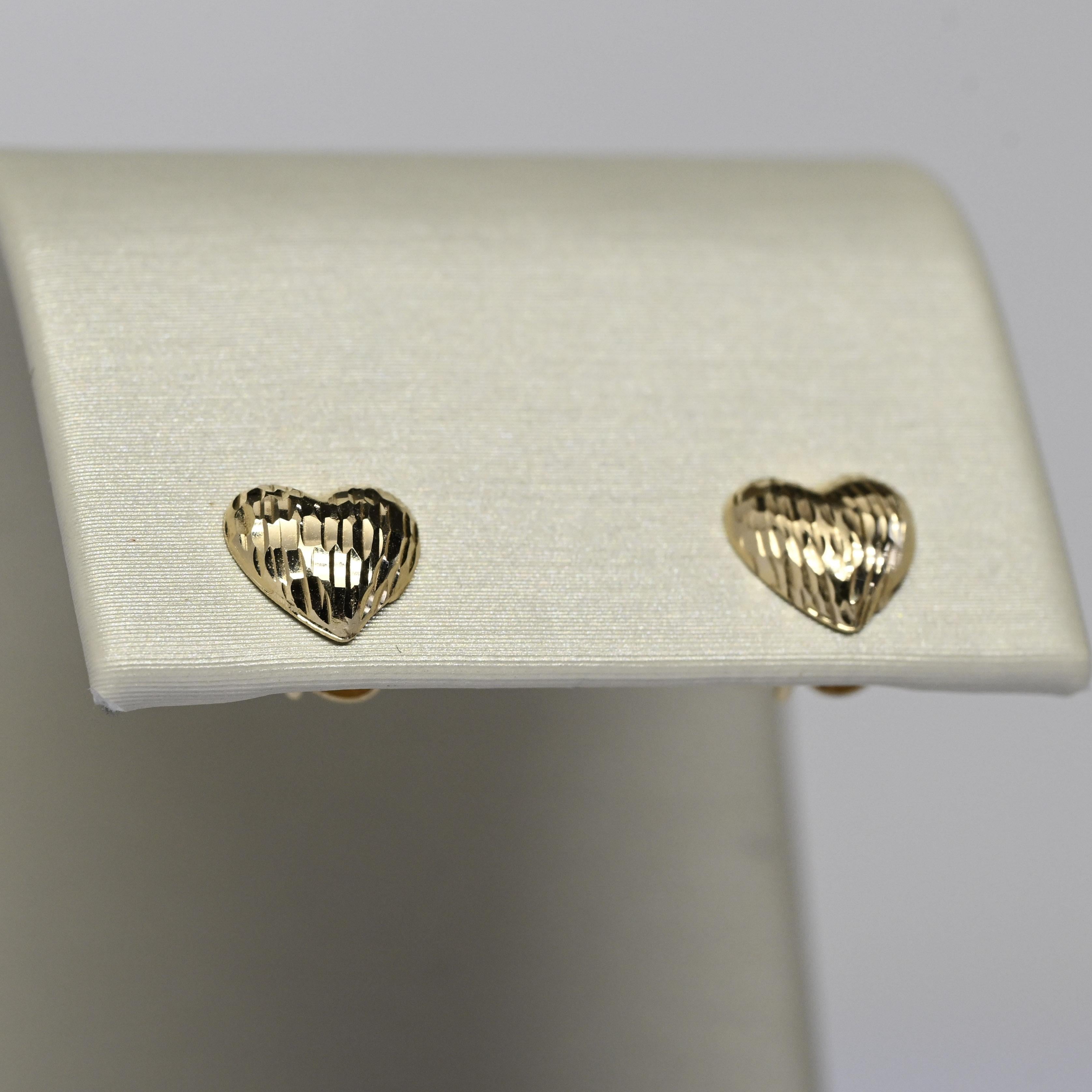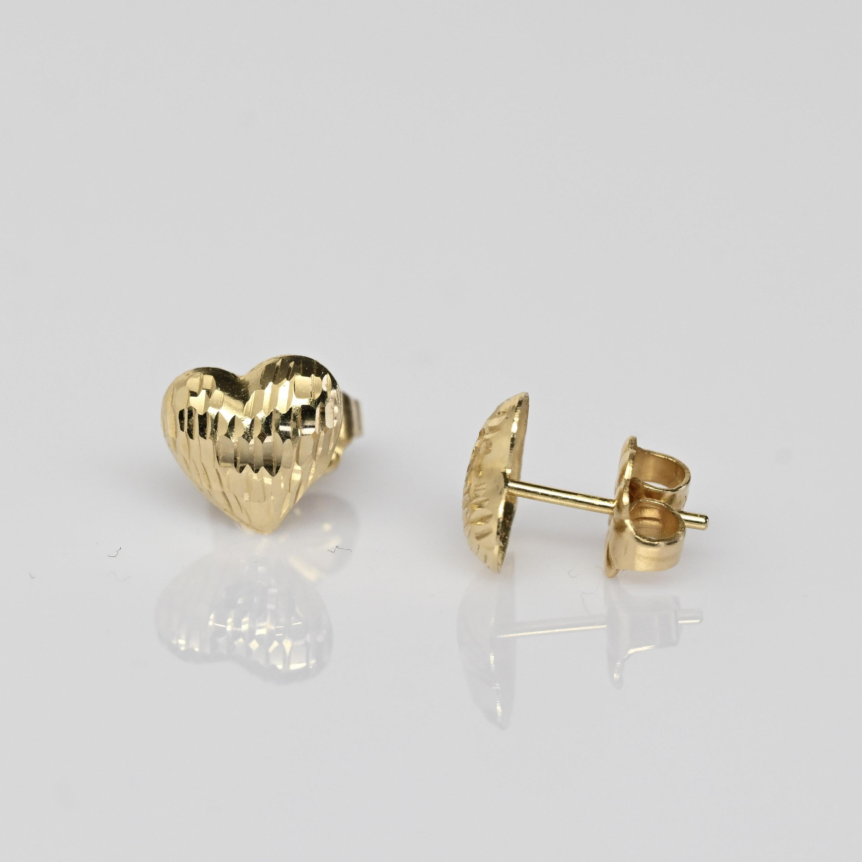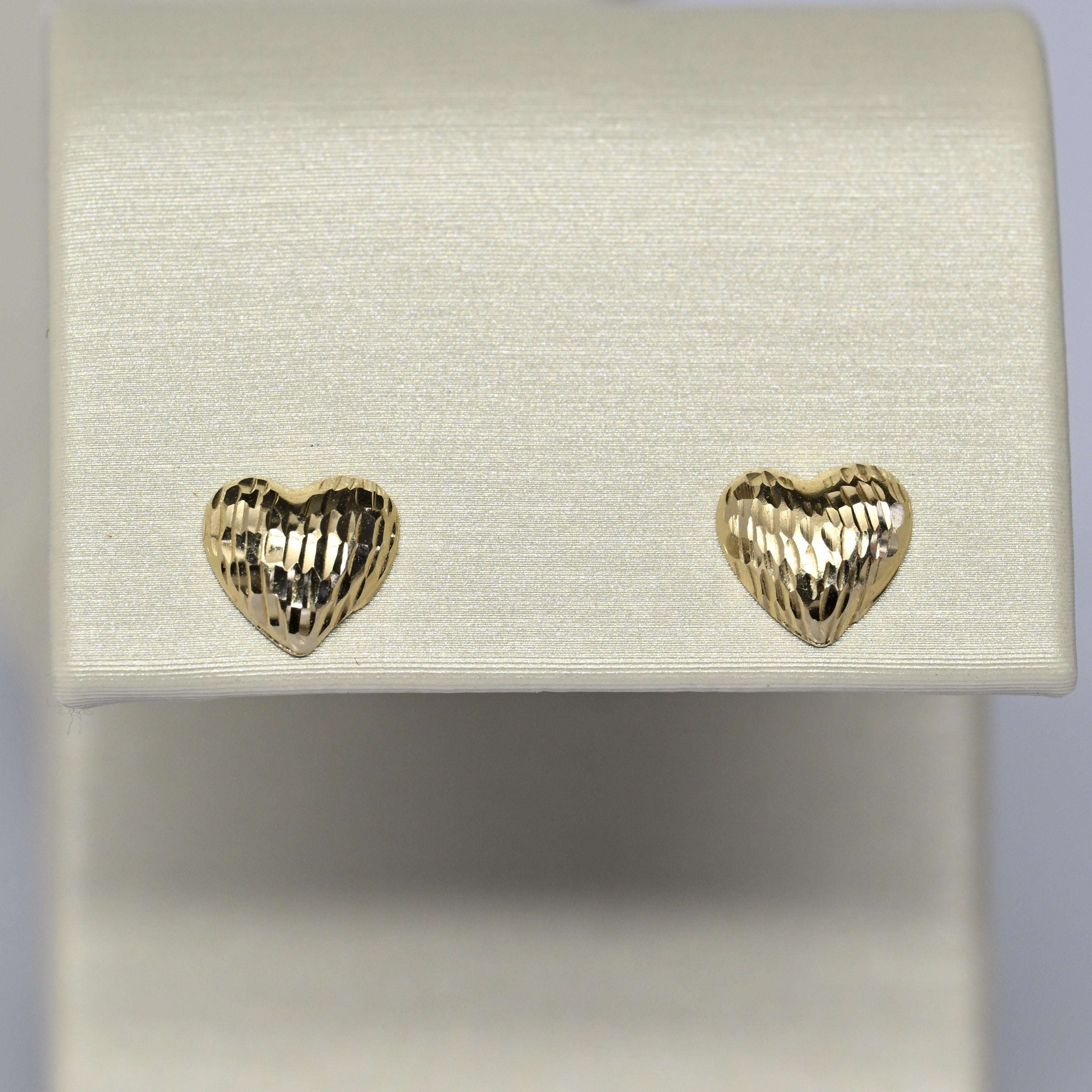 These charming 14 karat gold heart earrings feature a beautifully textured, diamond-cut finish that catches the light with every movement. The classic heart silhouette offers a timeless symbol of love, while the polished gold adds warmth and elegance. Designed as comfortable stud earrings, they are perfect for everyday wear or as a thoughtful gift. Sweet yet refined, these gold hearts are a lovely addition to any jewelry collection.