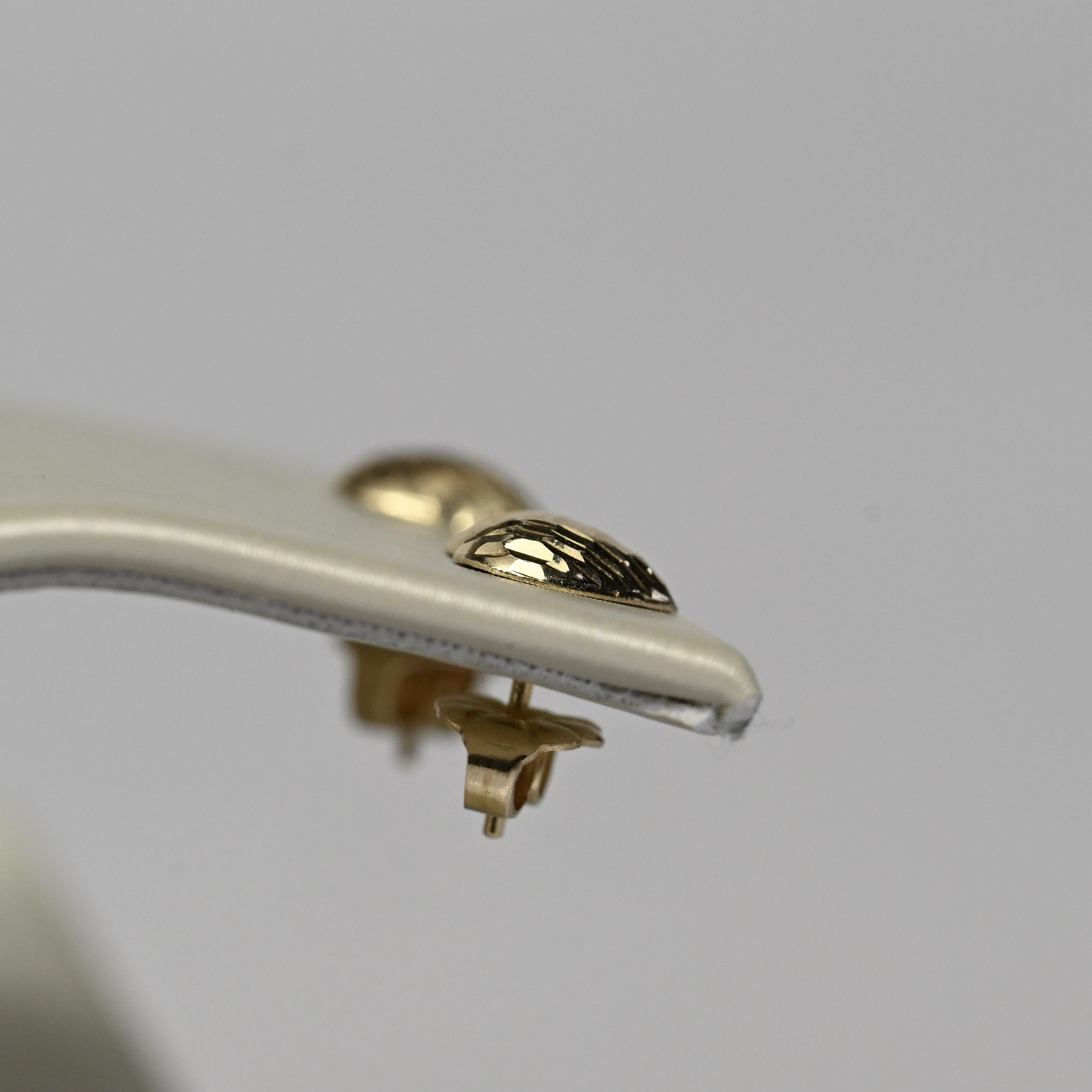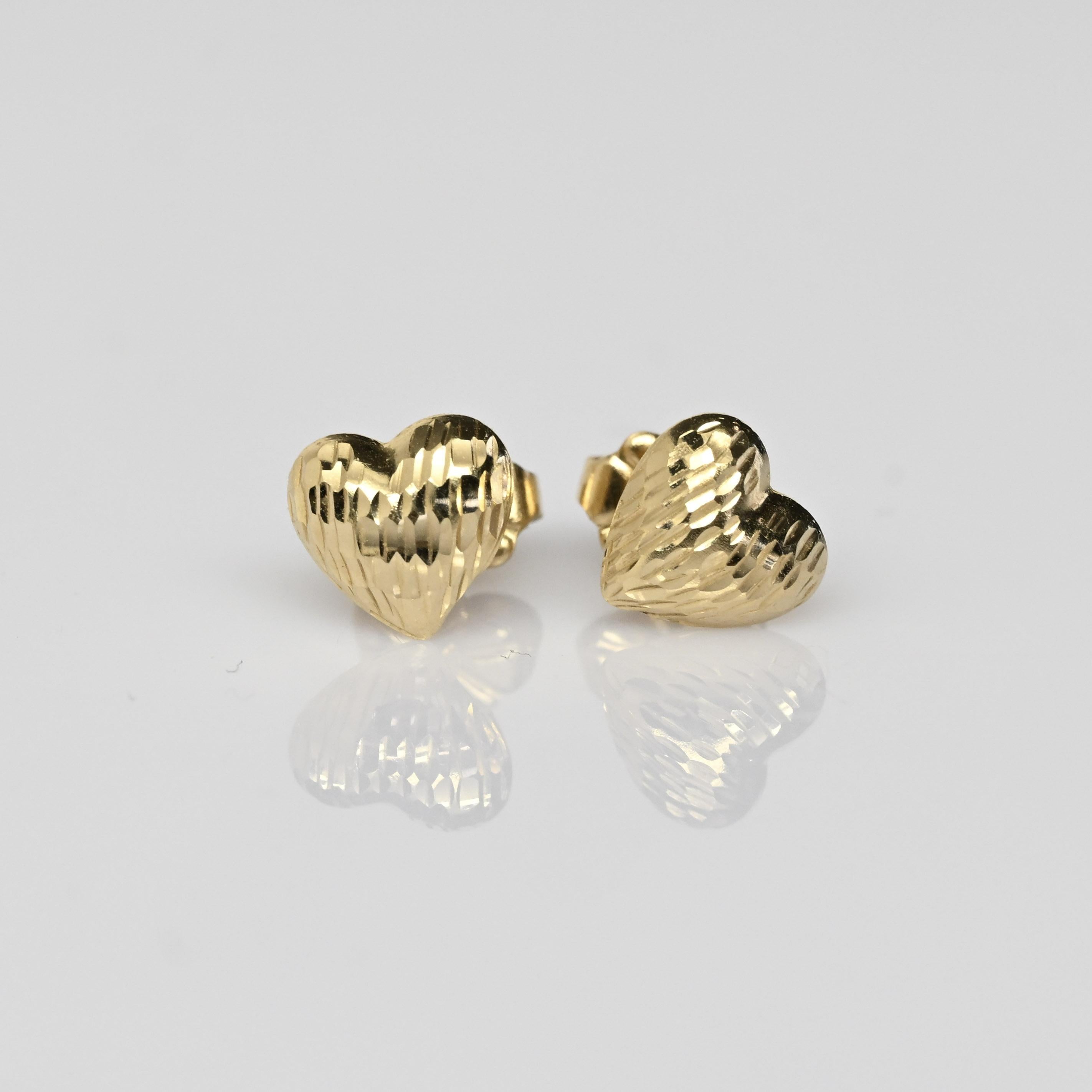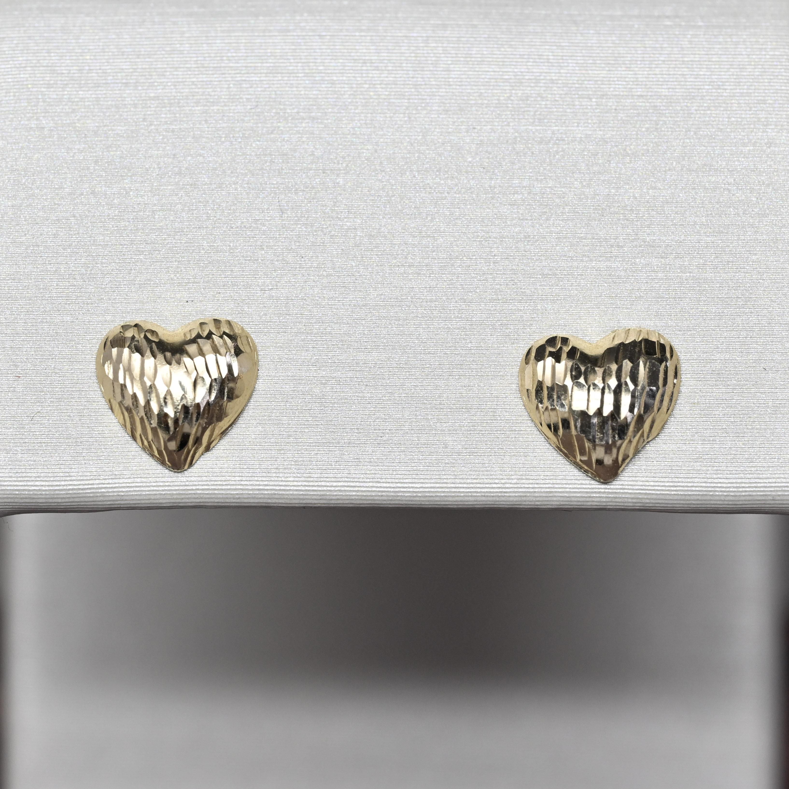These charming 14 karat gold heart earrings feature a beautifully textured, diamond-cut finish that catches the light with every movement. The classic heart silhouette offers a timeless symbol of love, while the polished gold adds warmth and elegance. Designed as comfortable stud earrings, they are perfect for everyday wear or as a thoughtful gift. Sweet yet refined, these gold hearts are a lovely addition to any jewelry collection.