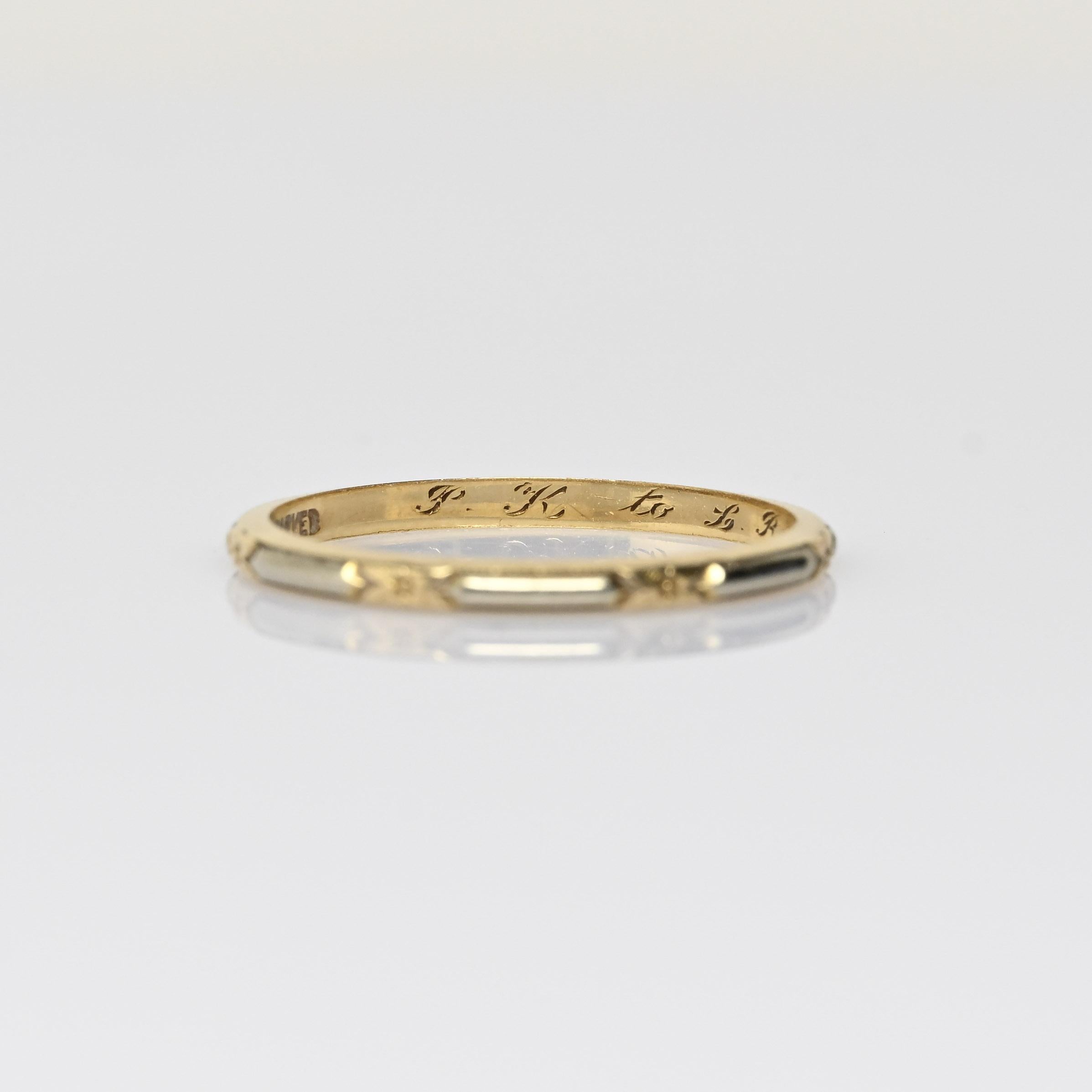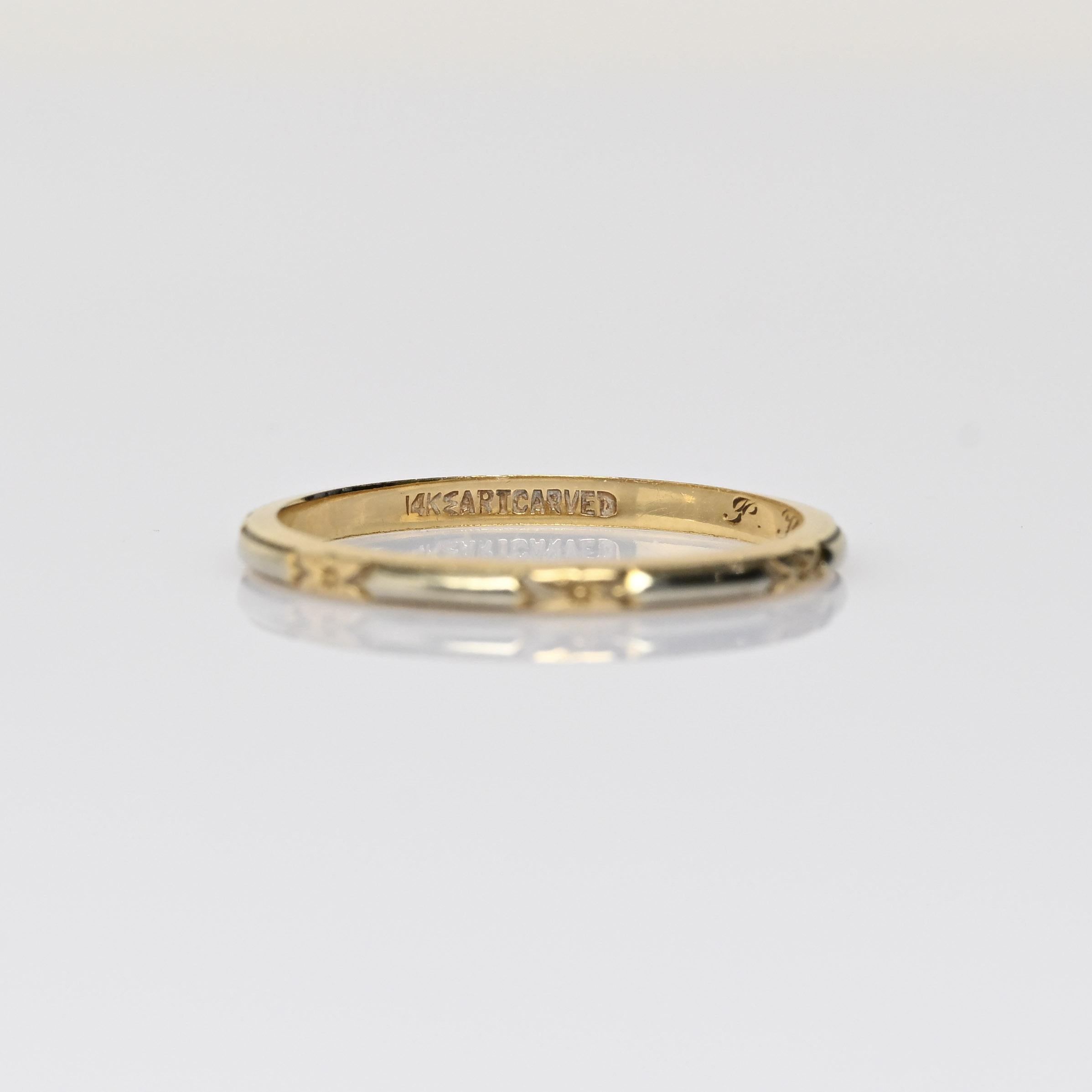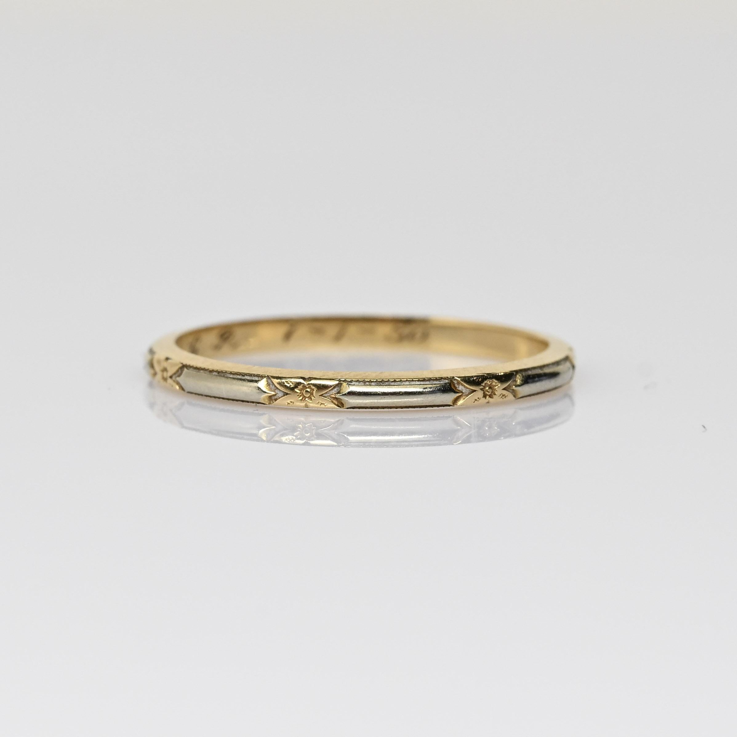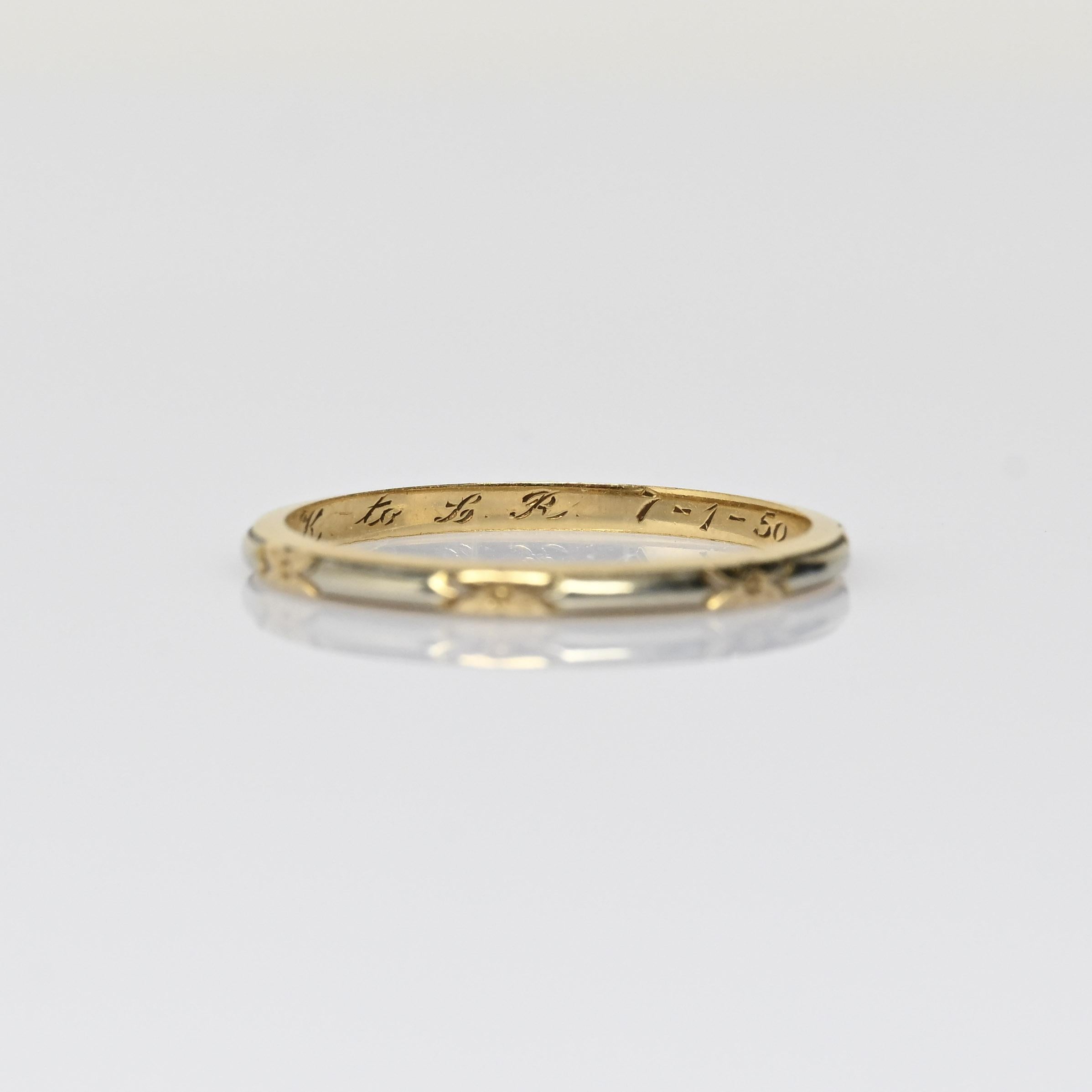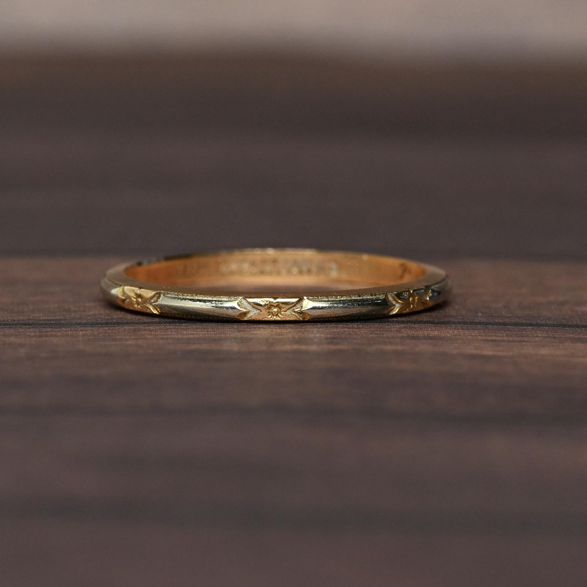 This elegant vintage wedding band is crafted in 14 karat yellow gold with subtle two-tone accents in white gold. Delicate engraved star and arrow motifs add character and symbolic detail to the timeless design. The contrasting metals create depth while maintaining a classic, understated profile. A beautiful heirloom piece, this band is perfect for those who appreciate meaningful vintage craftsmanship and enduring style.