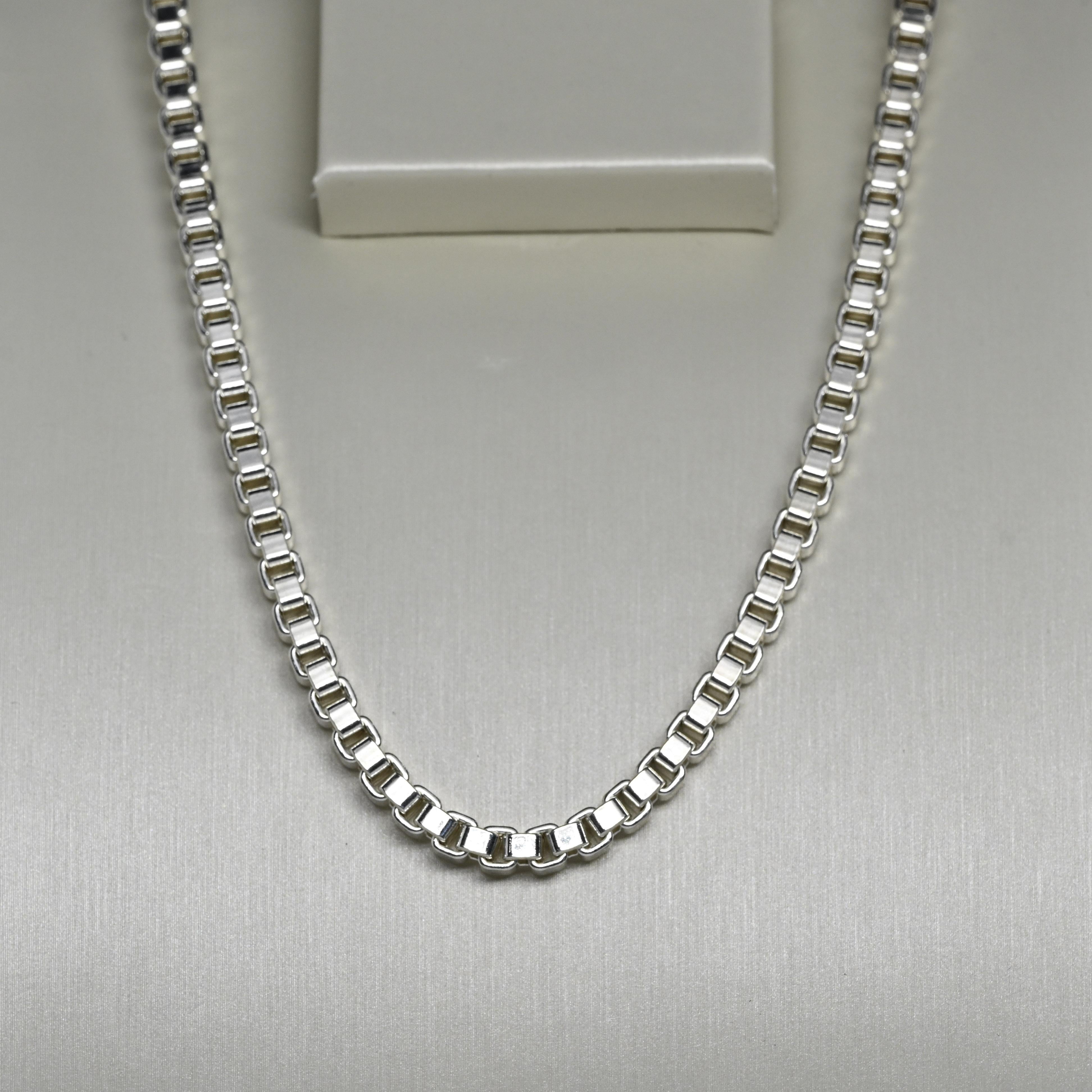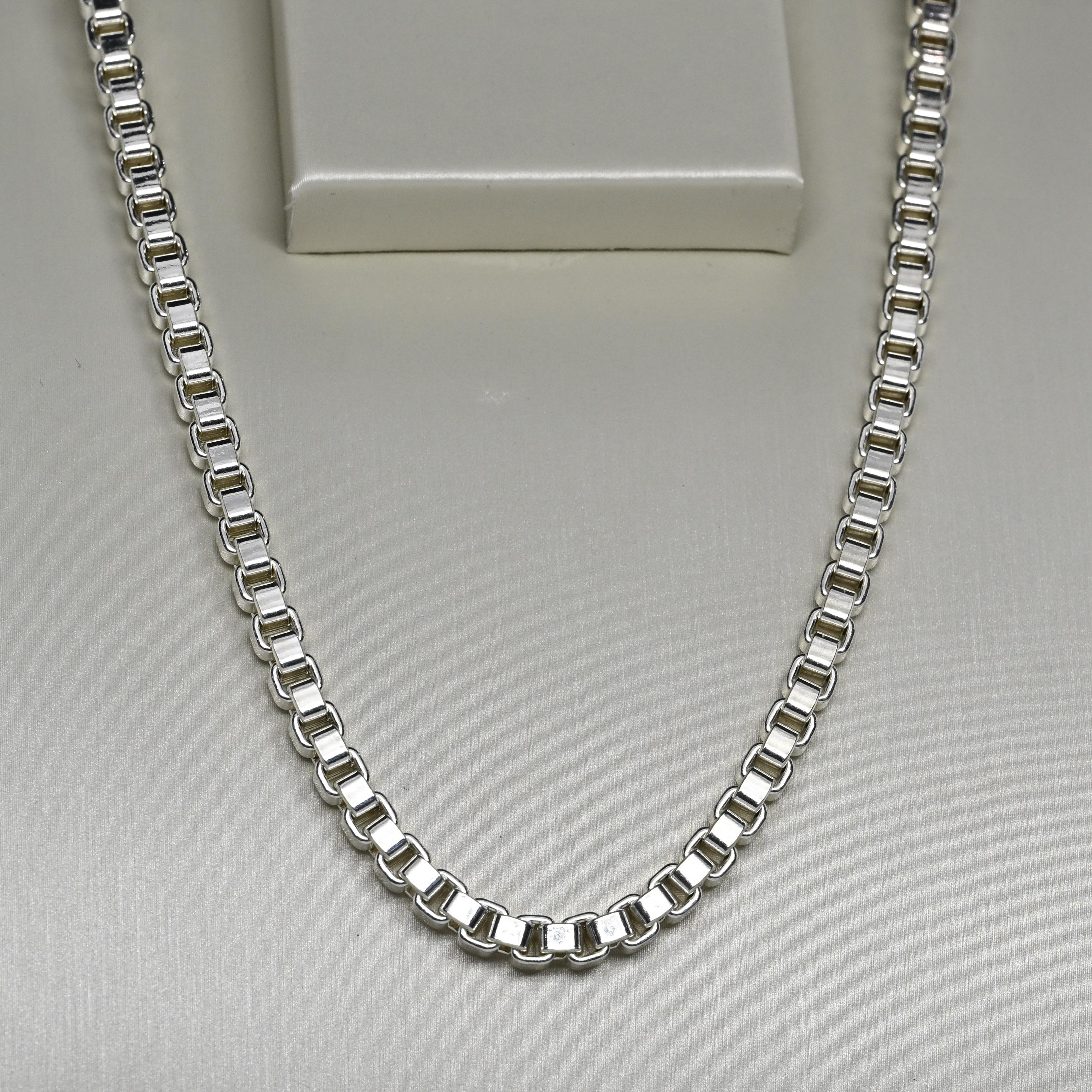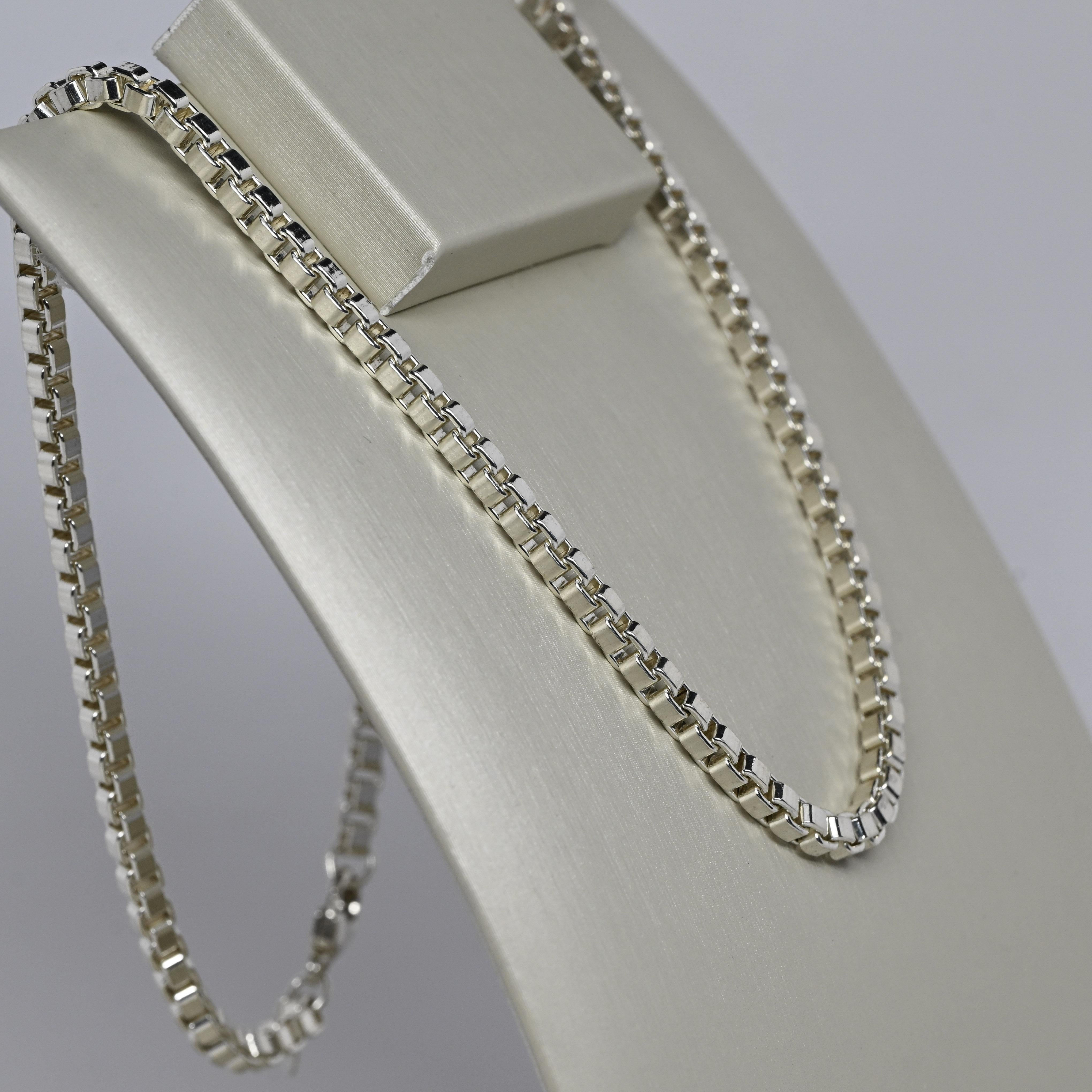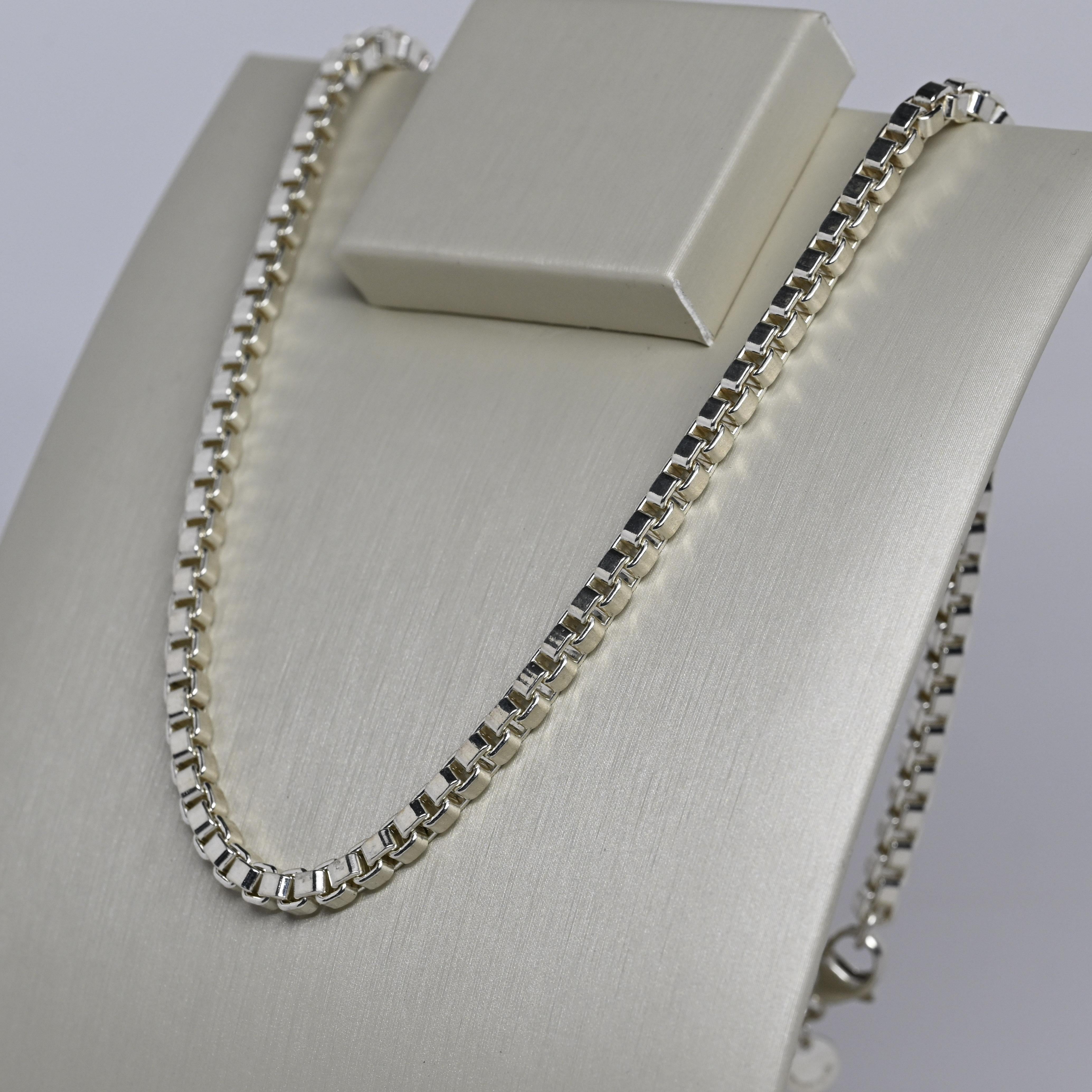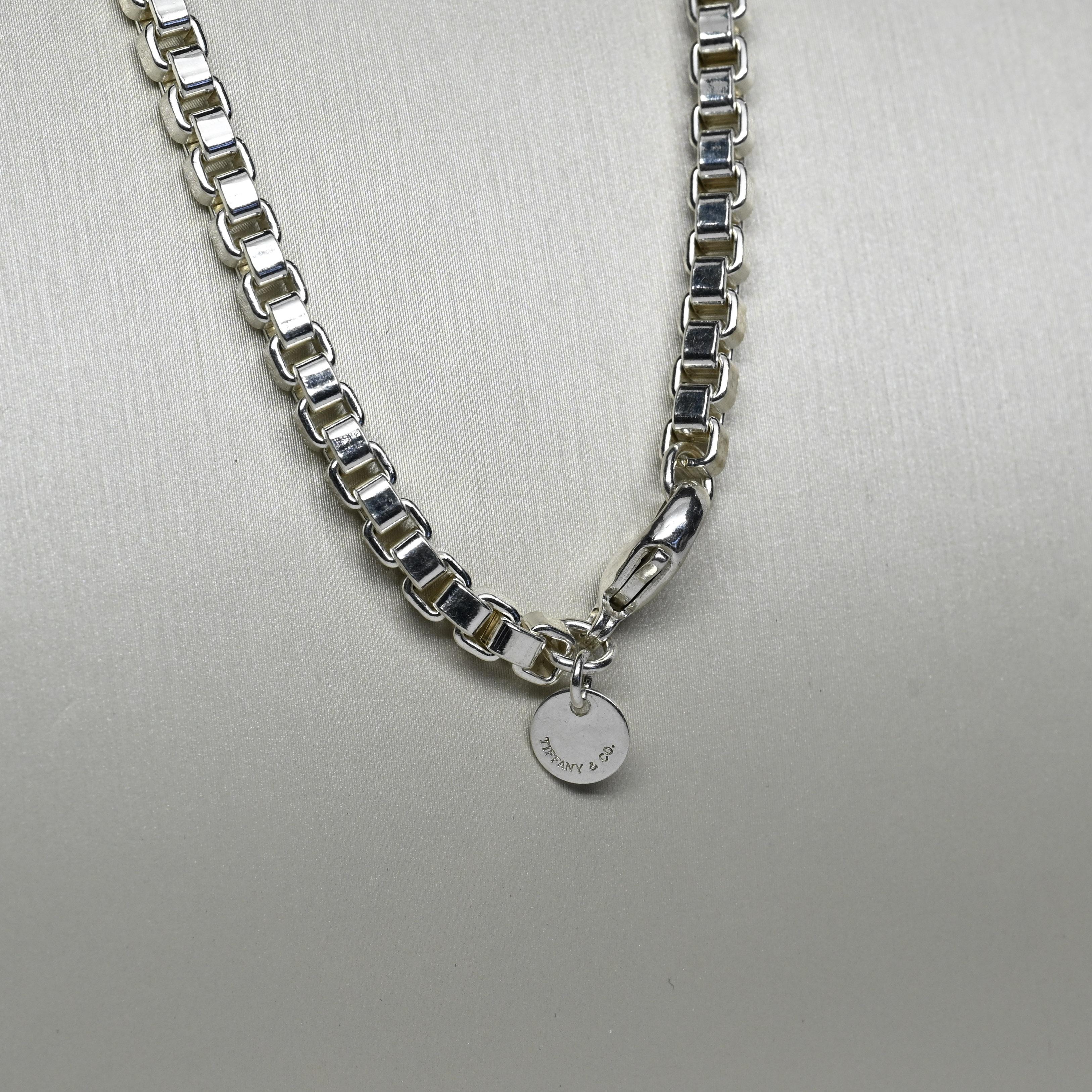 This authentic Tiffany & Co. Sterling Silver Venetian Box Chain Necklace features the brand’s iconic square box link design, crafted in solid 925 sterling silver. The sleek, polished links create a clean, modern look with a smooth, substantial feel that reflects Tiffany’s renowned craftsmanship. Measuring 18 inches in length, this versatile necklace is perfect for wearing alone as a minimalist statement or pairing with your favorite pendant. A timeless designer essential, it’s a staple piece that embodies classic Tiffany elegance and everyday sophistication.