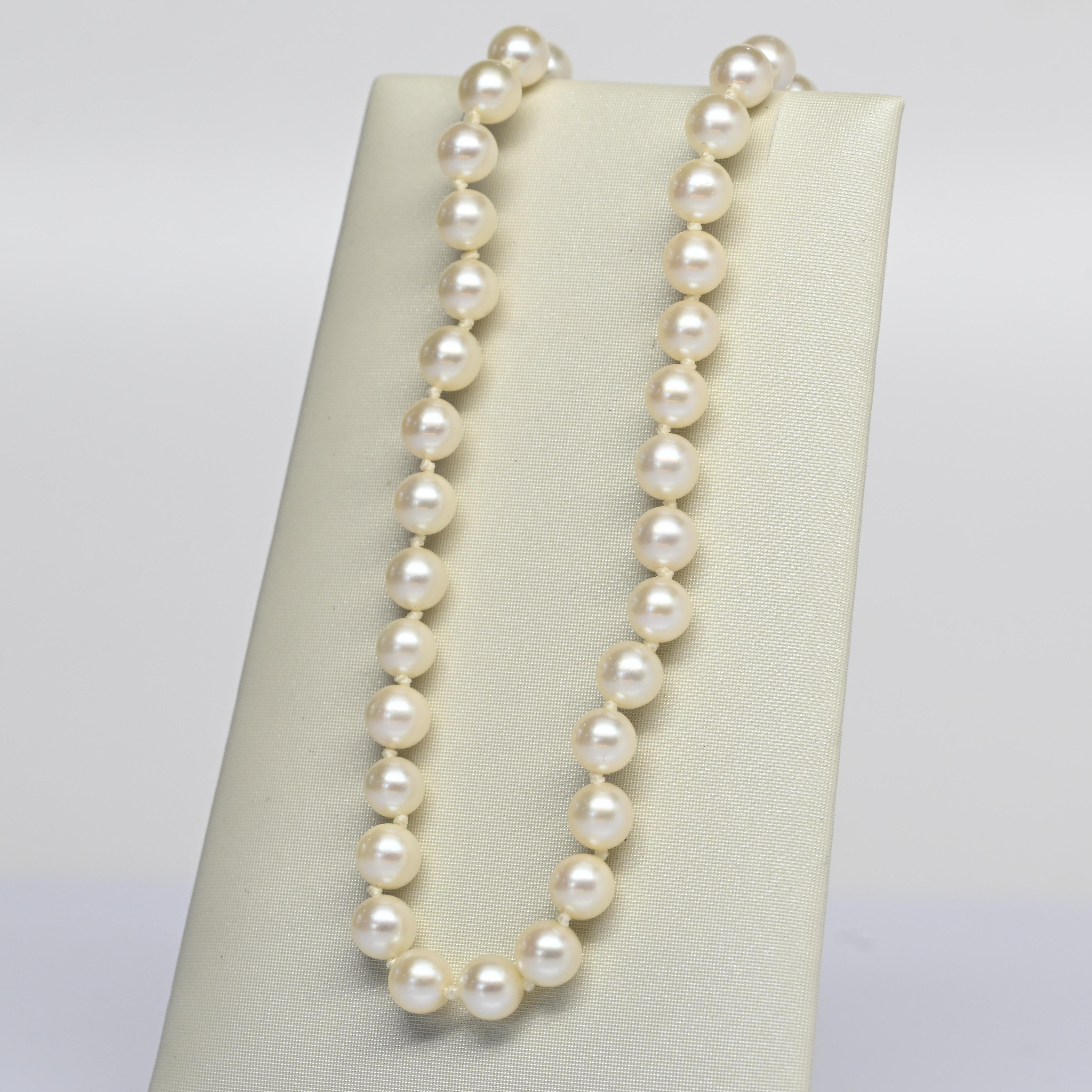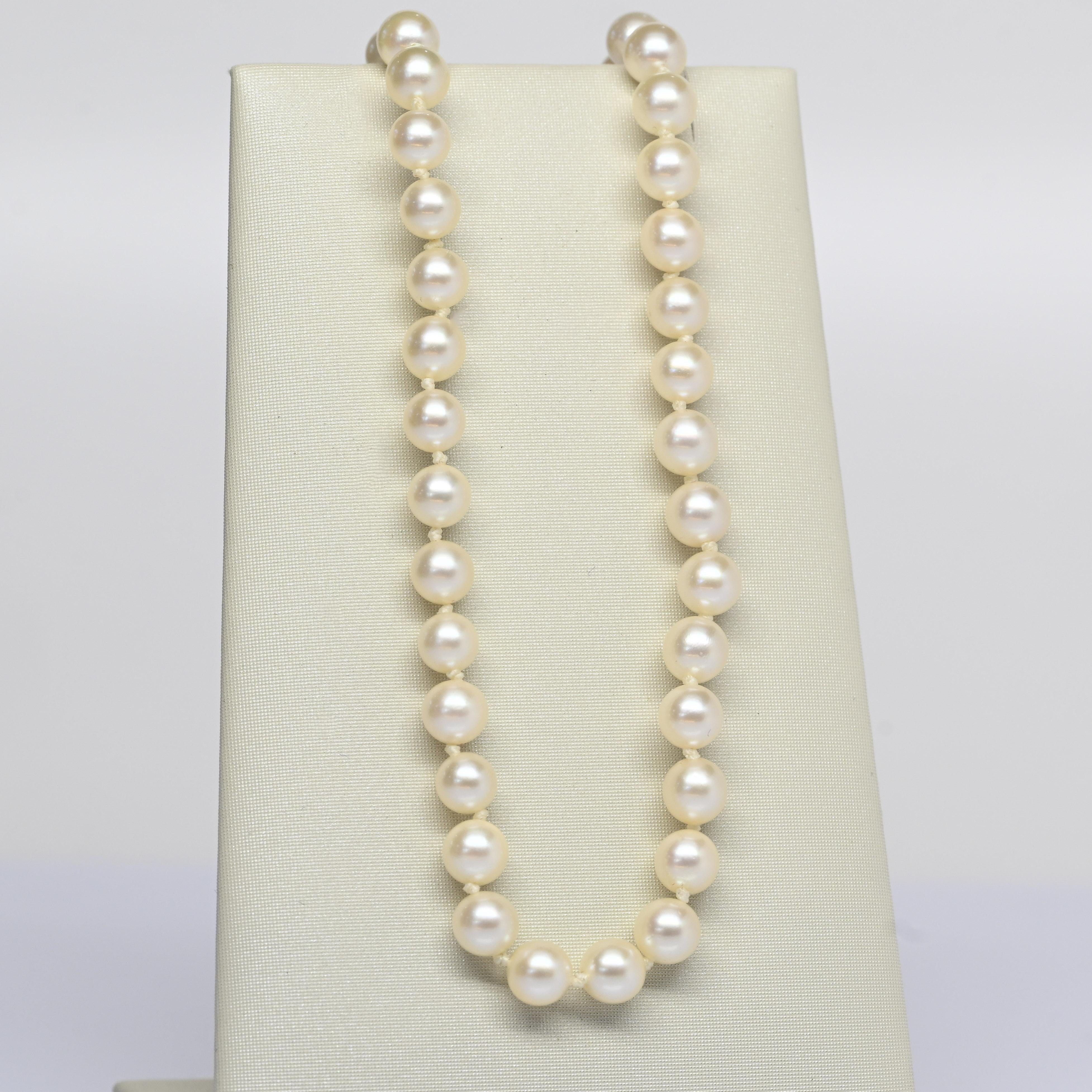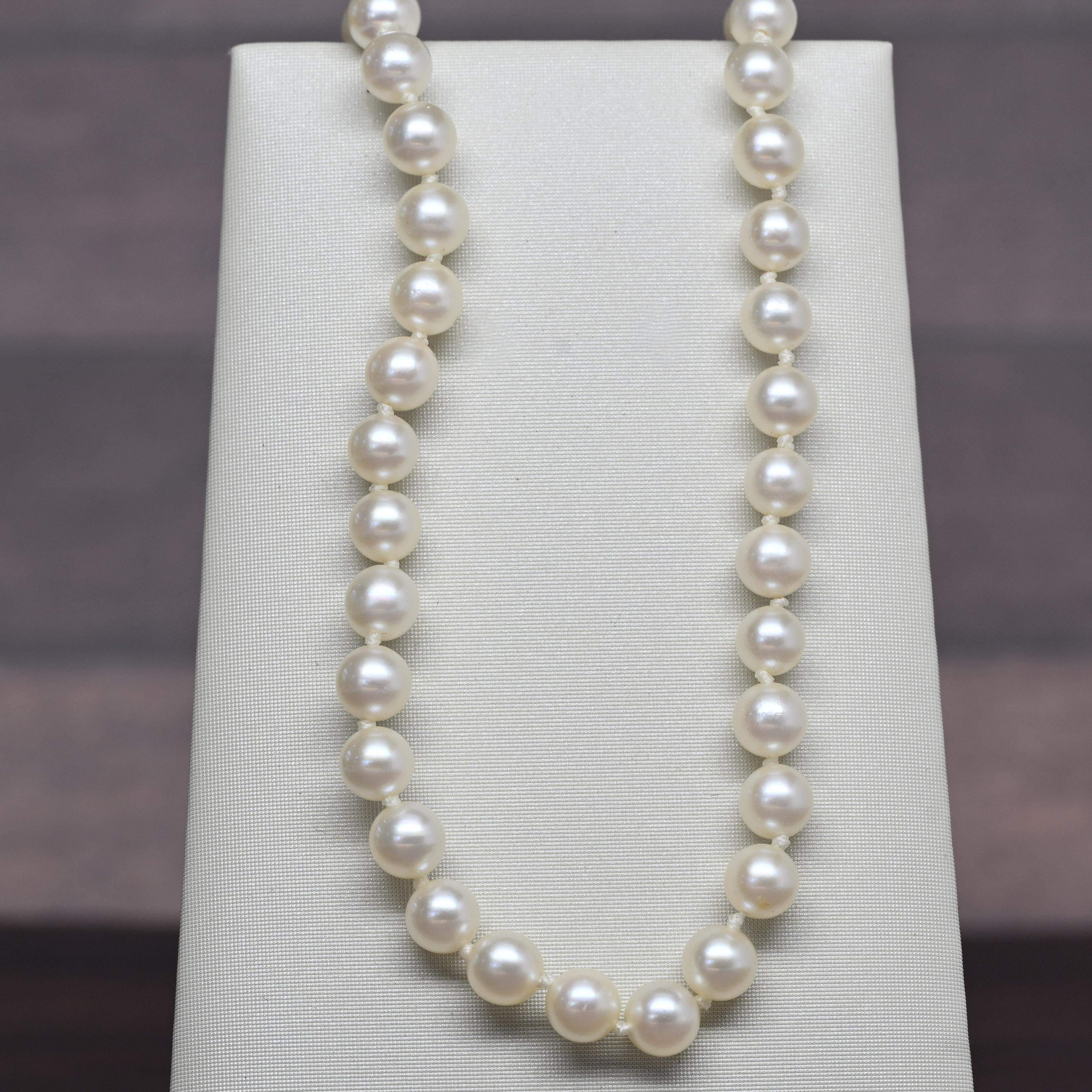 This vintage 17-inch cultured pearl necklace exudes timeless elegance and sophistication. Featuring lustrous, creamy-white pearls hand-knotted for security and graceful drape, it sits beautifully at collar length for a classic silhouette. The ornate silver clasp, accented with a delicate pearl center, adds a touch of vintage charm and refinement. Perfect for bridal wear, formal occasions, or heirloom gifting, this piece captures the enduring beauty of traditional pearl jewelry.