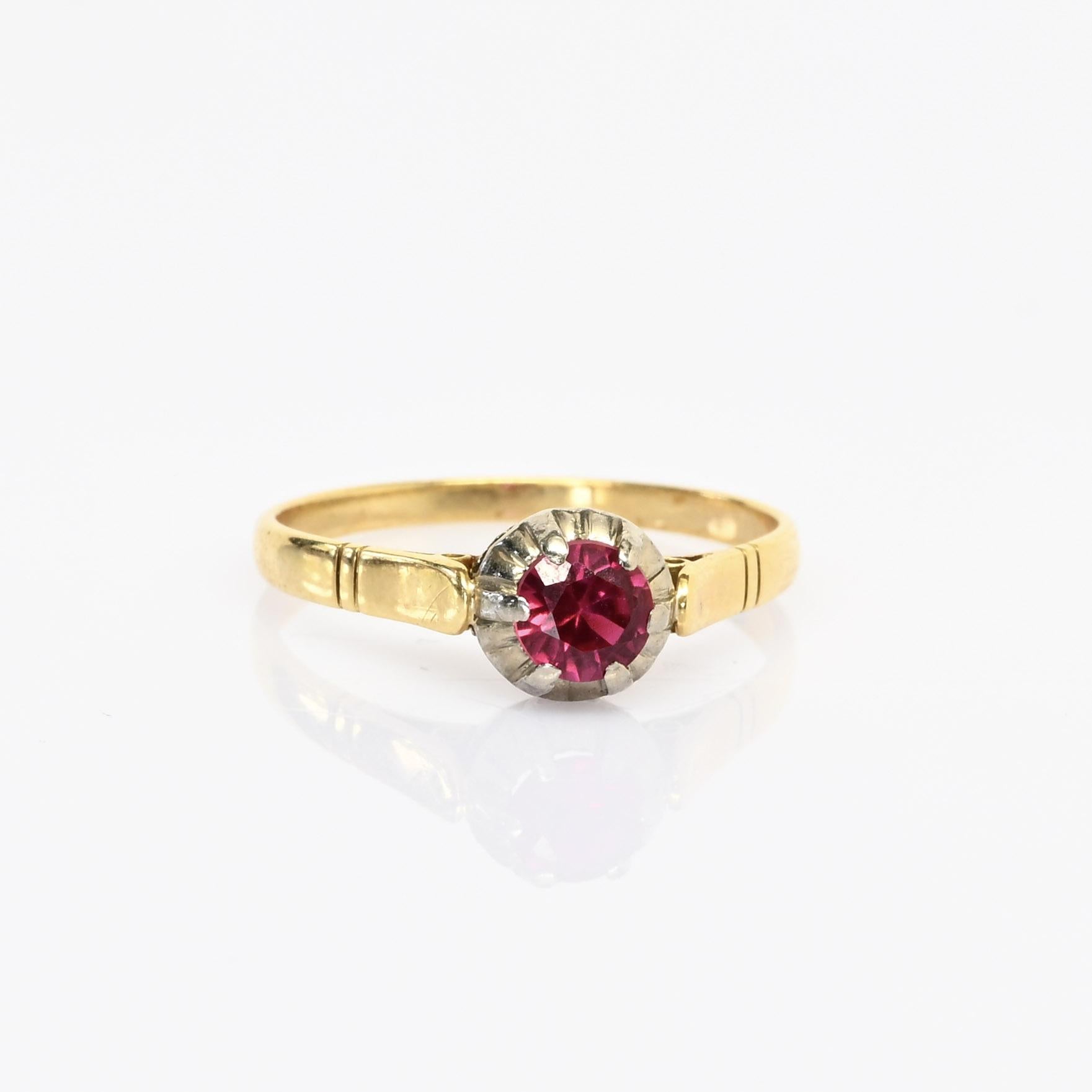 This vintage solitaire ring features a vivid ruby set in a radiant 18k yellow gold band. The ruby’s rich red hue is enhanced by a white gold illusion-style setting, adding brightness and dimension to the stone. Clean, tapered shoulders lead gracefully to the centerpiece, highlighting its timeless elegance. A classic and romantic design, this ring is perfect for lovers of bold color and vintage charm.
