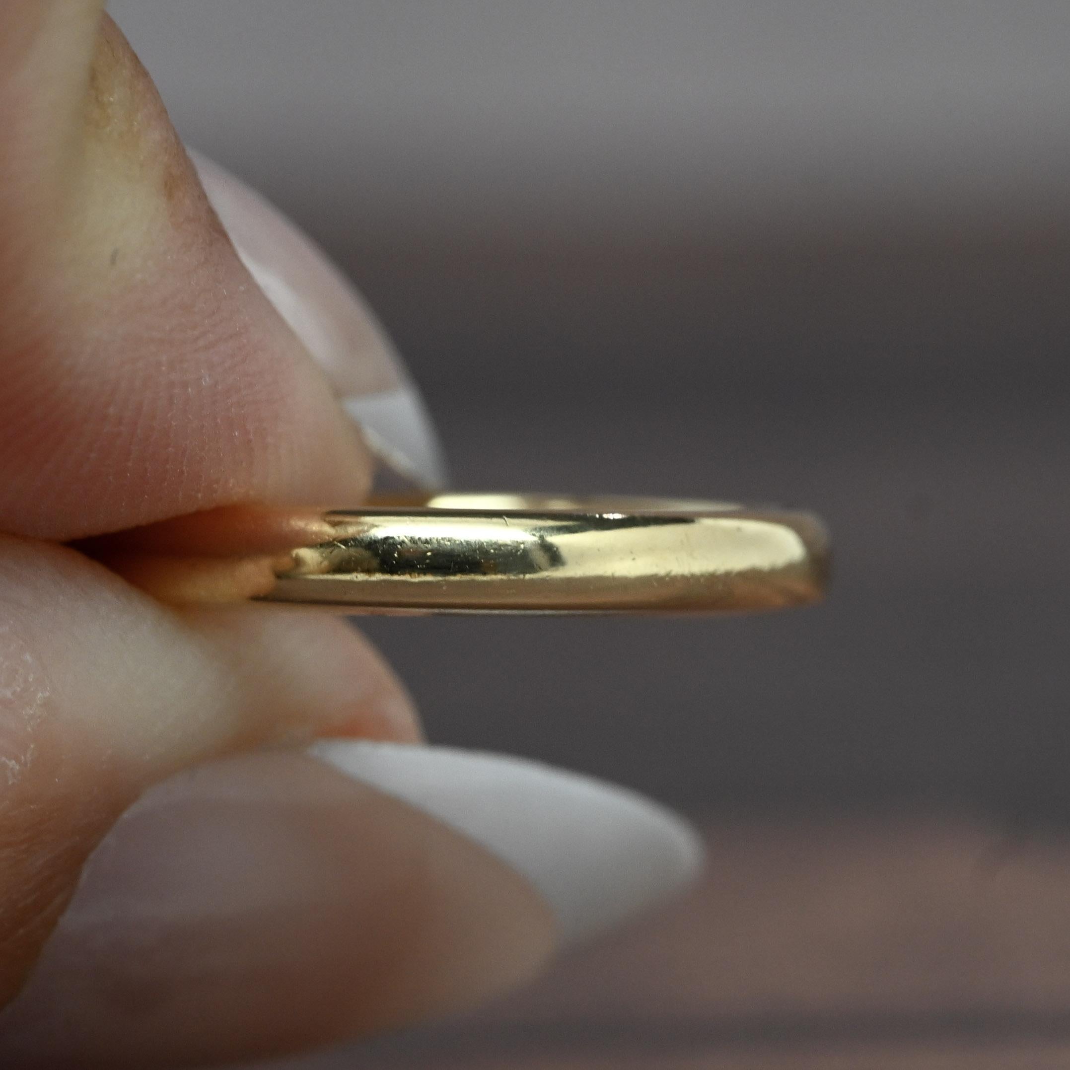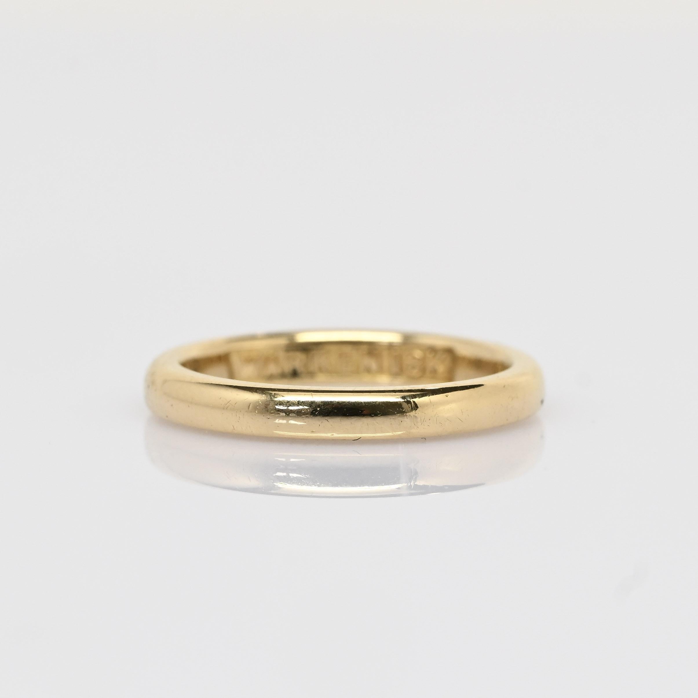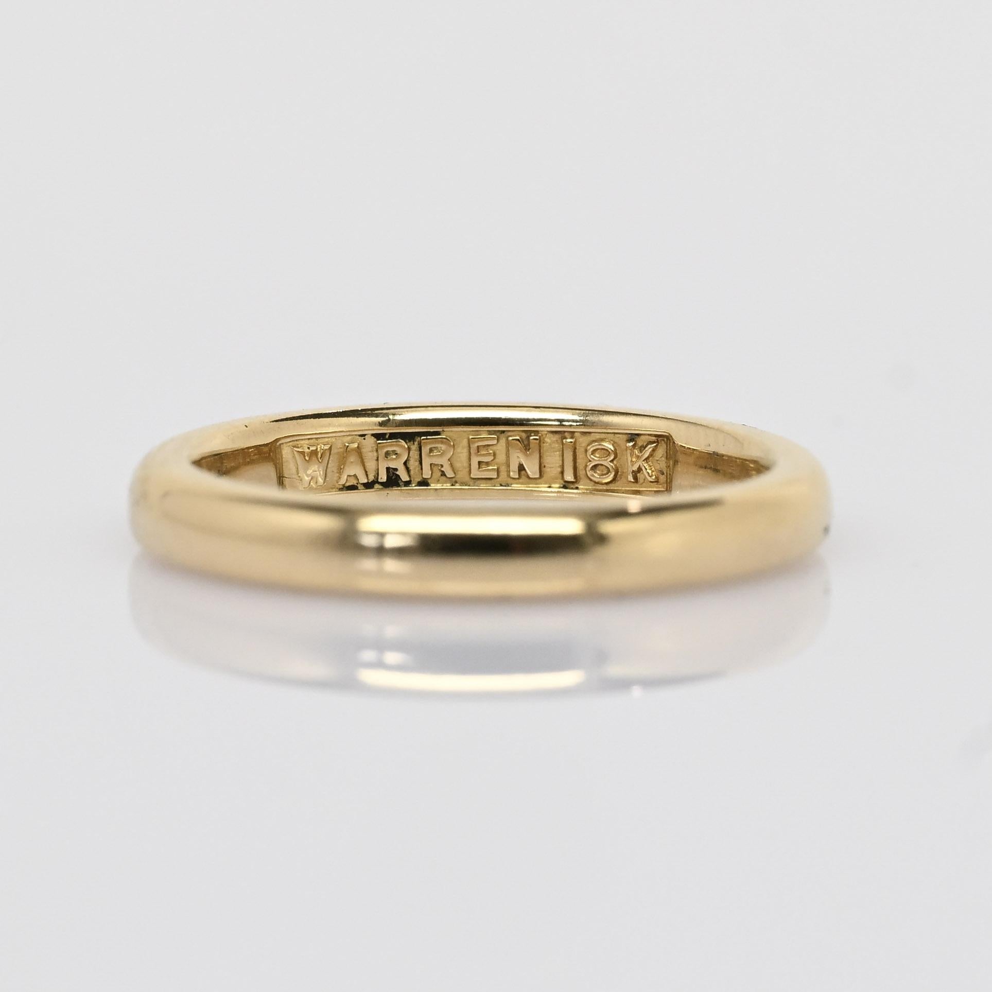 This vintage Warren wedding band is crafted in rich 18k yellow gold, offering timeless elegance and durability. Its smooth, polished surface creates a classic and understated look, perfect for everyday wear. Marked “WARREN 18K” inside the shank, it carries both authenticity and a nod to its maker’s craftsmanship. A beautiful symbol of enduring love, this band embodies simplicity and tradition.