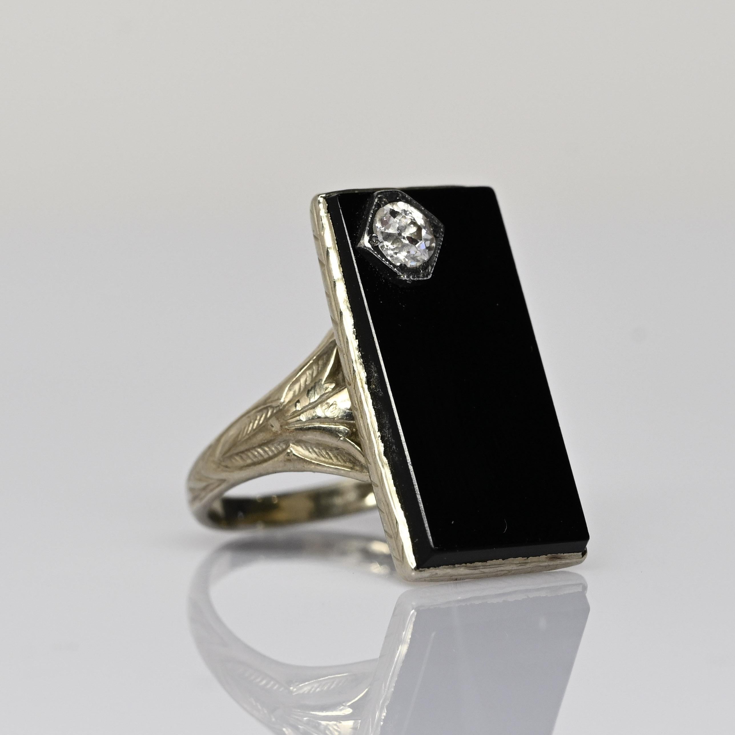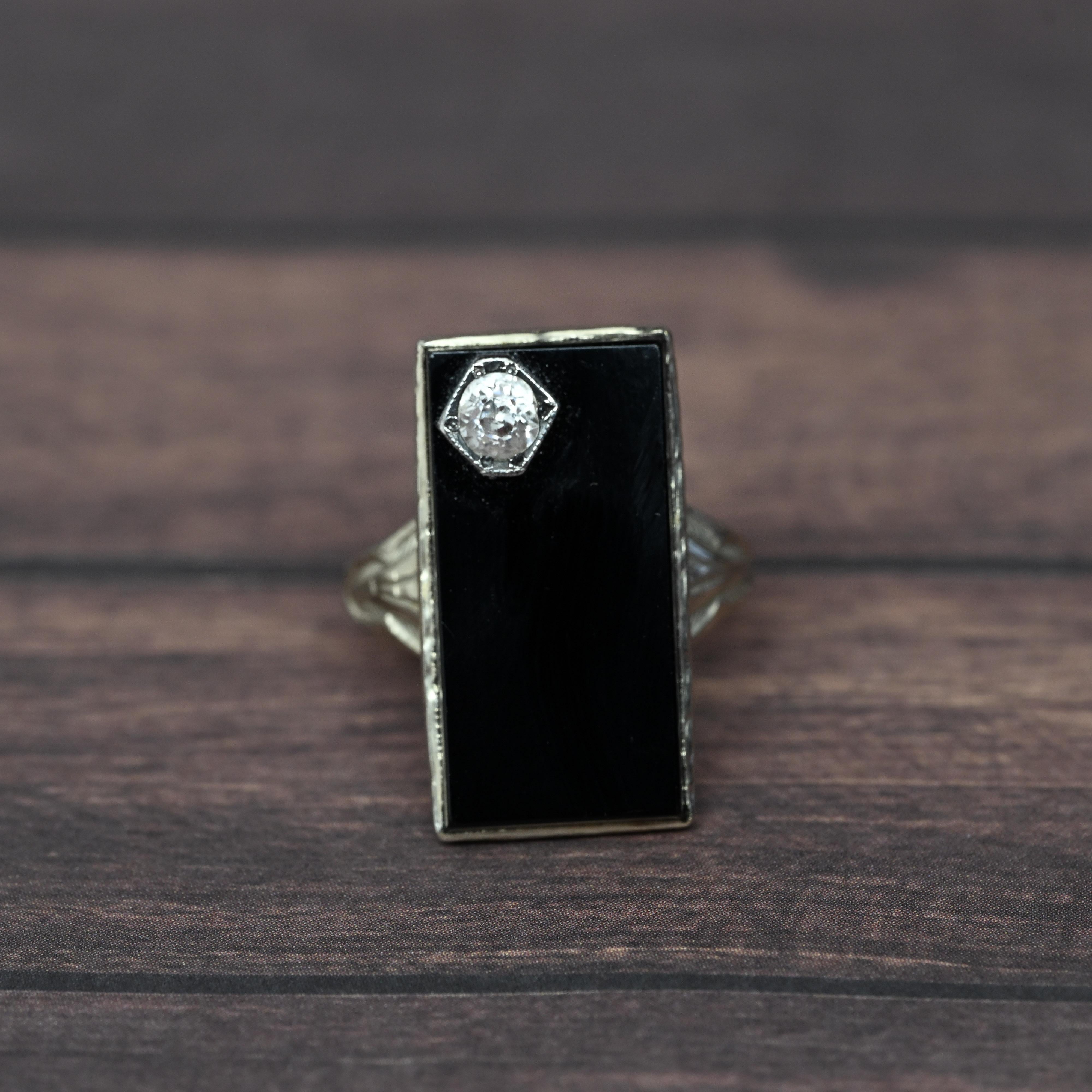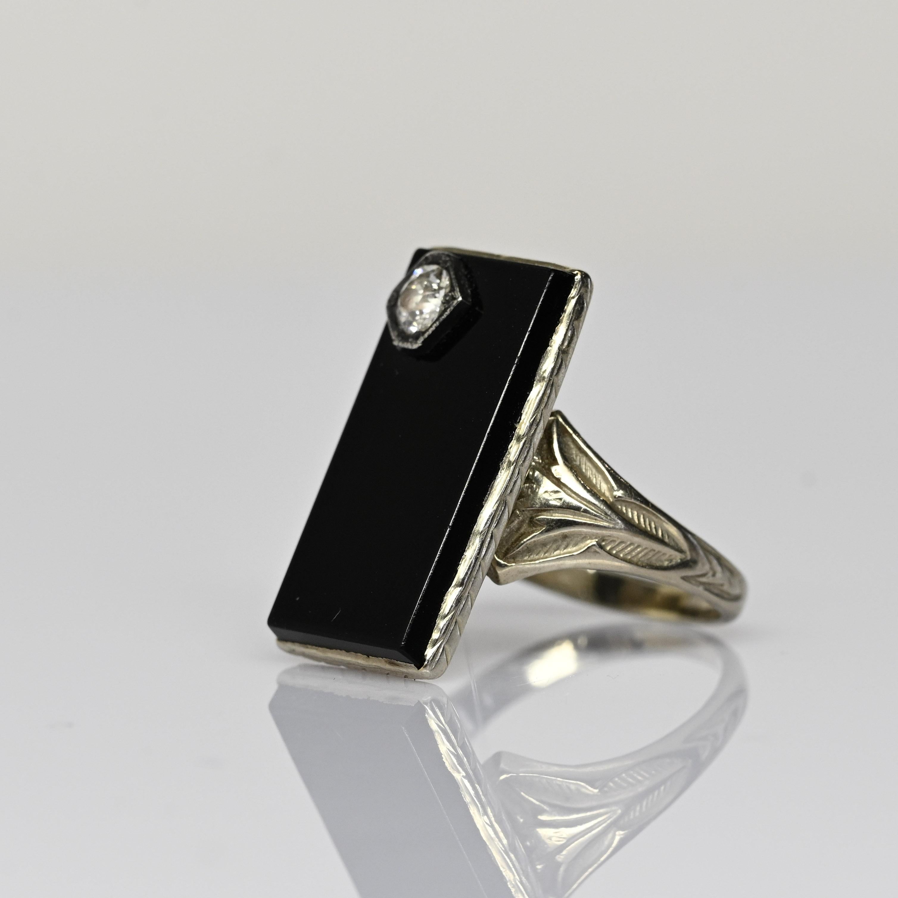 This striking antique Art Deco ring is crafted in solid 14k white gold and showcases a sleek rectangular black onyx accented by a sparkling old-cut diamond. The bold geometric design and high-contrast black and white palette are iconic of the 1920s Art Deco era. Polished onyx creates a dramatic backdrop that allows the diamond to shine with timeless elegance. Perfect as a unique engagement ring, statement ring, or heirloom gift, this authentic vintage piece offers classic sophistication and enduring style.