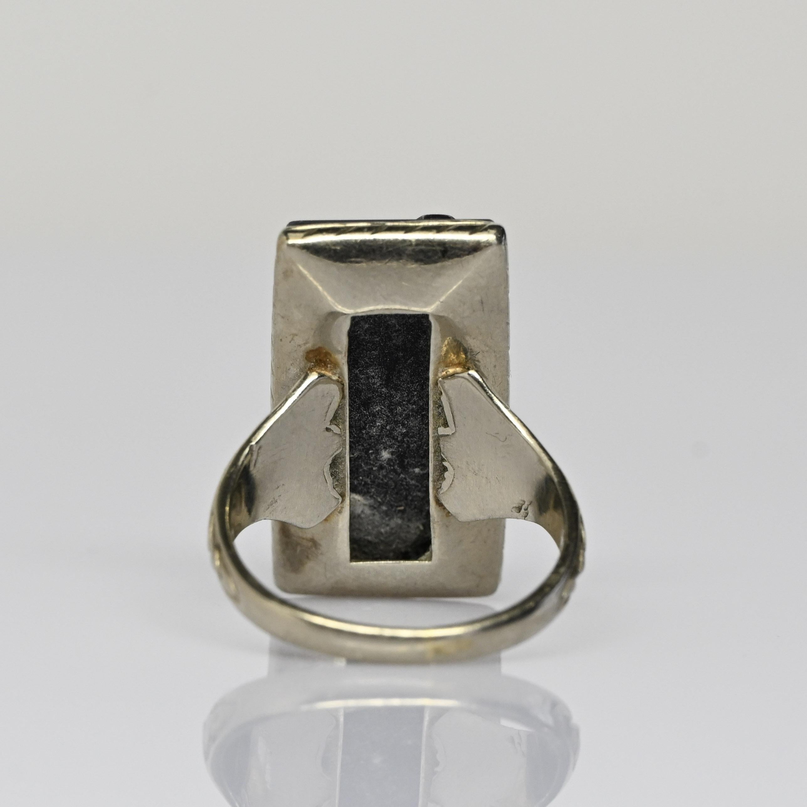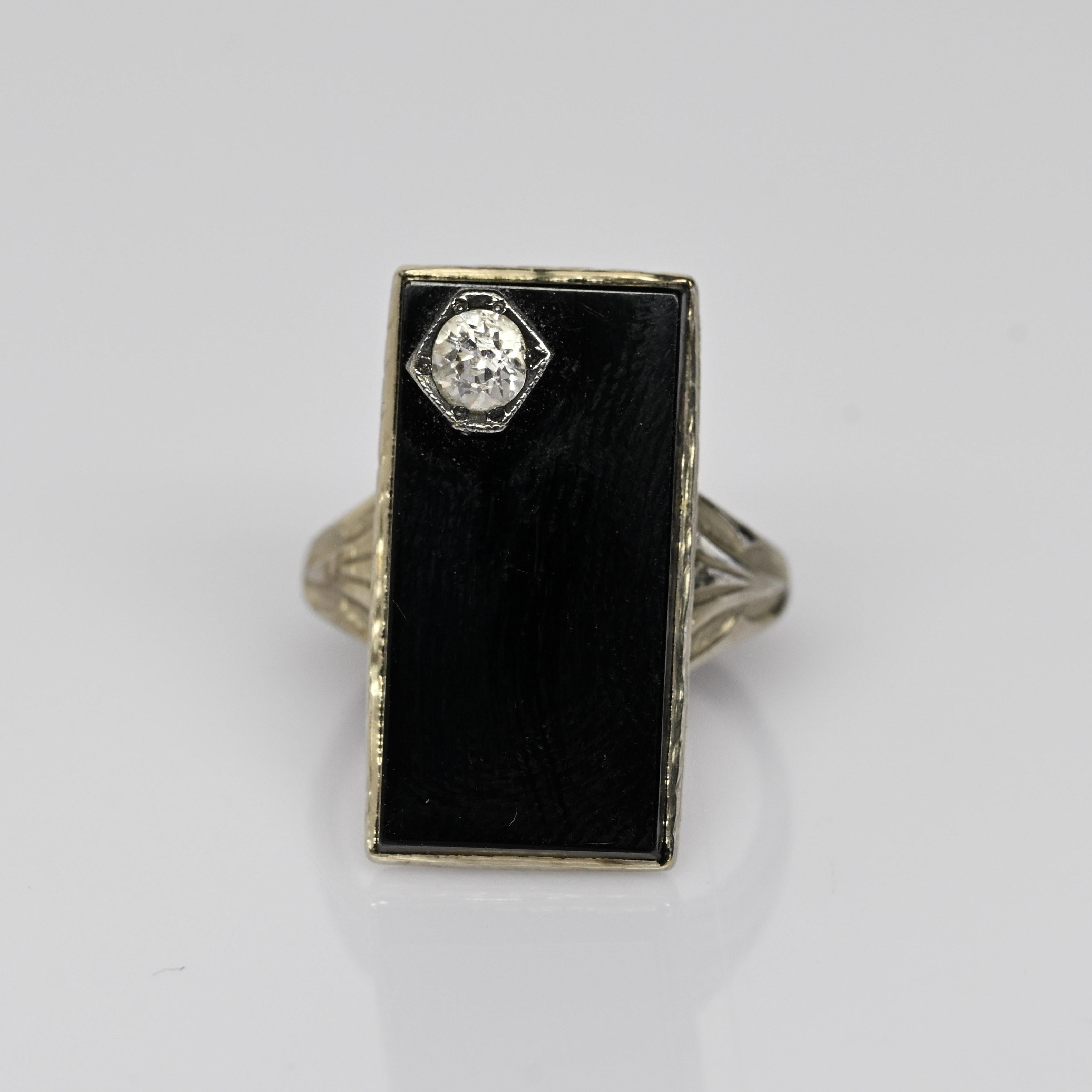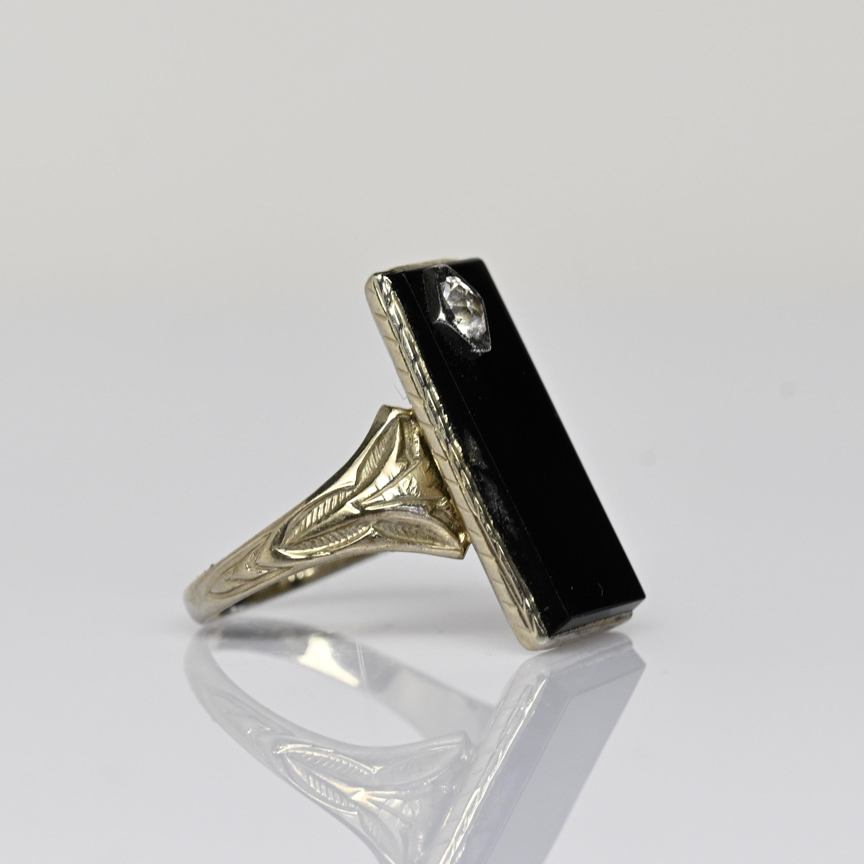 This striking antique Art Deco ring is crafted in solid 14k white gold and showcases a sleek rectangular black onyx accented by a sparkling old-cut diamond. The bold geometric design and high-contrast black and white palette are iconic of the 1920s Art Deco era. Polished onyx creates a dramatic backdrop that allows the diamond to shine with timeless elegance. Perfect as a unique engagement ring, statement ring, or heirloom gift, this authentic vintage piece offers classic sophistication and enduring style.
