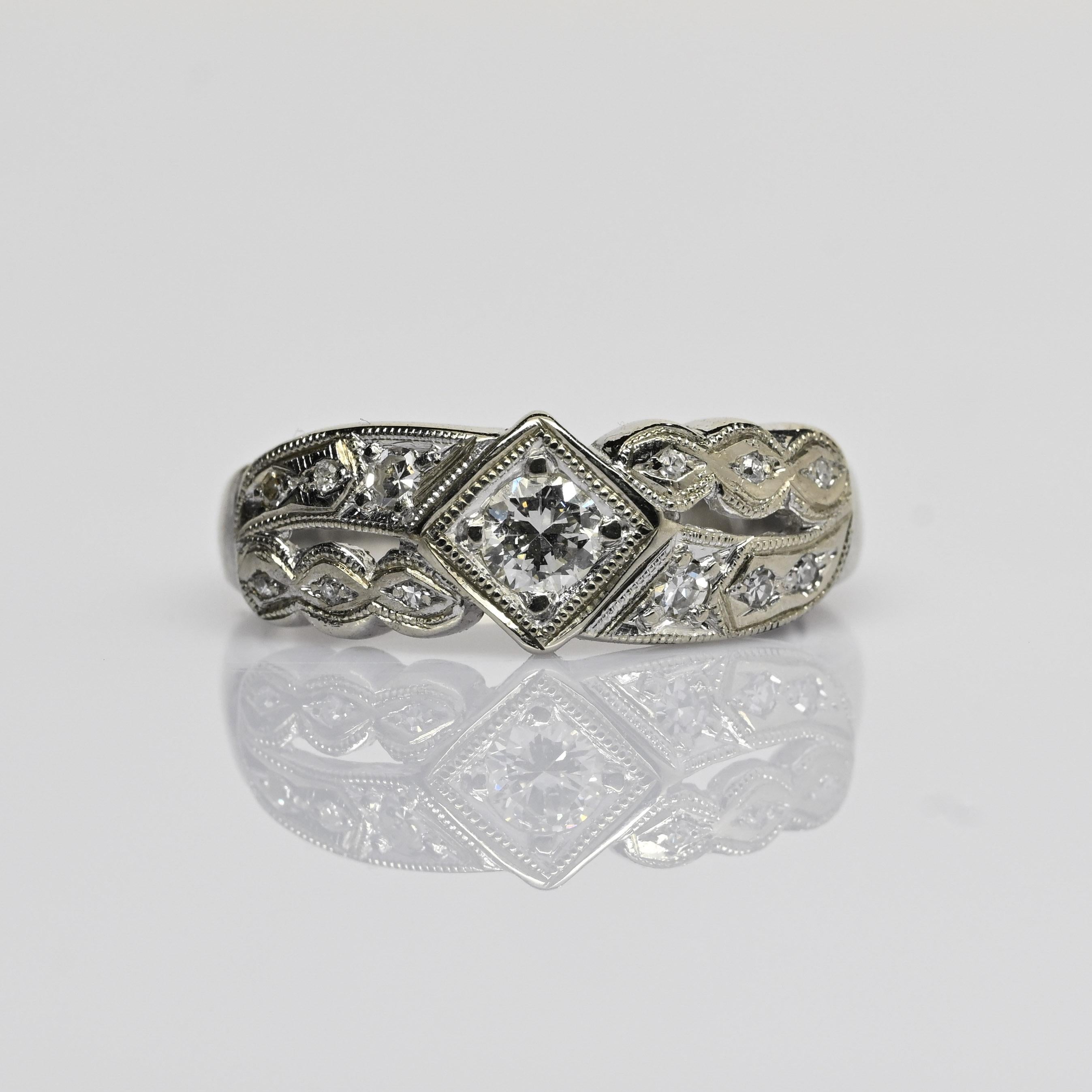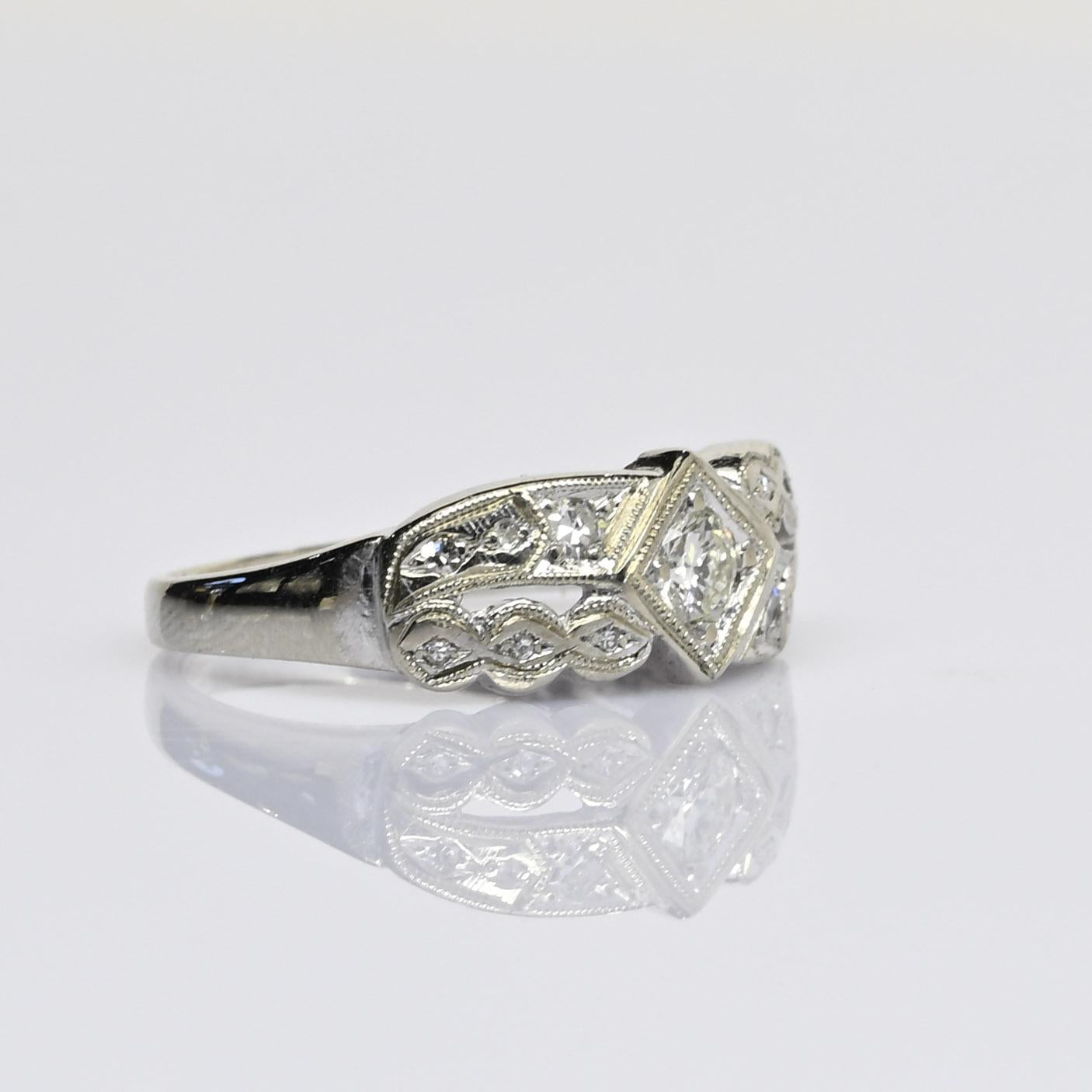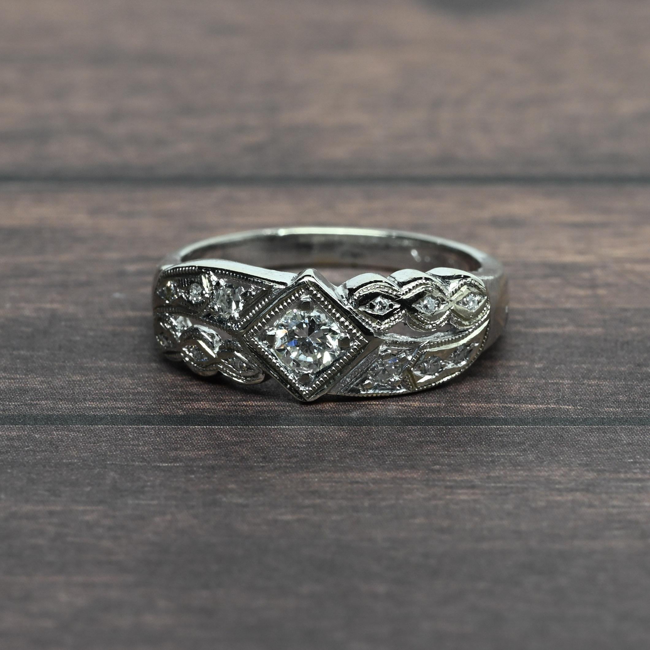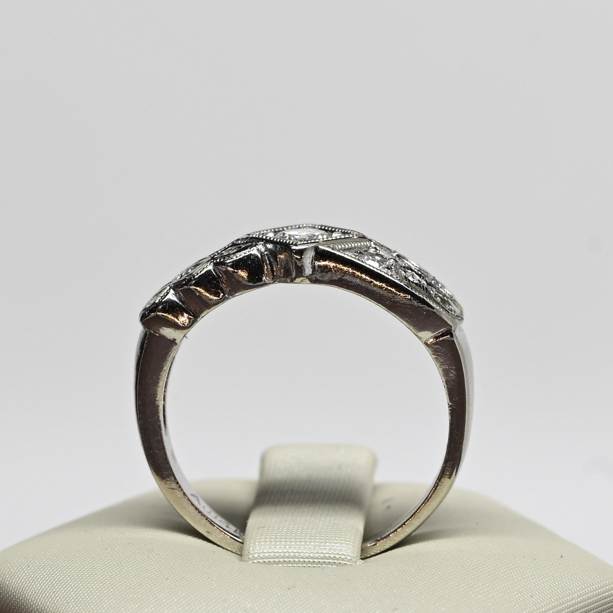 This stunning Retro-era diamond band is crafted in 14k white gold and features intricate milgrain and geometric detailing. Sparkling diamonds are set in a mix of round and square frames, creating a captivating blend of symmetry and vintage charm. The design showcases the craftsmanship and bold elegance characteristic of the mid-20th century. Perfect as a statement band or anniversary ring, it embodies timeless beauty and sophistication.