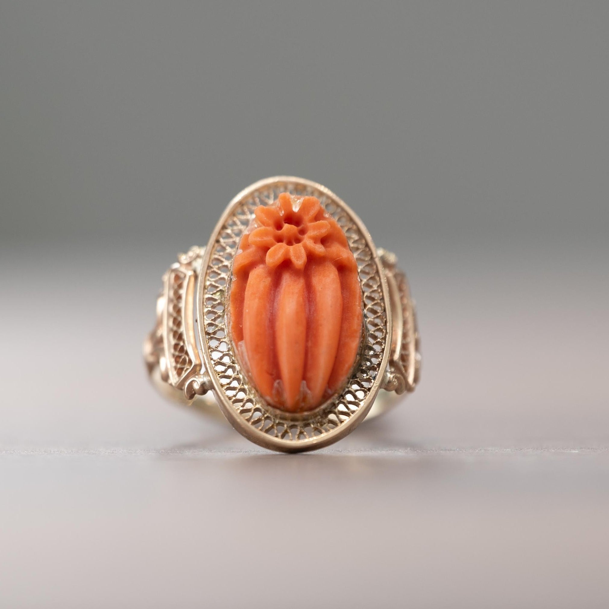 This exquisite vintage Victorian ring showcases a beautifully carved coral centerpiece in the shape of a delicate cactus blossom. Set in warm 10k rose gold, the intricate filigree detailing around the oval frame enhances its antique charm and craftsmanship. The coral's rich, natural orange hue contrasts beautifully against the soft glow of the rose gold, making it a truly unique and eye-catching piece.