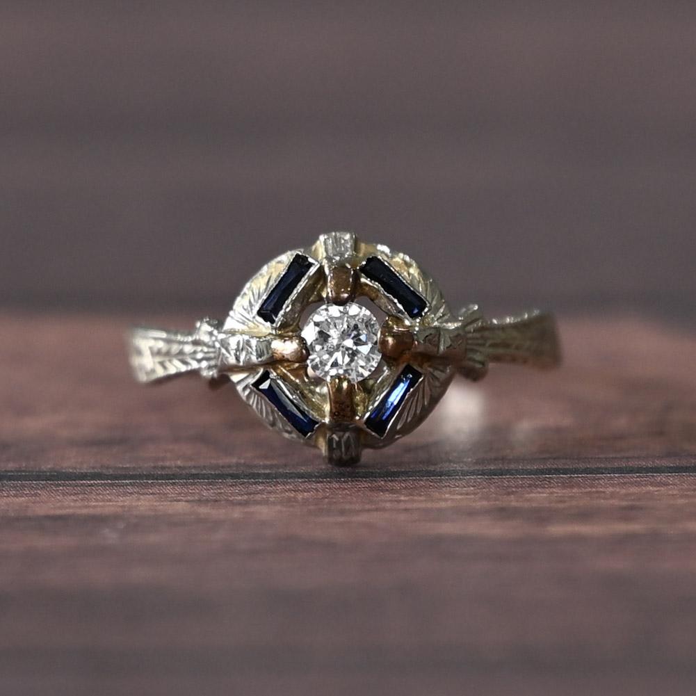 This charming vintage ring features a sparkling round diamond at its center, accented by four deep blue sapphire baguettes arranged in a geometric Art Deco-inspired design. The two-tone metal setting is adorned with intricate hand-engraved details, adding character and texture to the piece. With its unique design and classic elegance, this ring is a perfect blend of vintage charm and refined style.