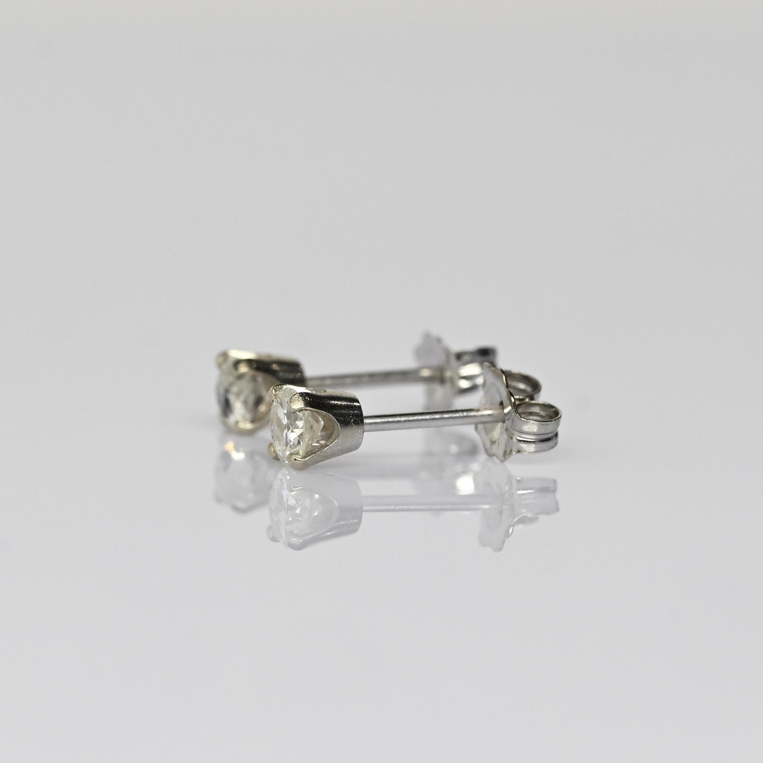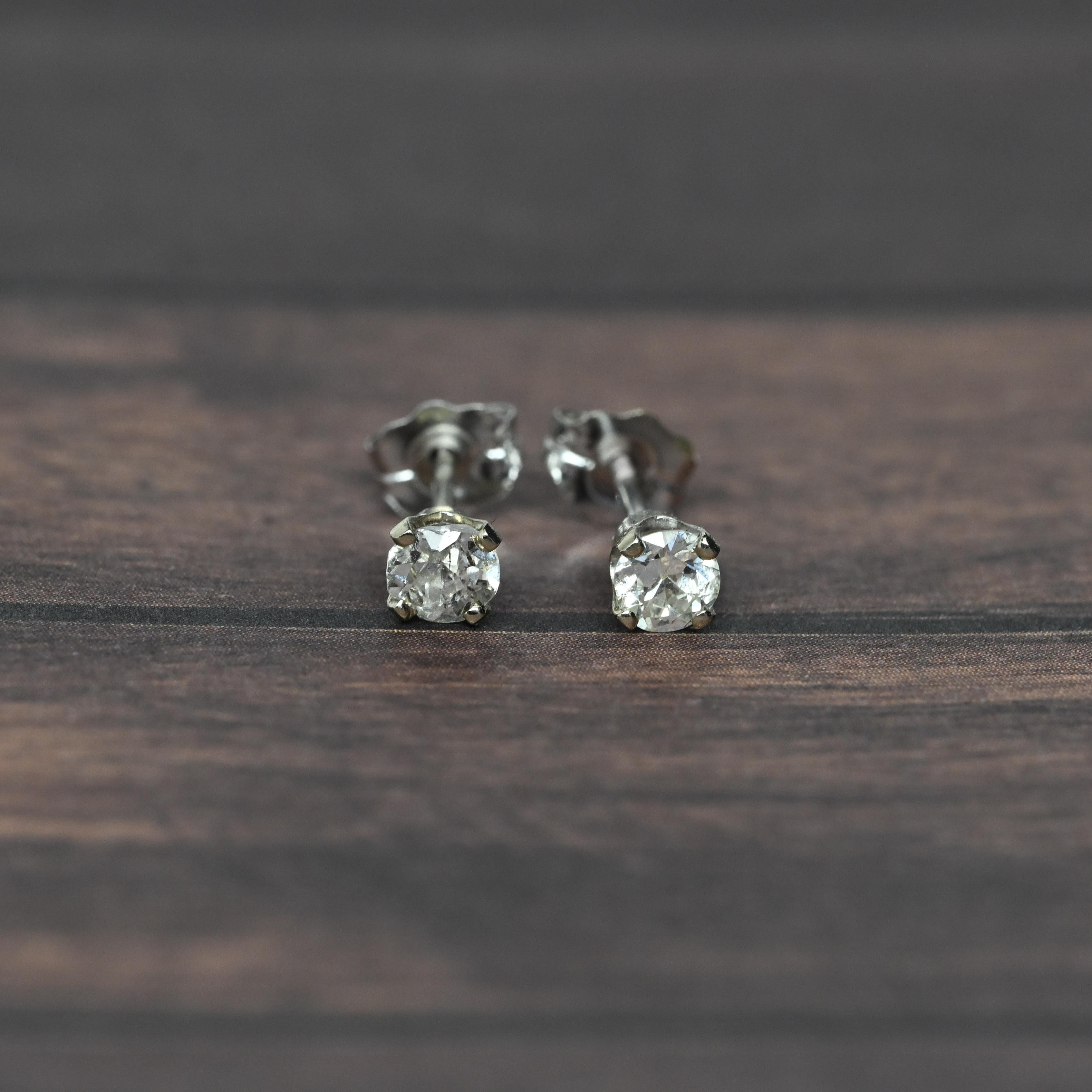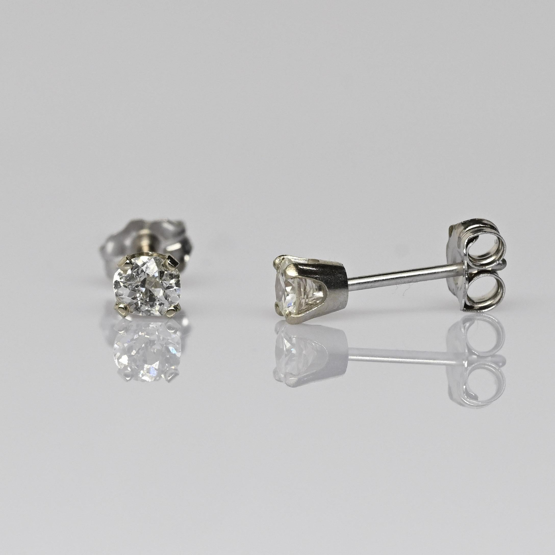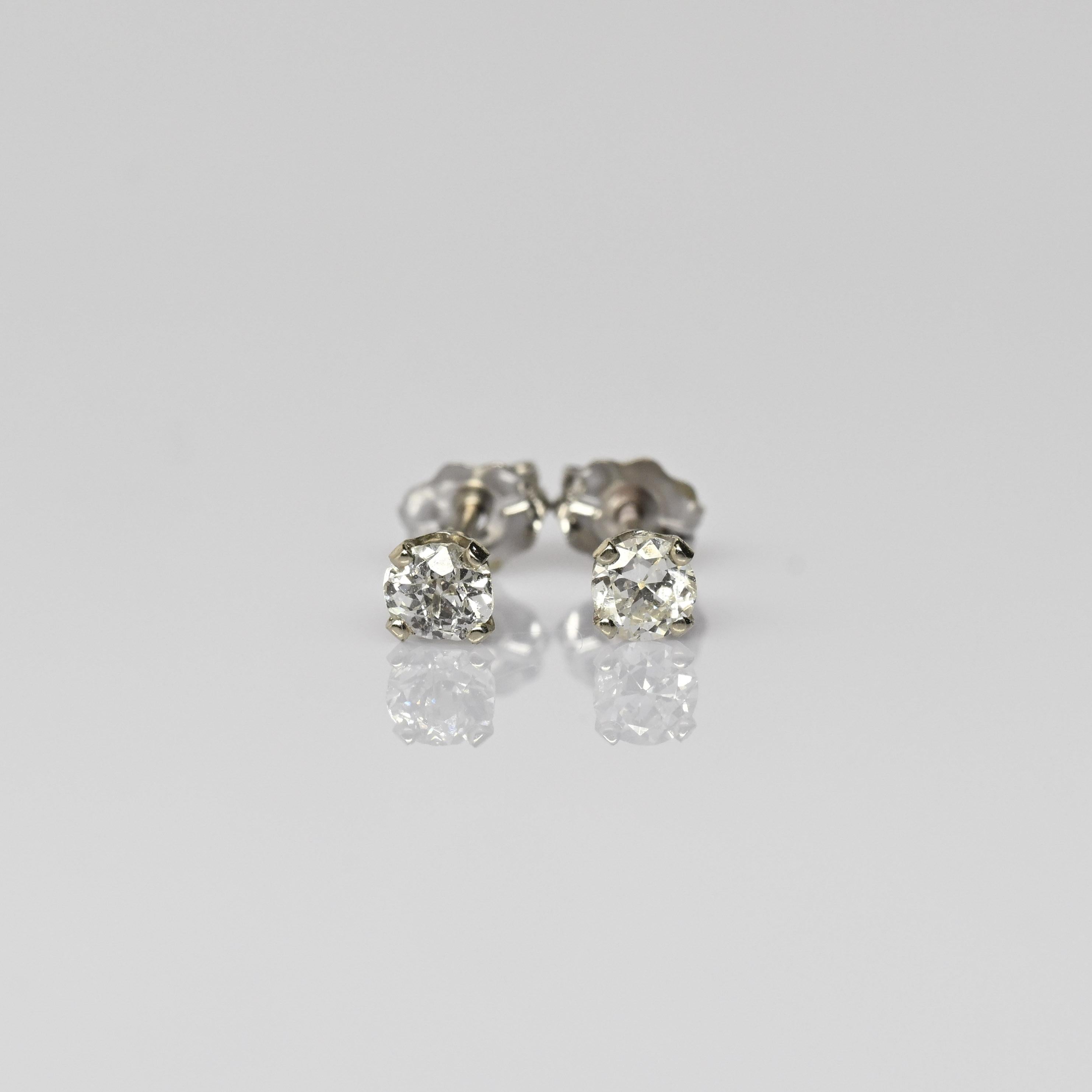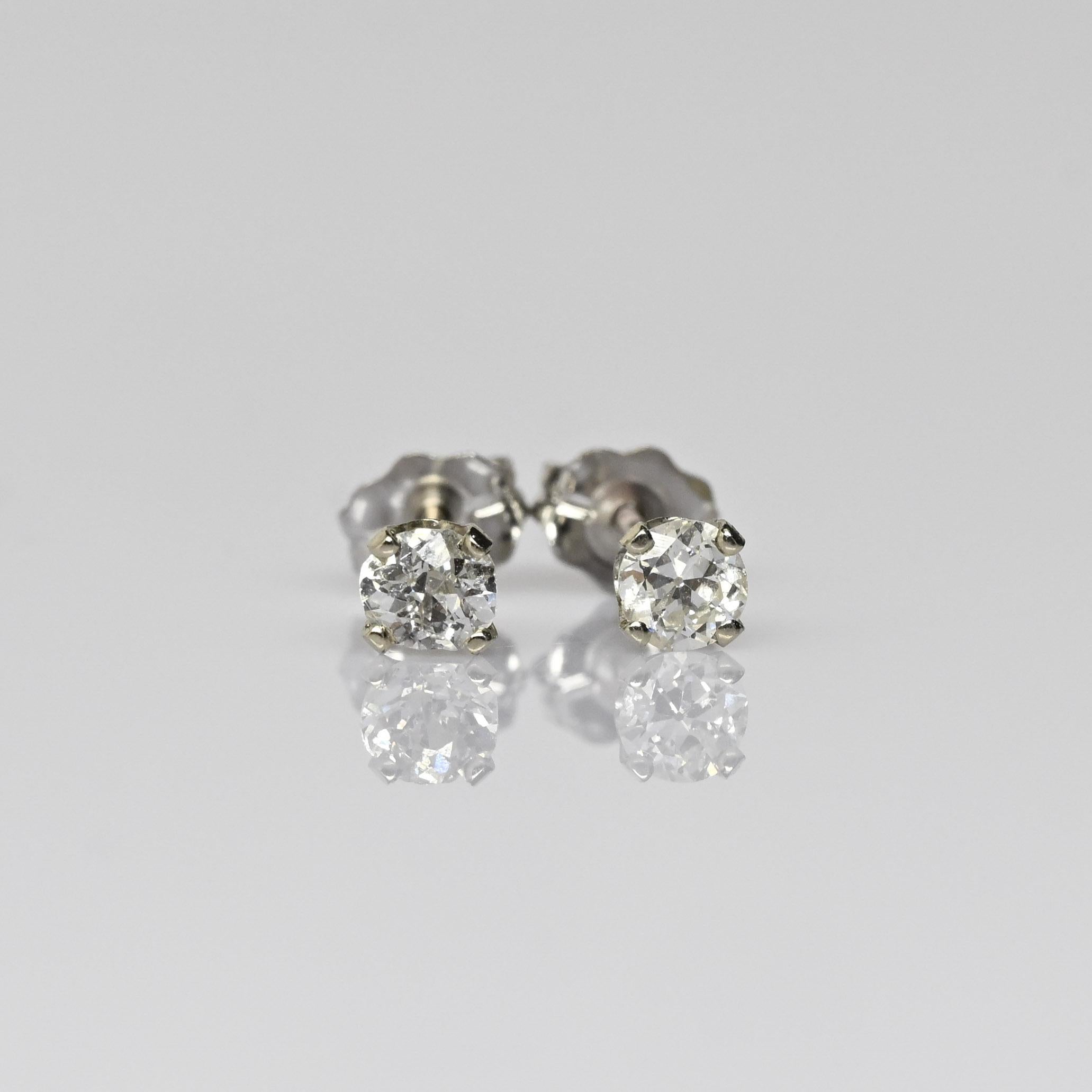These vintage 14K white gold stud earrings feature approximately 0.35 carats of natural Old European Cut diamonds, beloved for their soft, romantic sparkle and distinctive antique faceting. Each diamond displays the charming character of early hand-cut craftsmanship, with tall crowns and open culets that catch the light beautifully. The stones are set in classic four-prong baskets, offering a timeless and elegant look that sits comfortably on the ear. Perfect for everyday wear or gifting, these earrings bring a touch of vintage refinement to any jewelry collection.