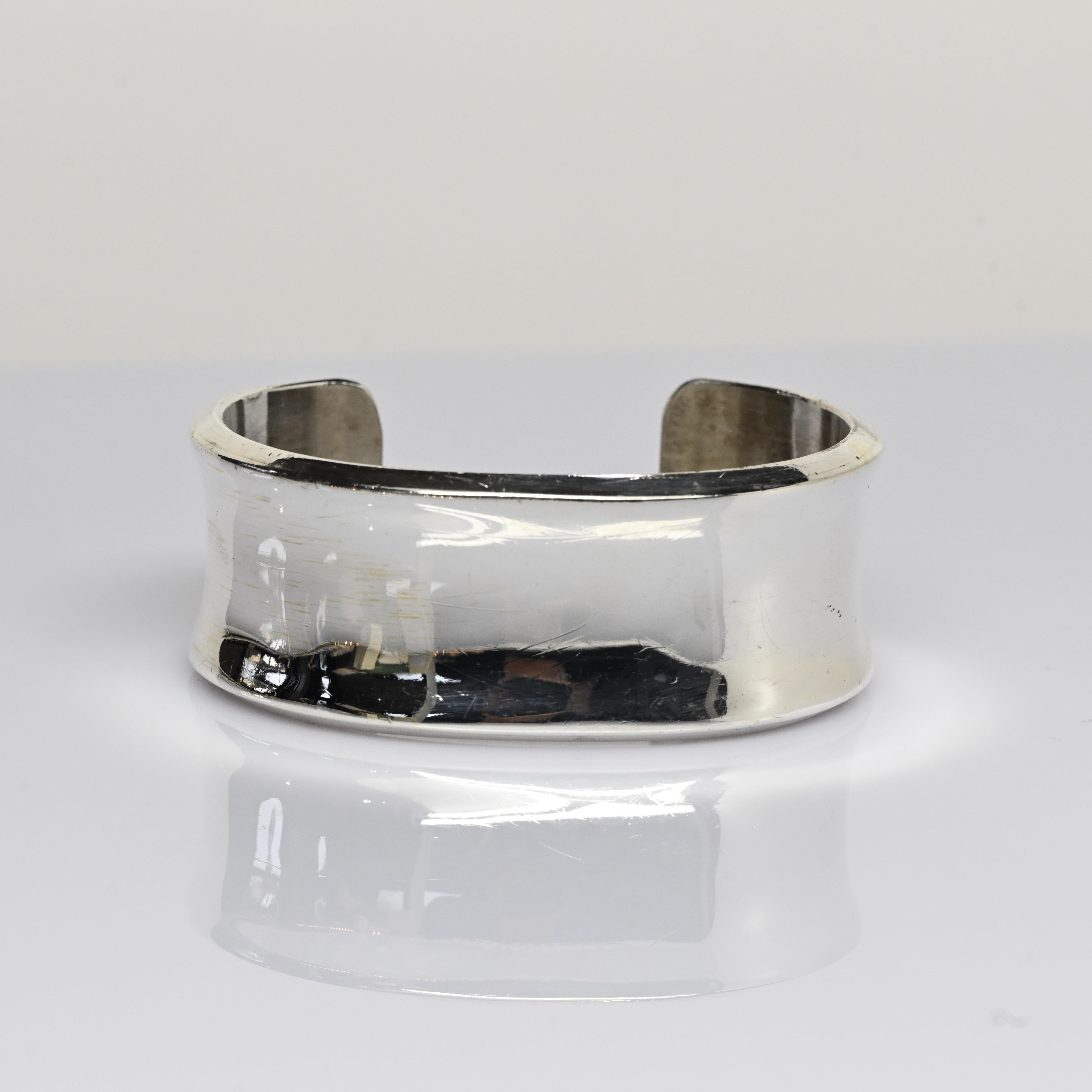 This vintage wide concave sterling silver cuff bracelet offers a bold, sculptural silhouette with its smooth, mirror-polished finish. The concave shape creates an elegant contour that hugs the wrist comfortably while adding modern dimension. Crafted in solid sterling silver and signed TS, it reflects quality artisan workmanship and timeless style. A striking standalone statement, this cuff elevates any look with effortless sophistication.